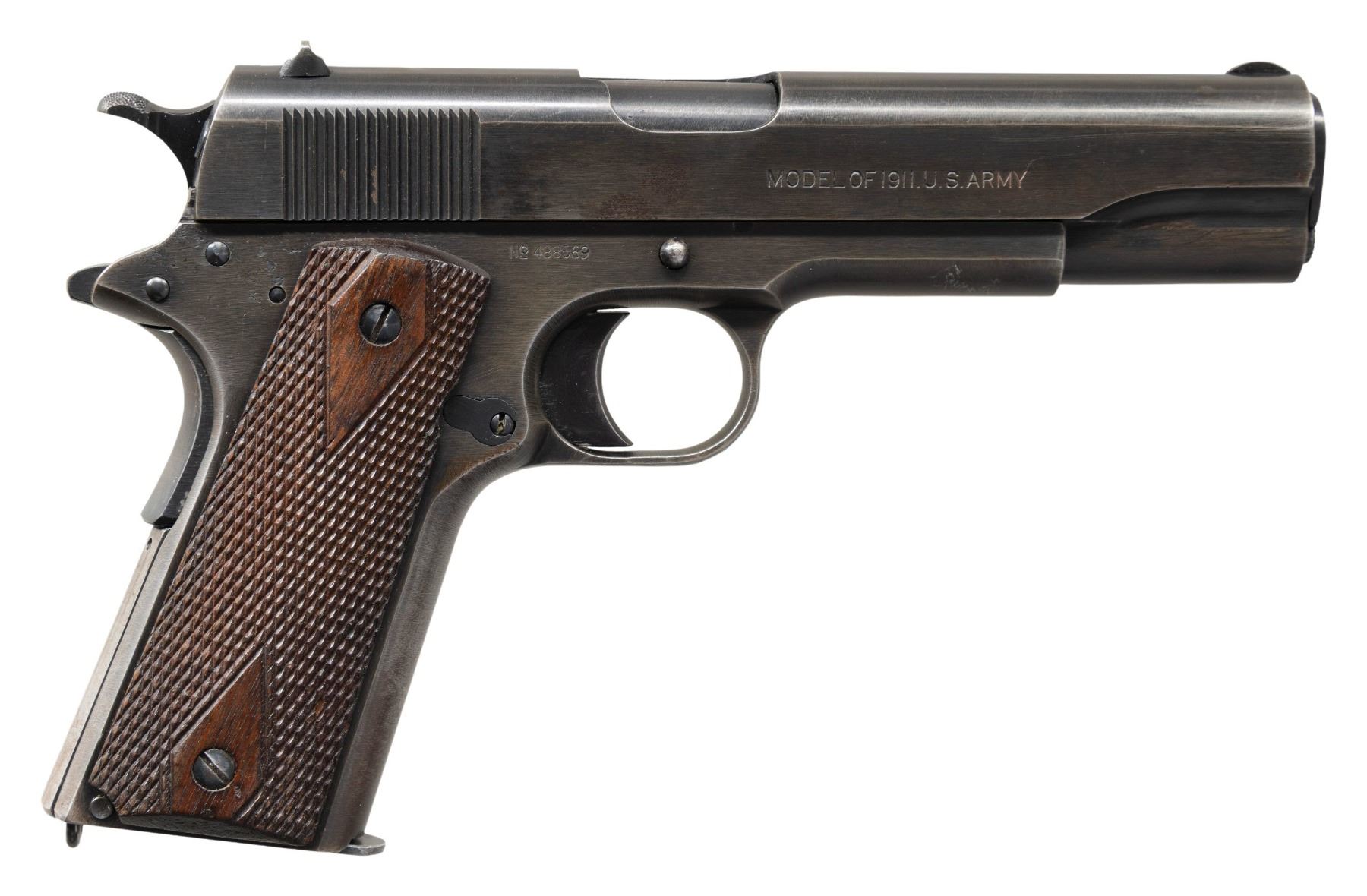 Cal. 45 ACP. S# 488569. Mfg. 1918 w/in S# range 223,601-580,600. Appears to have all correct era parts including "Black Army" rough blue finish, 5" Colt Type 5 barrel & double diamond checkered walnut grips. MAGS: 1 two tone 7 rd. with good blue showing wear. CONDITION: large areas of slide & frame show cleaning of prior pitting along with cold blue refinish along with faded original rough blue finish; greater proportion of original finish on top of slide. Good grip finish with some flattened diamonds & sm. gouges. Good original blue on barrel with lightly worn rifling & spots of light pitting. (25-5448/MD). CURIO. $1,200-1,800.