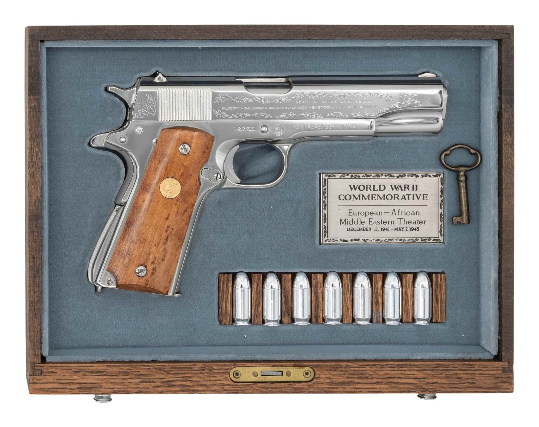 Cal. 45 ACP. S# 187ETO. Bbl. 5". Standard GI style sights. 1970 made pistol commemorating the European Theater in WW2. Nickel finish with leaf engraving & several battle names. Smooth hardwood grips with gold rampant Colt medallions. MAGS: 1-7 rd. nickel. UNATTACHED ACCESSORIES: display case with 7 dummy cartridges & key. CONDITION: all aspects near excellent with some minor handling wear. (25-6577/MJC). CURIO. $700-1,100.