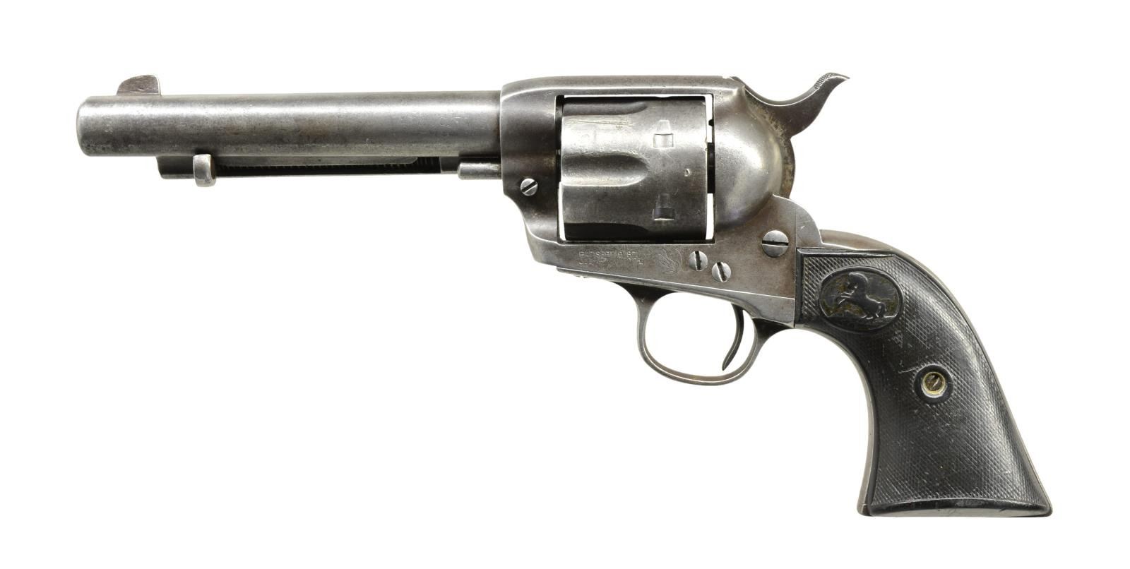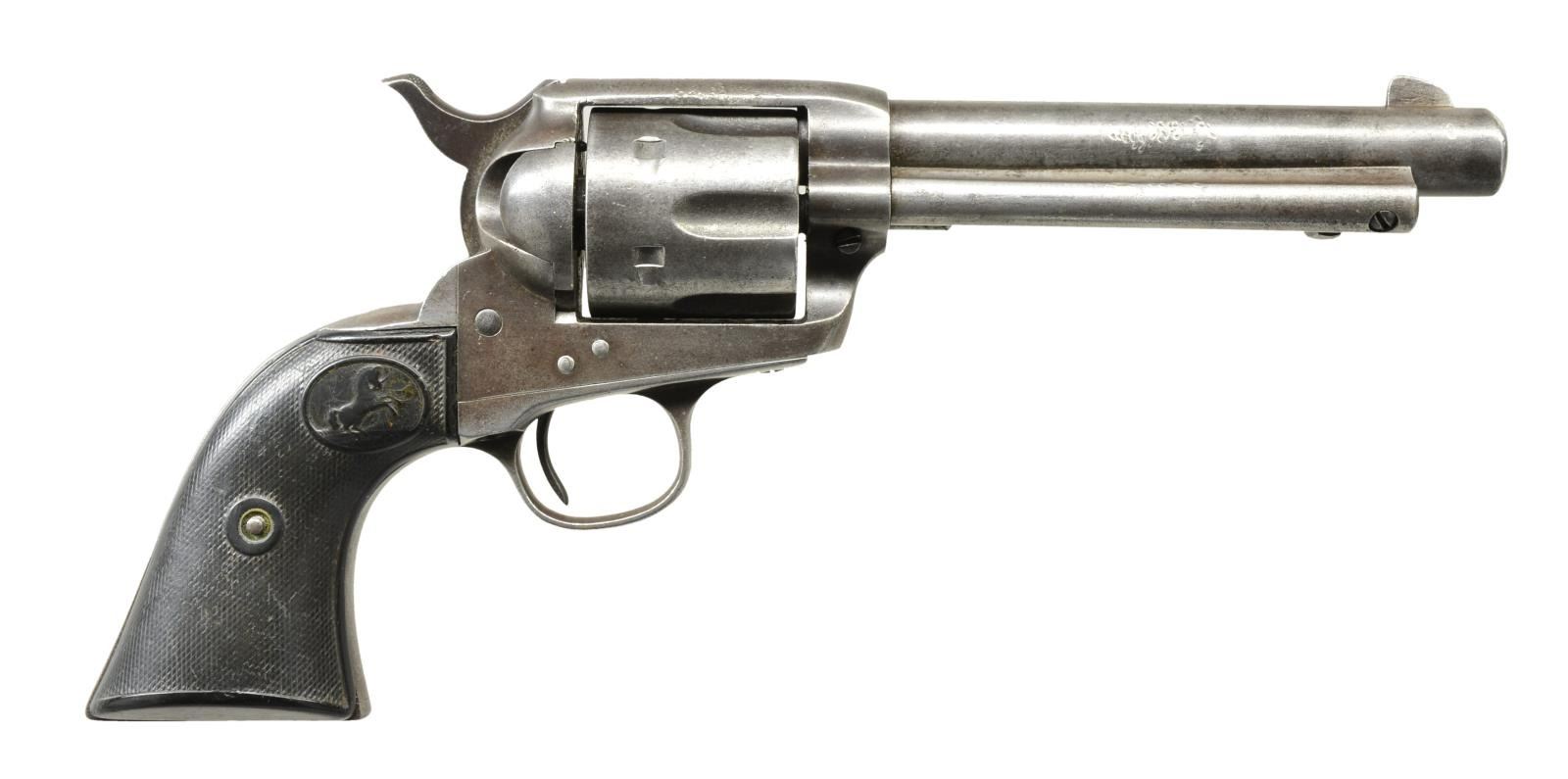 Cal. 38 WCF. S# 315153. Bbl. 5 1/2" w/ blade front sight. 6 Shot fluted cyl. Frame, trigger guard & backstrap have matching S#. 2 Piece checkered hard rubber Rampant Colt grips. 1910 Mfg. UNATTACHED ACCESSORIES: 2 - 50 rd. full boxes of Ultra-Max 38-40, 180 gr. rnd. nose. CONDITION: metal has faded gray appearance showing spots of corrosion & light pitting w/ series of light dents on right side of top strap & bbl. Grips show heavy wear. Bore has dark frosted appearance w/ light pitting & worn rifling. (21-2674/DS). CURIO. $1,000-1,500.