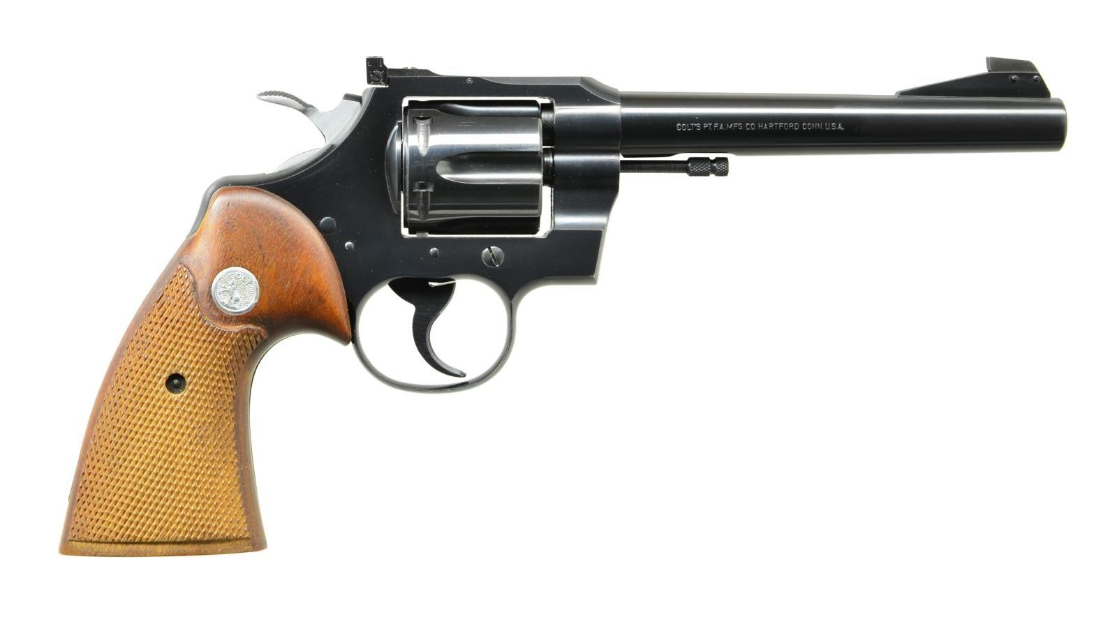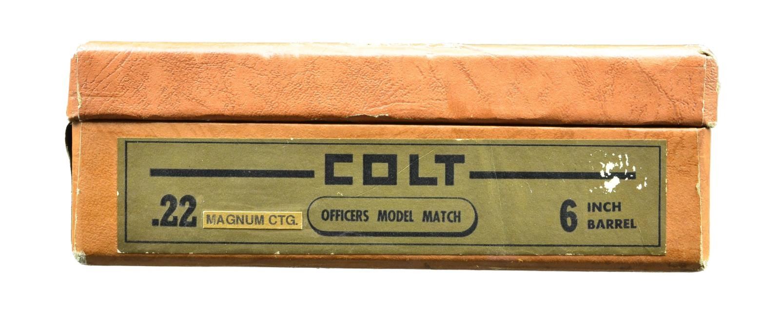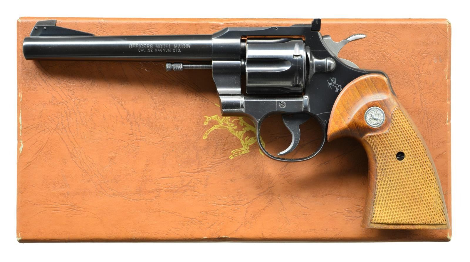 Cal. 22 Mag. S# 76049. Bbl. 6" w/ serrated ramp having Patridge blade retained w/ two pins; frame mounted Accro rear sight. Mfg. 1958 as one of only 850 in 22 Mag. cal. having double action functioning. Python style raised panel checkered walnut target grips w/ silver medallions. Wide spur Python style w/ in the white sides plus blued grooved faced trigger. UNATTACHED ACCESSORIES: very good plus brown leatherette box having "5780 MAGNUM CTG” label applied over “Long Rifle” original marking. Near excellent green interior w/ NRA membership card, Colt handling guide & blued Colt key chain screwdriver having couple of sm. oxidation spots. CONDITION: superb example in original condition w/ faint wear on ejector rod only; all other aspects near excellent including bore & grips. Great collector quality Colt target magnum. (22-1088/NW). CURIO. $2,000-3,000.