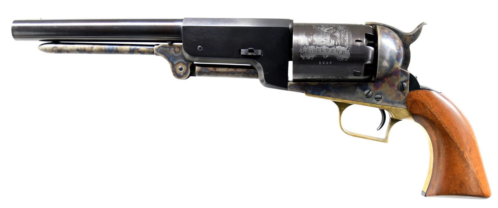 Cal. S# 153.8 Bbl. 9" rnd. w/ silver blade sight. Mfg. 1980-1982; 2920 units w/ 4 digit S#. Case colored hammer, frame, loading lever & plunger. Brass Dragoon style trigger guard & blue steel backstrap. 1 piece European walnut grip w/ smooth corners at butt & sculptured shape at frame. Long unfluted cyl. w/ oval stop cuts, marked "MODEL U.S.M.R." plus Texas Ranger & Indian scene. CONDITION: all aspects near excellent w/ unfired appearance. (01-21025/NW). ANTIQUE. $650-900.