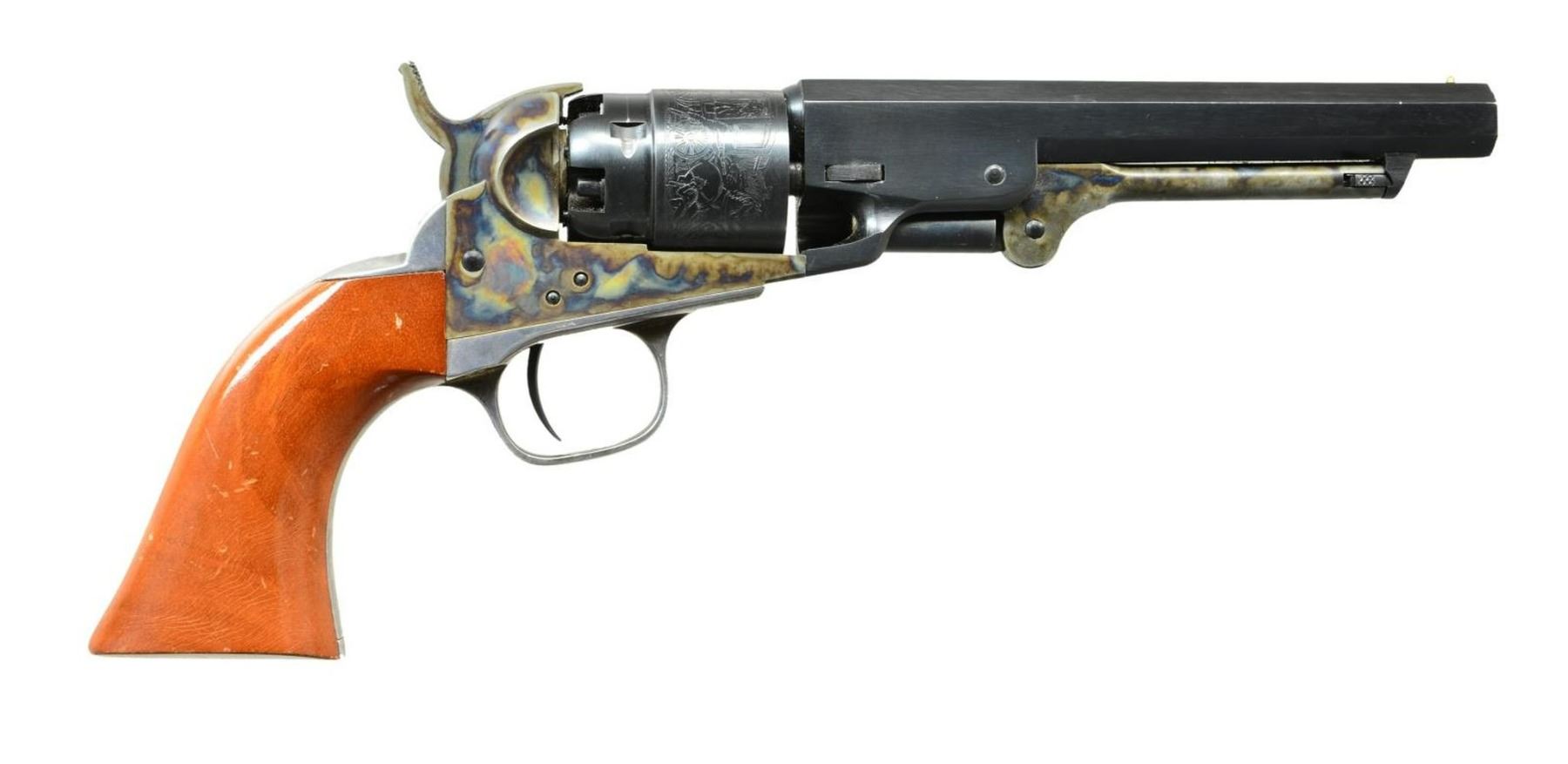 Cal. 36. S# 56079. Bbl. 5 1/2", octagon with brass bead. Mfg. 1979–1981; 5,306 units. Case-colored frame, hammer, loading lever, and plunger. Silver-plated trigger guard and backstrap with a 1-piece European hardwood grip. Balance is blued with unfluted 5th cyl. with a stagecoach scene. CONDITION: tarnished silver plating, and the grips show some light marks; balance is near-excellent, appearing unfired. (01-21020/NW). ANTIQUE. $350-500.