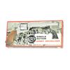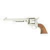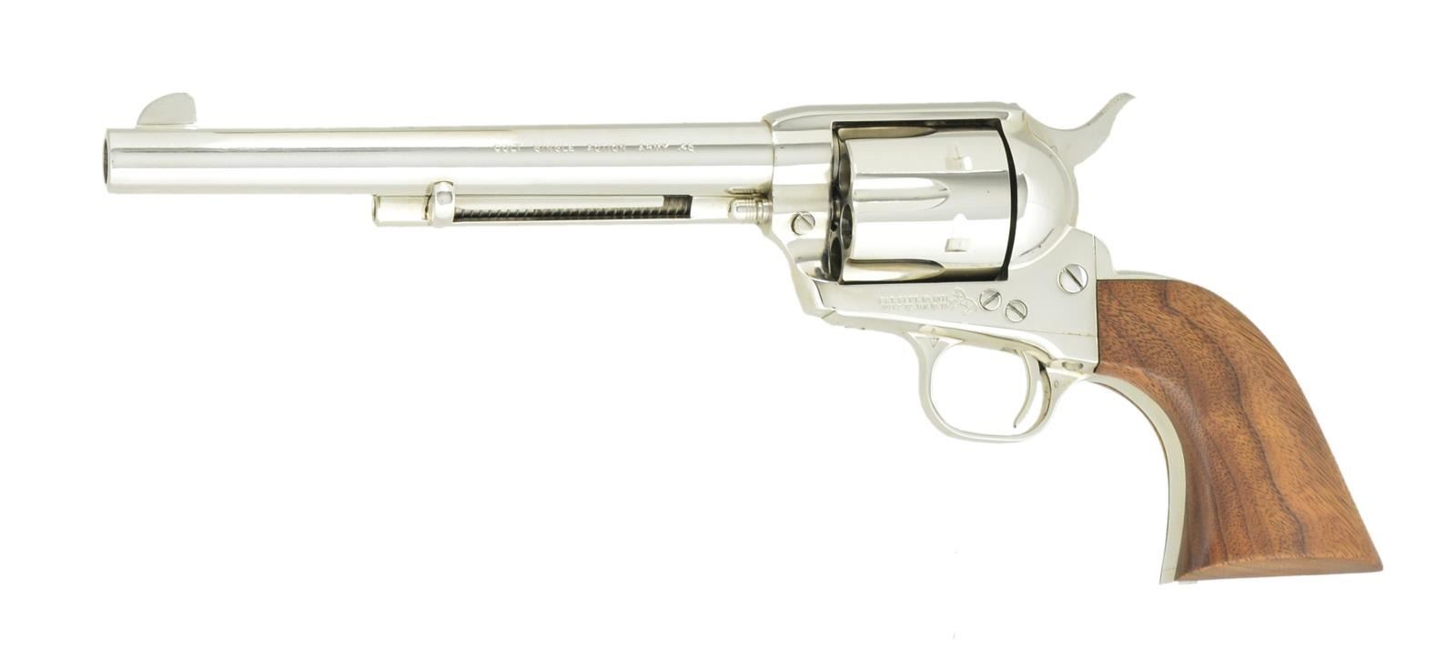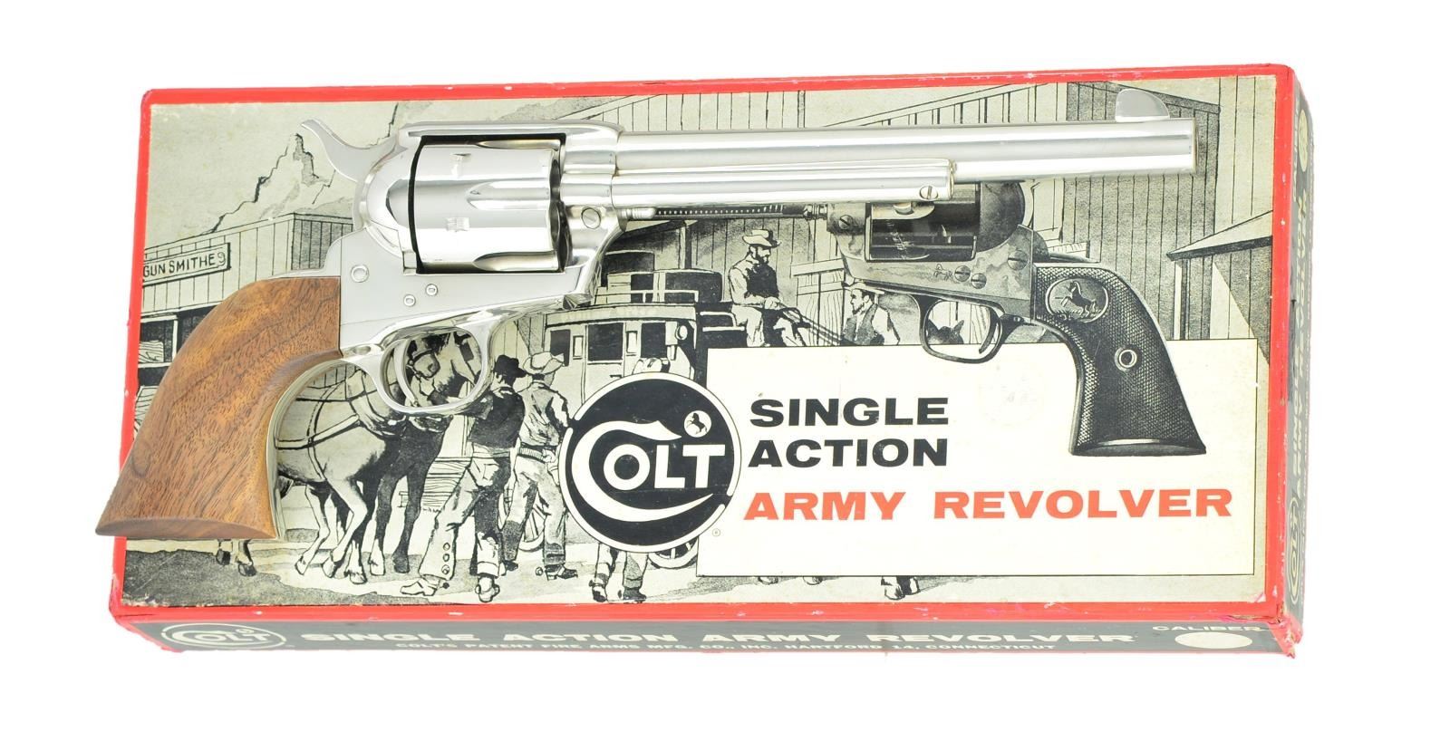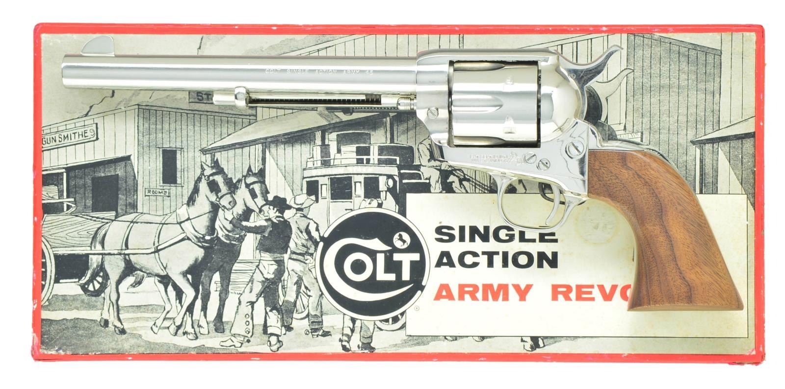 STAGECOACH BOX. Cal. 45 Colt. S# 63991SA. 7-1/2" bbl. Full nickel finish. 6-shot fluted cyl. 2-pc walnut grips. REFERENCE: page 41 of "The Post War Colt Single Action Revolver 1955-1975" by Don Wilkerson states 1,439 revolvers were mfg. in this configuration. UNATTACHED ACCESSORIES: correct 2-pc Stagecoach box inked on both ends "7-1/2 / 45 / N". Two corners of top of box is split. Colt factory letter stating the following: "Serial Number: 63991SA / Caliber: .45/C / Barrel length: 7-1/2" / Finish: Nickel / Type of stocks: not listed / Shipped to: John Jovino Company / Address: 5 Centre Market Place New York, New York / Date of Shipment: November 30, 1972 / Number of same type guns in shipment: 30". CONDITION: very good overall. Nickel has a few scattered handling marks & scratches. Light cyl. dragline. Grips near excellent. Near excellent shiny bore w/ strong rifling. (22-6033/BH). CURIO. $2,750-3,750.