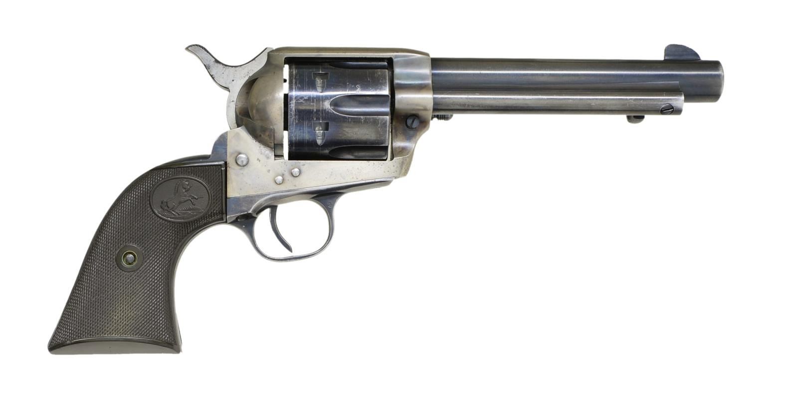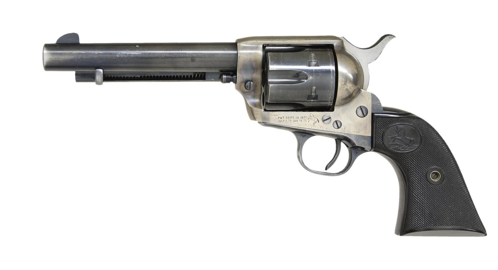 Cal. 38 Spl. S# 12633SA. Bbl. 5 1/2" w/ blade sight. 6 Shot fluted cyl. Blue finish w/ case colored frame. 2 Piece checkered hard rubber Rampant Colt grips. 1957 Mfg. CONDITION: bbl., cyl. & grip straps retain 70% lightly faded blue showing carry & edge wear. Frame retains nicely visible case colors in protected areas fading to gray & showing sm. spots of corrosion. Very good grips. Bore is bright w/ strong rifling. (21-14/DS). CURIO. $1,000-1,500.