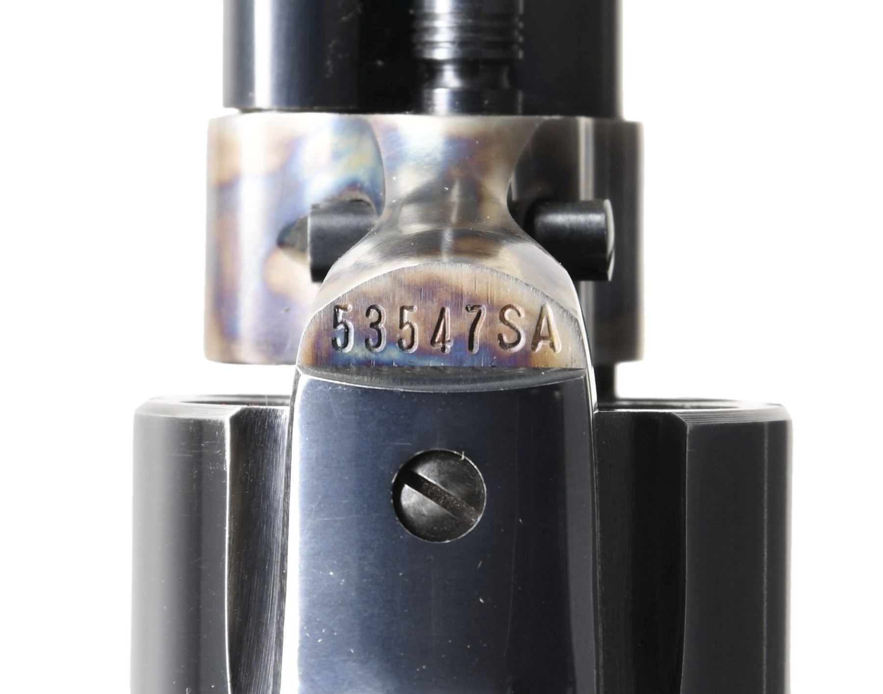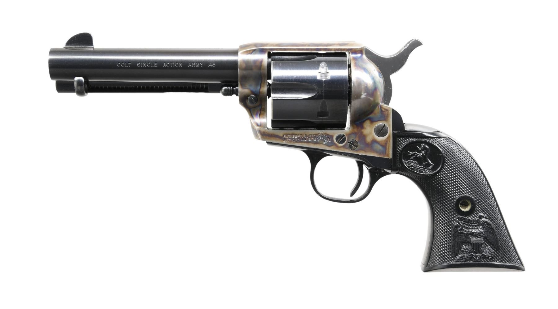 Cal. 45 Colt. S# 53547SA. Bbl. 4 3/4". Blue & case colored finish. 1 piece checkered hard rubber eagle grips. Mfg. 1970. CONDITION: near excellent retaining over 98% blue & case colored finish. Cyl. shows a light drag line. Bright near excellent bore. (24-4199/DS). CURIO. $2,000-3,000.