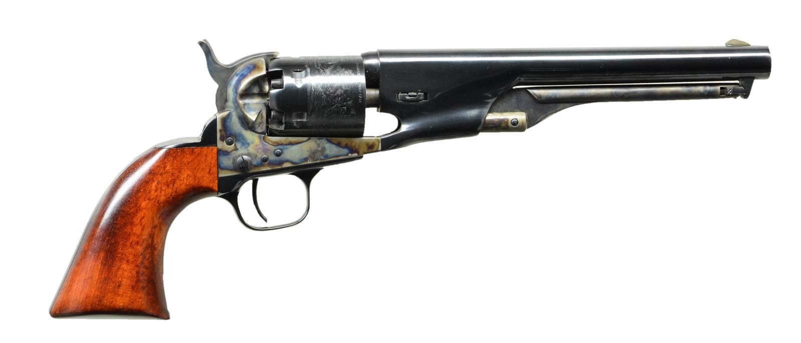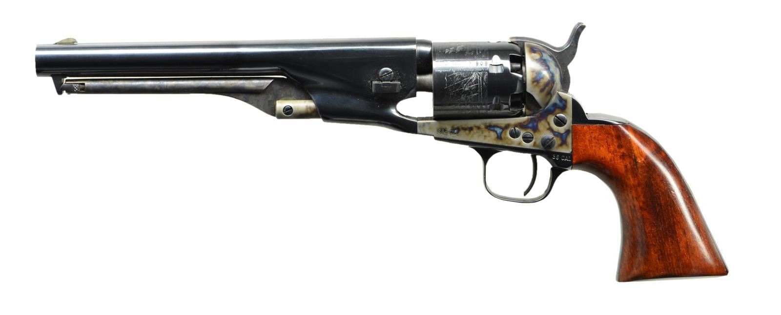 Cal. 36. S# 43909. Rnd. 7 1/2" bbl. w/ blade front sight. 6 Shot rnd. cyl. w/ Naval scene roll engraving. Blue finished bbl., cyl., grip straps & trigger. Case colored frame, hammer & loading lever assembly. Back strap has gold filled "Sam Colt" signature. 1 piece walnut grip. Matching numbered cyl., bbl., & grip straps. CONDITION: very good overall w/ pinprick oxidation, light handling marks & cyl. turn line. Very good bore. (01-20401/MD). ANTIQUE. $300-500.
