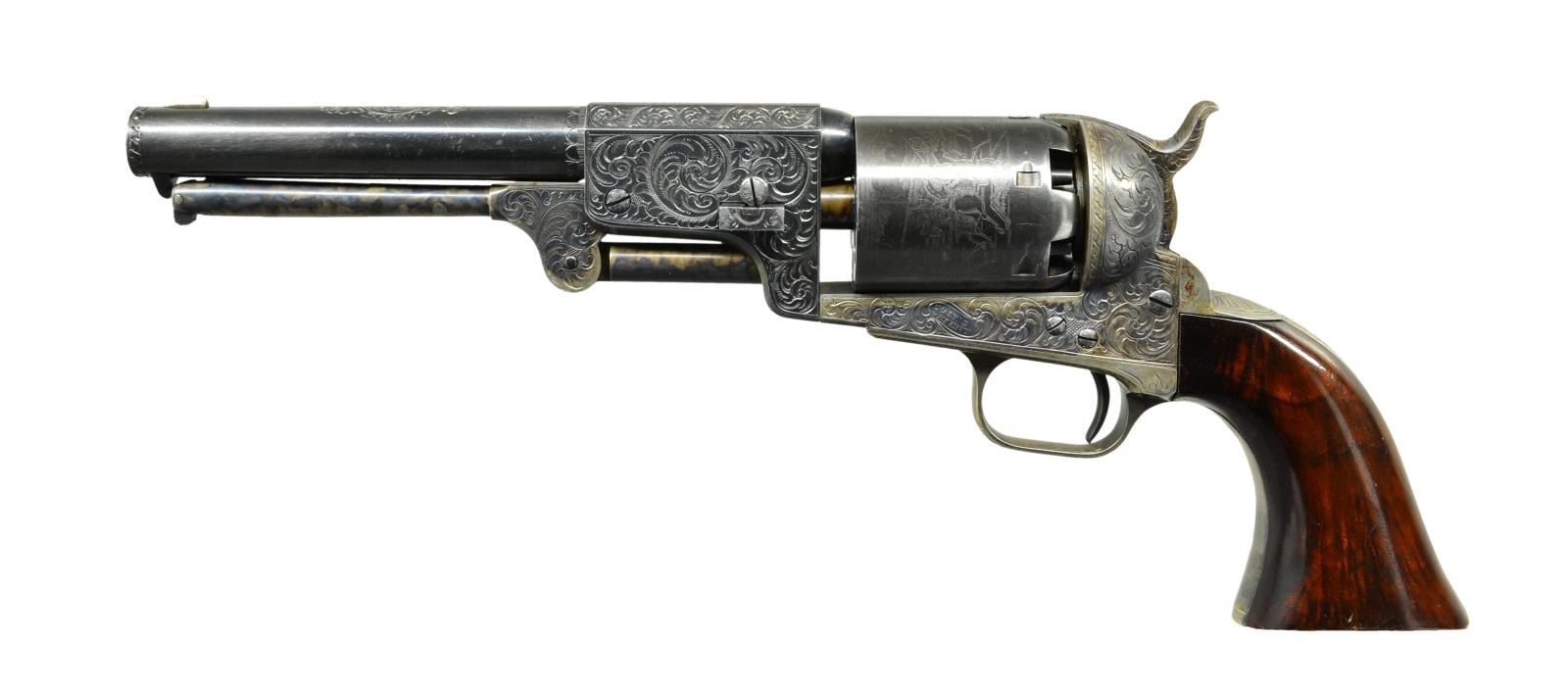 ENGRAVED REVOLVER. Cal. 44. S# 12406. Bbl. 6 1/2" part round with octagon shank. 6 Shot round cylinder with Texas Ranger scene roll engraving. Frame, bbl., grip straps and loading lever have "Donut Scroll" engraving with wolf’s head engraving on the hammer. "Colt Engraving" by R. L. Wilson on page 36 states the following "comparison with some Dragoon specimens in the range from number 12365 to 12410 reveals differences in scroll placements, but an identical scroll style". On page 22 he says "Number three of the early styles of Colt Hartford engraving is known as the "donut scroll". This is a dramatic departure from the vine style, and contrasts strongly with the "exhibition grade" and the new style which would be introduced by Gustav Young in 1852. No records identify the craftsman responsible for introducing the donut scroll, but judging from the study of revolvers bearing the style, its life was brief, C. 1851-52". On page 36 and 37 consecutive serial numbered revolver 12405 is pictured with its unmistakably similar engraving. This beautiful revolver is custom engraved in factory style. Blue and case colored finish with silver finished grip straps. One piece grips of burl Walnut. Bbl., frame, grip straps, cylinder, loading lever and wedge have matching numbers. On the bbl., frame and grip straps a period is located above or below the serial number. Right side of trigger guard at rear is stamped “R”. Back of cylinder stamped “H”. 1852 Mfg. CONDITION: near excellent as refinished. Bbl. has over 85% blue showing edge wear, spots of fading and small handling marks. Cylinder has unusually strong scene, the blue shows wear and fading. Frame and loading lever have 90% case colors showing fading on high points. Grip straps retain nearly all silver finish exhibiting an attractive partial mild tarnish grips show scattered scratches and marks and are slightly undersized at frame. The bore retains sound gain twist rifling showing scattered dark spots. (01-21728/DS). ANTIQUE. $5,000-8,000.