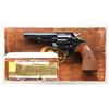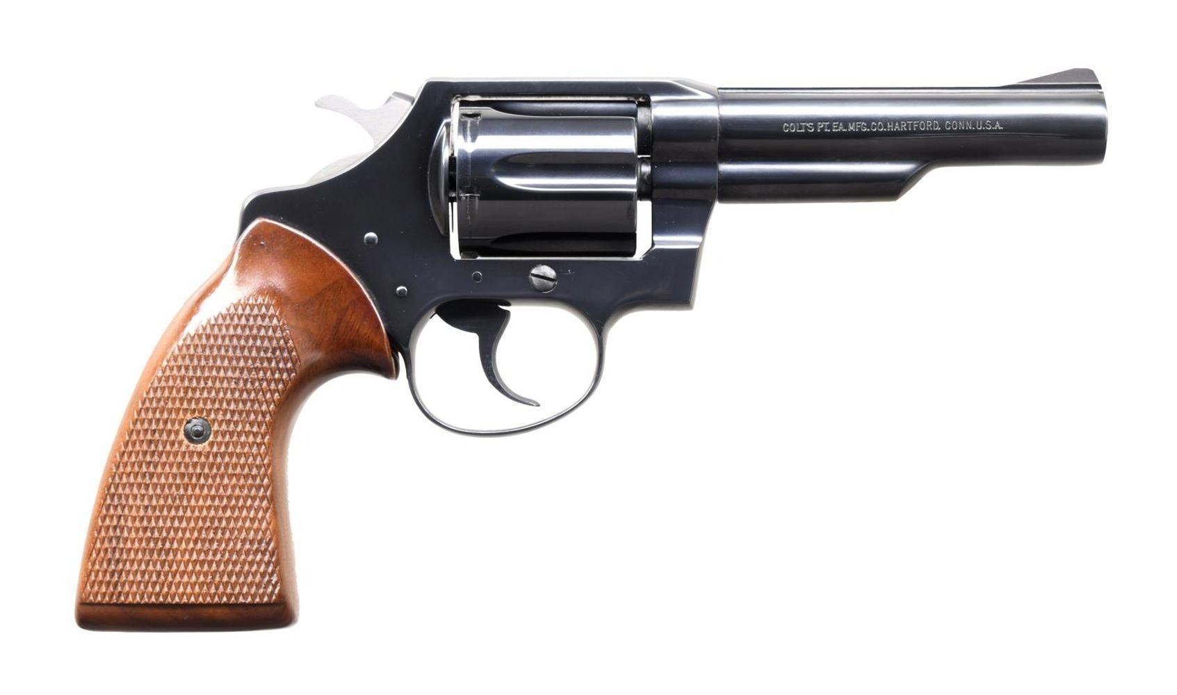 Cal. 38 Spl. S# 15771R. Bbl. 4" heavy, half shrouded with abbreviated matte flat topped rib having integral sloped blade sight; frame notched rear. Mfg. 1978 (1977-1978 within Detective Spl. numbering) with blued finish, short gripped D frame, and oversized Detective Special style checkered walnut grips without medallions. UNATTACHED ACCESSORIES: fair factory wood grained box with detached labeled end flap (included) plus very good styrofoam inserts. "Gun World" order card and Colt handling guide. CONDITION: small trace of firing residue around rear of barrel and face of cylinder; all other aspects near excellent including bore and grips. (23-6046/NW). MODERN. $400-600.