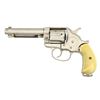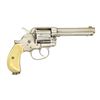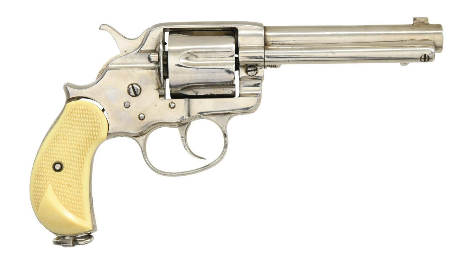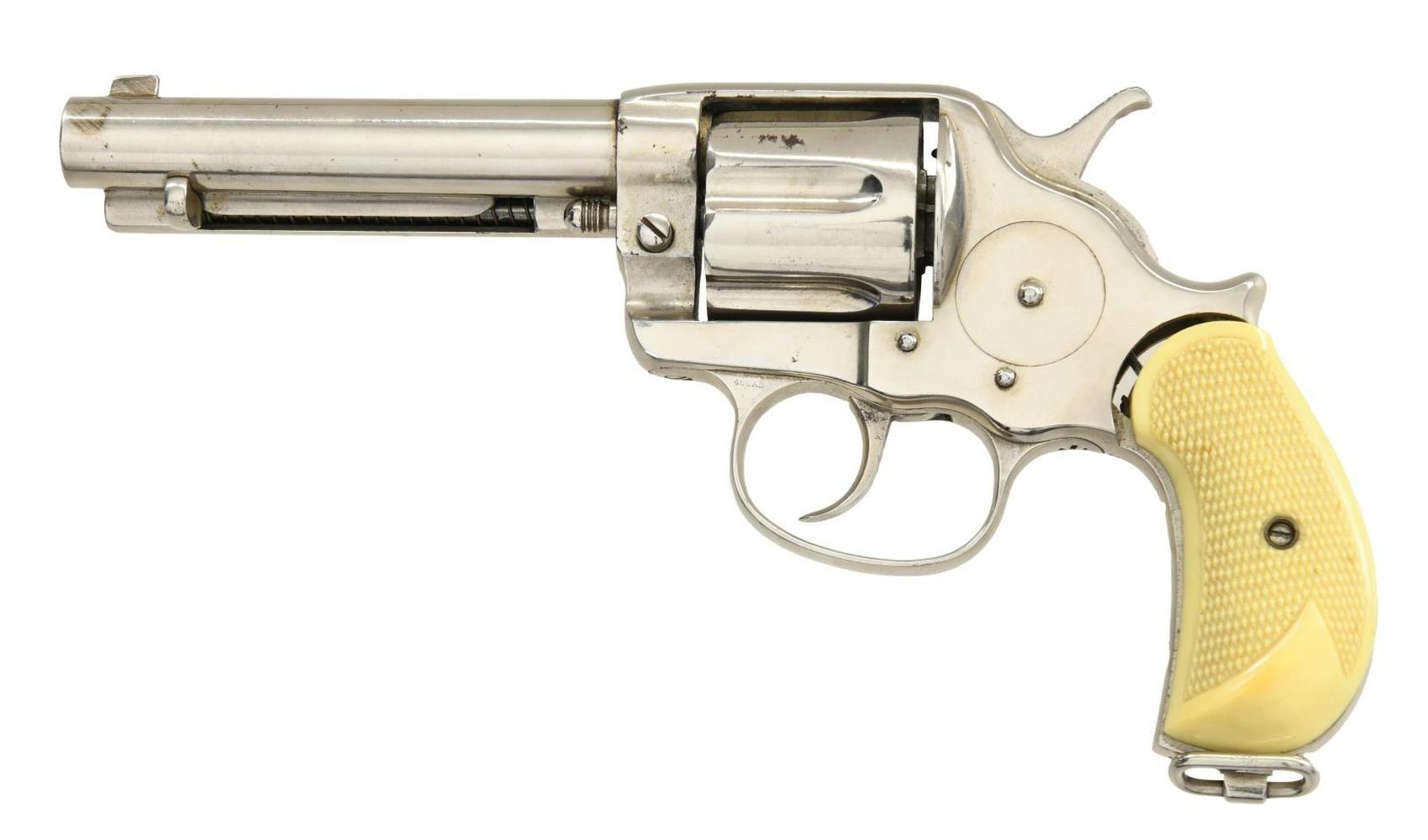 Cal. 45 Colt. S# 21190. Bbl. 5" with replacement Patridge faced blade; pinched frame rear. Mfg. 1888 (1878-1905; 51210 units) with ejector assembly and lanyard swivel on butt of birdshead shaped grip frame. Long cylinder flutes (latches at rear via hand), "120" on loading gate, aftermarket cream colored checkered plastic grips, post manufacture nickel plating and shortened barrel of non standard length. CONDITION: good to very good general appearance with faint prior blemishes visible plus spots of flaking finish mixed with oxidation on cylinder. Poor fit of grips to frame noticeable at top curved area. Weak ejector spring. Proper DA functioning with full timing taking place when trigger is fully pulled (both SA and DA). Poor to fair bore with wear and even pitting. (0124654-/NW). ANTIQUE. $500-750.