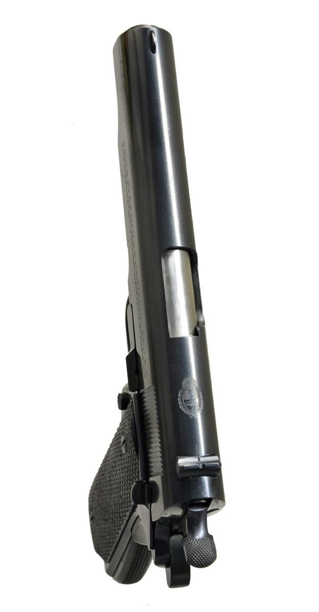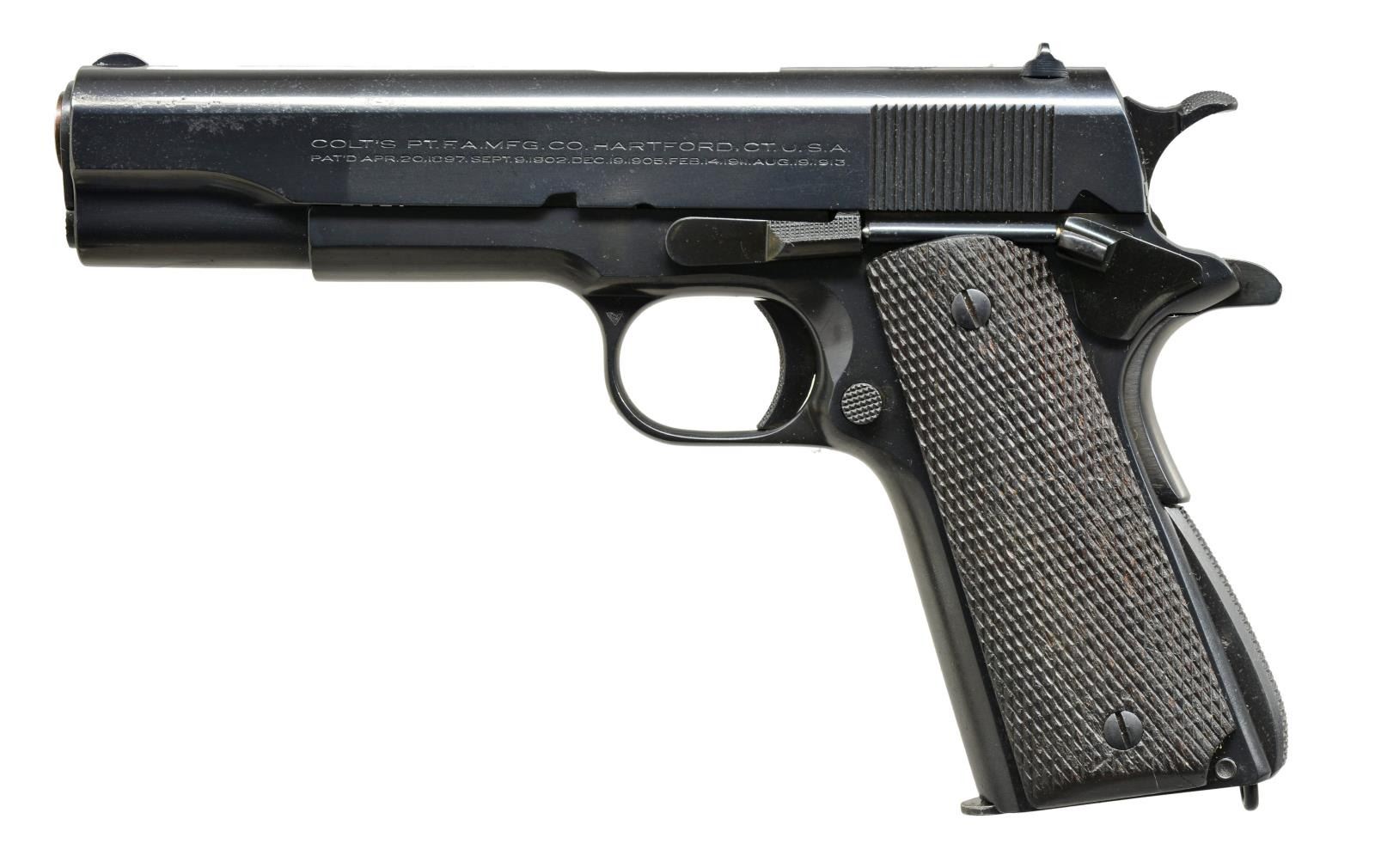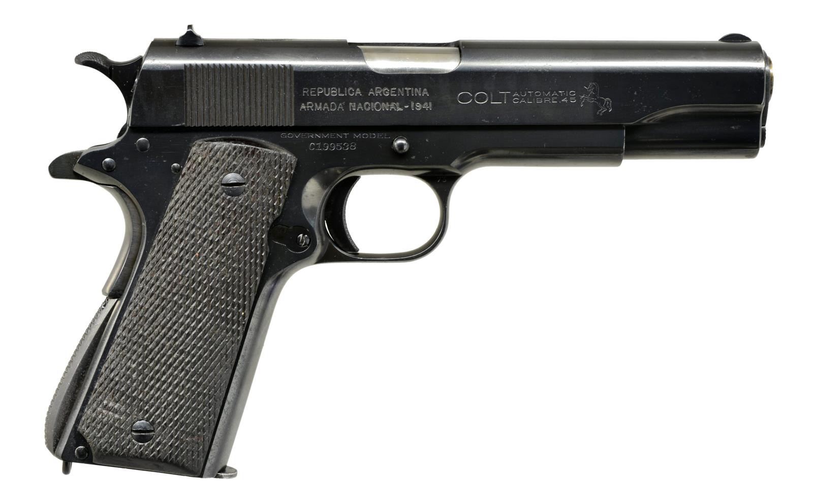 AUTO PISTOL. Cal. 45 ACP. S# C199538. Bbl. 5". Mfg. 1941 for Argentine contract. 500 Ordered; half for Argentine Navy dept. in Buenos Aires & half went to Argentine Naval Commission in Washington D.C. Factory Colt letter for C199540 states July 26, 1941 to Argentina & group of 250; possibly this one was in that order (2 digits off). Additional unusual feature is that pistol is fitted w/ scarce Colt Swartz safety. Standard Colt Government Model commercial markings w/ addition of “REPUBLICA ARGENTINA / ARMADA NACIONAL - 1941" on right side of slide forward of cocking grooves. Full checkered Colt walnut grips. Top of slide between port & rear sight stamped w/ Argentine crest. Standard thin blade semi-circular front sight & U-notched rear. Front of left leg on bbl. stamped "R". Wide spur 1911 style hammer & coarse checkered arched mainspring housing w/ lanyard loop. Top of frame near disconnector stamped "S". "VP" proof on trigger guard below "X"; "73" on opposite side. MAG: very good 2 tone 7 rd. CONDITION: very good to excellent overall appearance as refinished over occasional light pitting on slide & portion of front strap. Bbl. w/ distinct plum hue & port section returned to in the white along w/ muzzle face. Very faint mark from improper slide stop installation. Very faint impact marks on right rear corner of slide. Matte finished mainspring housing; balance of pistol gloss. Noticeable hand wear on grips but no chips or damage. Very limited production original Colt to include scarce Swartz safety. Very good bore w/ very faint traces of frosting. (21-957/NW). CURIO. $3,500-5,500.