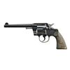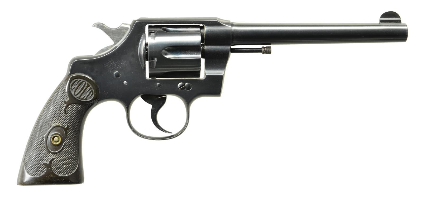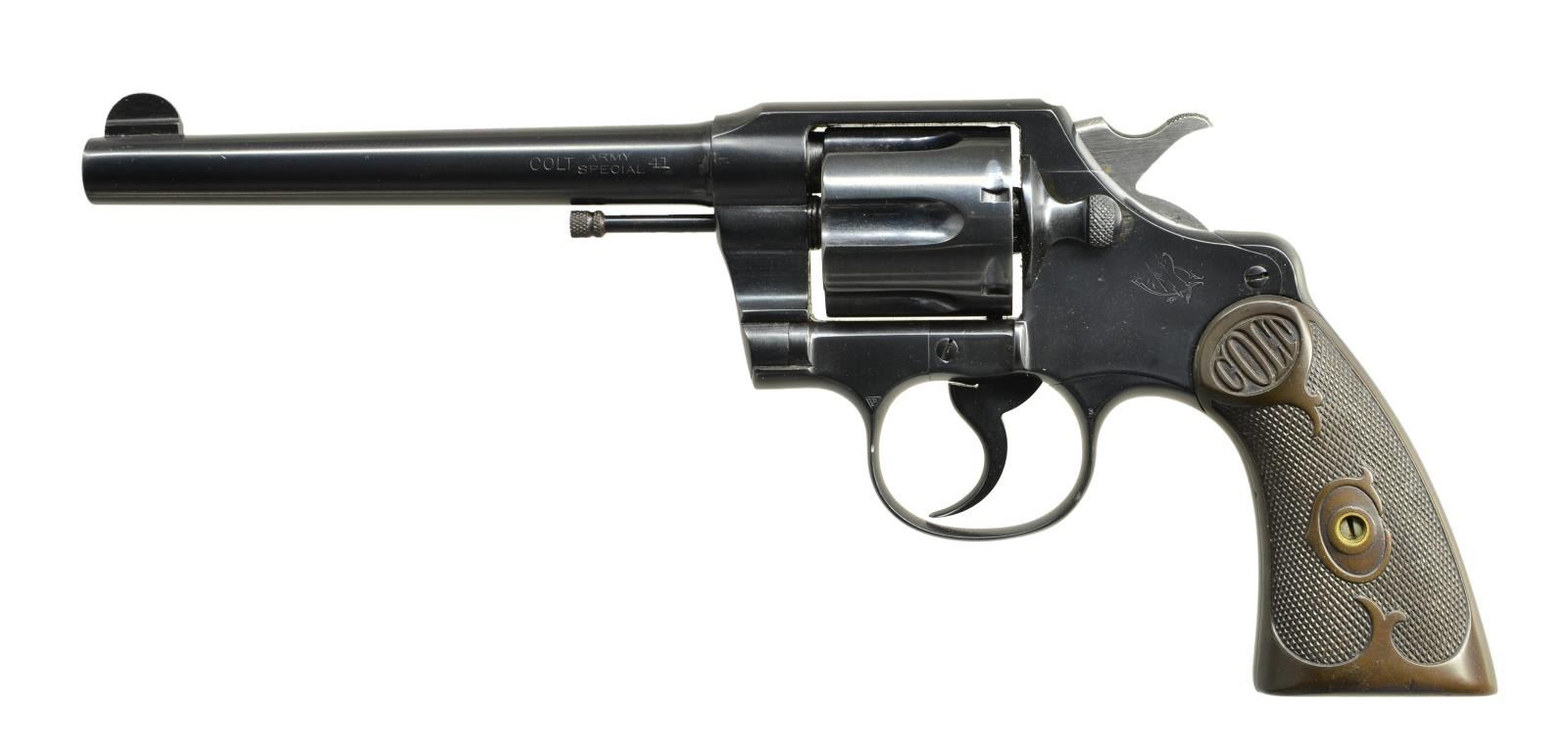 Cal. 41 Colt. S# 303172 (1908, 1st year of production). Blue finished w/ 6" bbl., fixed sights, 6 shot swing out cyl. & 2 piece checkered Colt hard rubber grips. CONDITION: Very good w/ refinished blue having light handling marks & pinprick oxidation. Good grips. Very good bore w/ a few spots of pitting. (22-1796/MD). CURIO. $300-400.