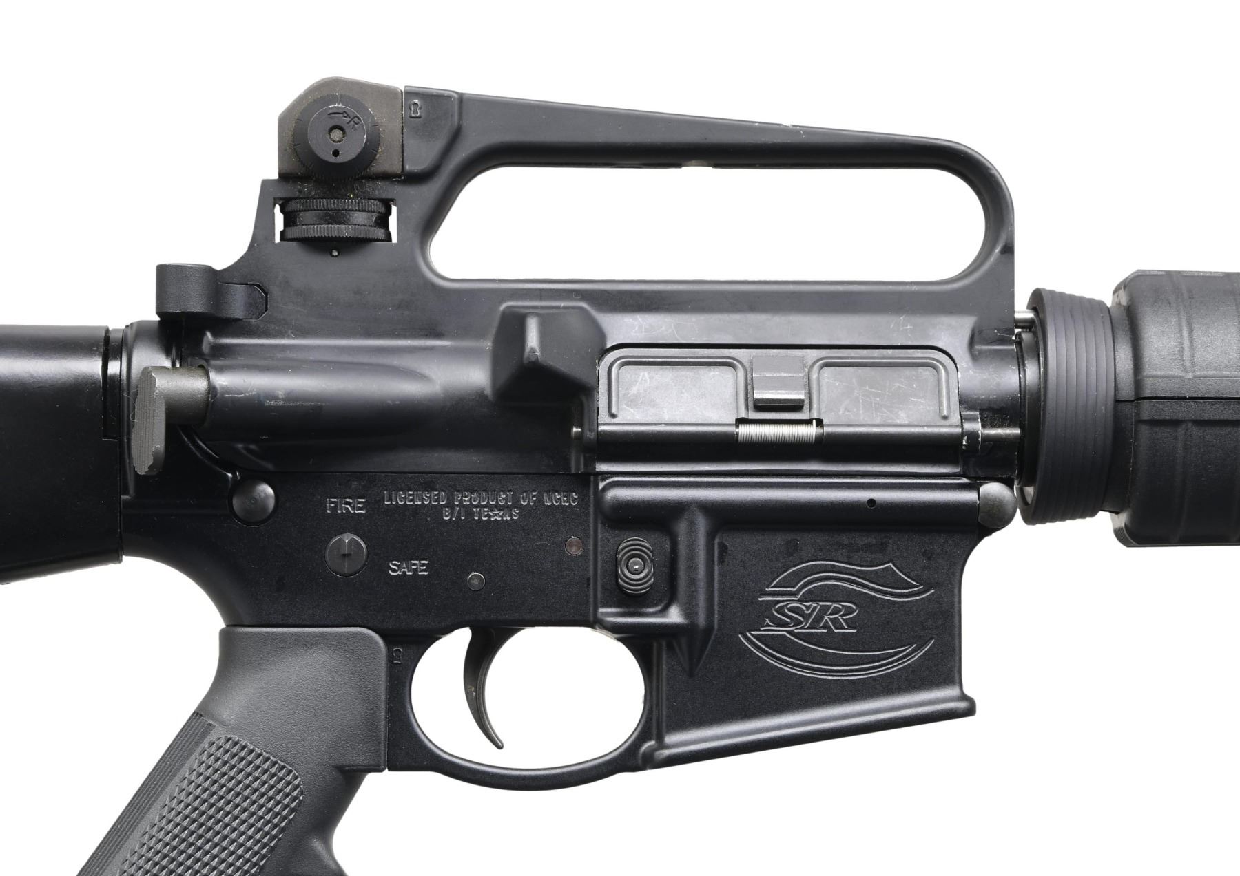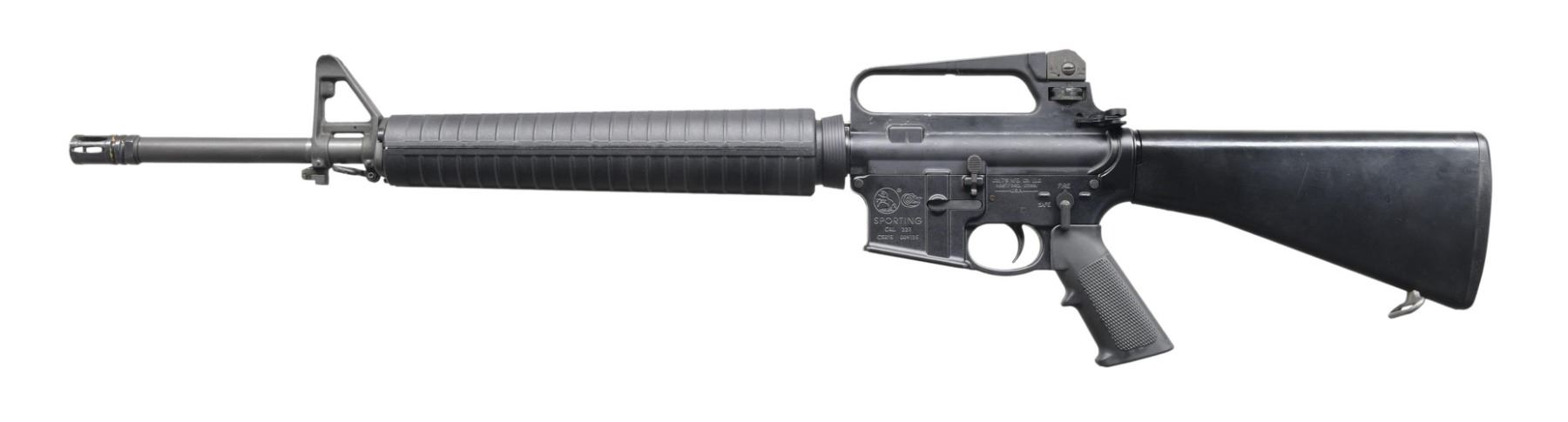 Cal. 223. S# 009135. Bbl. 20". A competition variant of the popular AR-15 w/ a 1:7 heavy barrel, measuring 1" in diameter under the handguards. Threaded muzzle w/ A2 flash hider. Protected post front sight / gas block / bayonet lug. Rifle length round A2 style handguards, retained w/ tapered delta ring. Carry handle upper receiver w/ brass deflector, teardrop forward assist & E2 windage & elevation adjustable, dual aperture rear peep sight. Left side controls on lower receiver w/ integral Winter trigger guard. Full length shoulder stock w/ trap door. CONDITION: Overall finish complete & consistent w/ some use typical thinning on high spots, primarily on upper receiver which may be a replacement. Bright bore w/ visible rifling. Fire control mechanism appears to function correctly when cycled by hand. (24-5455/JZ). MODERN. $600-1,000.
