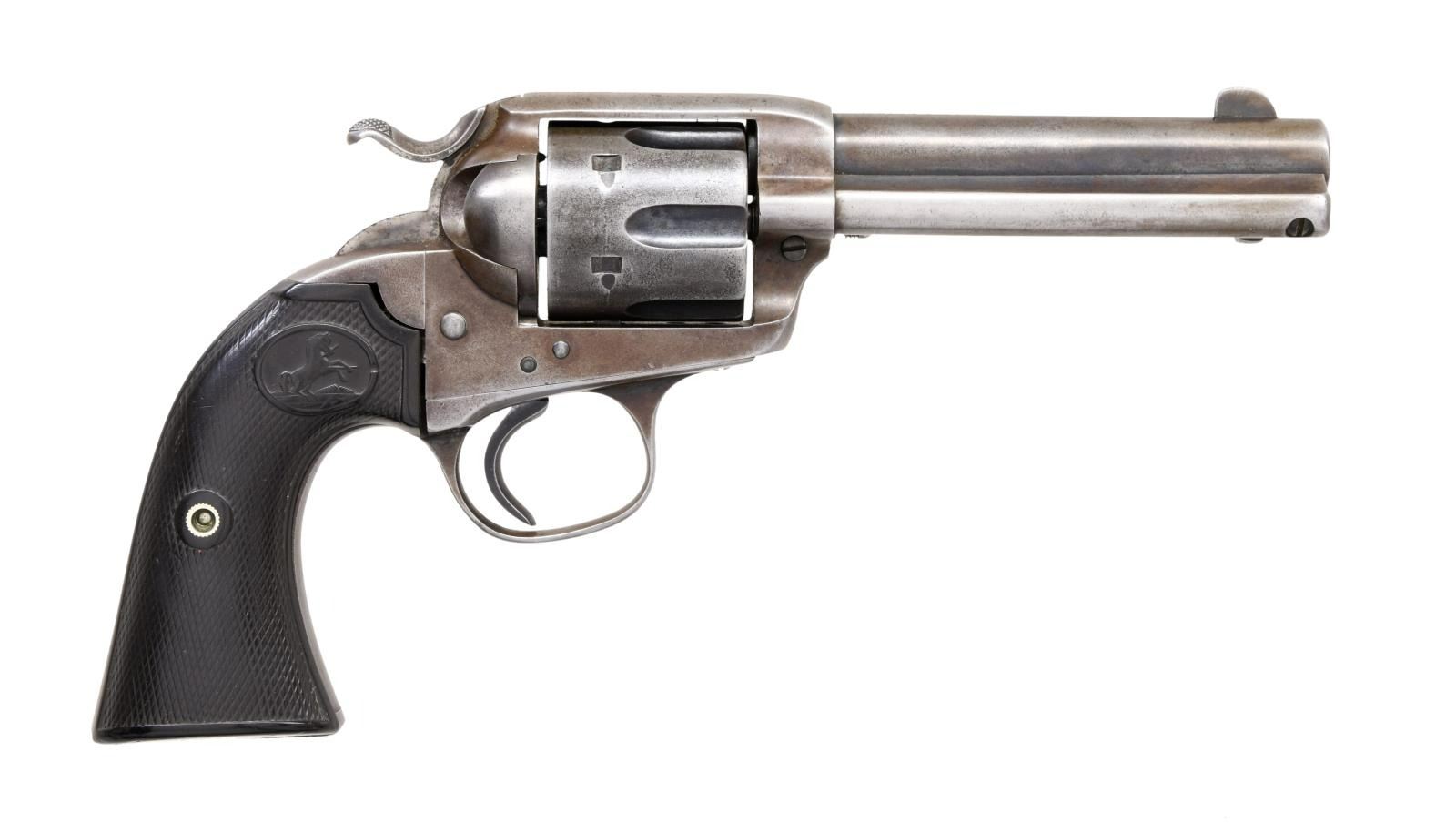 Cal. 44-40. S# 296780. Bbl. 4 3/4". Six shot fluted cyl. Blue & case colored finish. 2 piece checkered hard rubber rampant colt grips. Mfg. 1907. CONDITION: metal has faded to gray/brown w/ areas of pitting. Right grip panel has worn checkering. Left panel is a modern replacement. Tight action w/ 4 clicks on hammer. Bore retains strong rifling. (24-808/DS). CURIO. $1,750-2,500.
