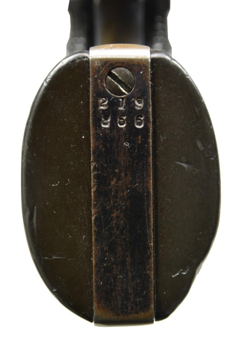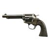 Cal. 45 Colt. S# 219866. Bbl. 5 1/2" w/ blade front sight. Left side is marked "(BISLEY MODEL)". 6 Shot fluted cyl. Bbl., ejector housing, cyl., grip straps & trigger have blue finish. Case colored frame & hammer. 2 Piece checkered hard rubber Rampant Colt grips. 1901 Mfg. CONDITION: bbl., cyl. & grip straps retain 70% dull blue fading to brown & showing spots of light corrosion. Frame is fading to silver/gray w/ spots of light corrosion & retains sm. amounts of case colors in protected areas. Hammer has good case colors on protected areas of its sides. Grips show light checkering wear w/ handling marks & chip at butt. Bore retains worn rifling & shows general very light pitting. (20-1751). CURIO. $2,250-3,500.