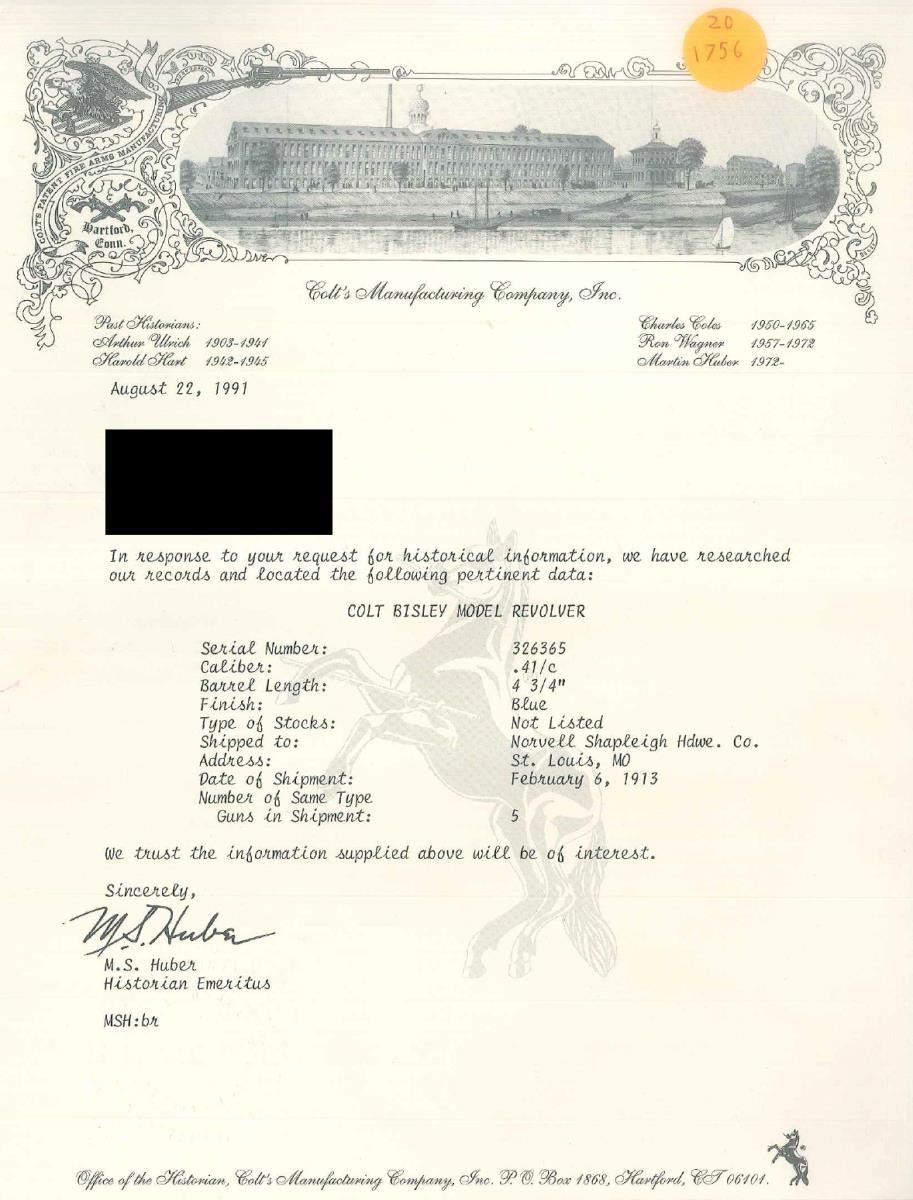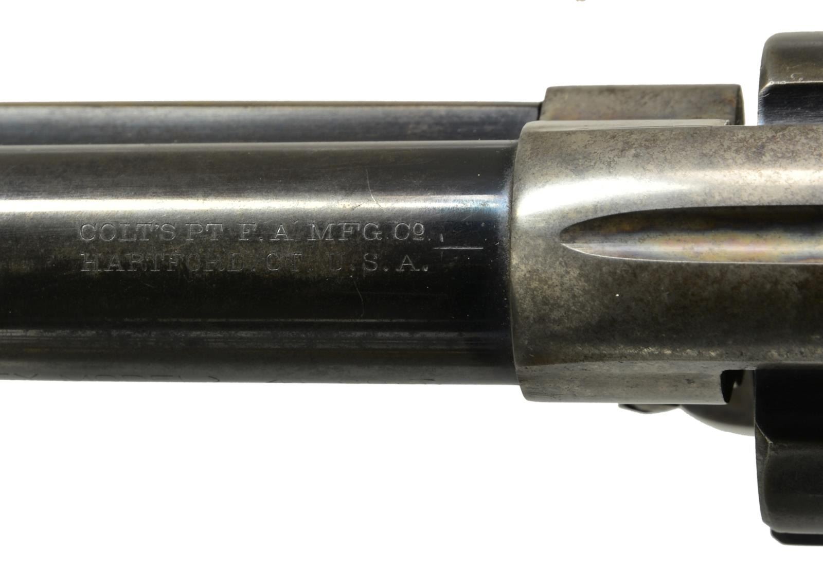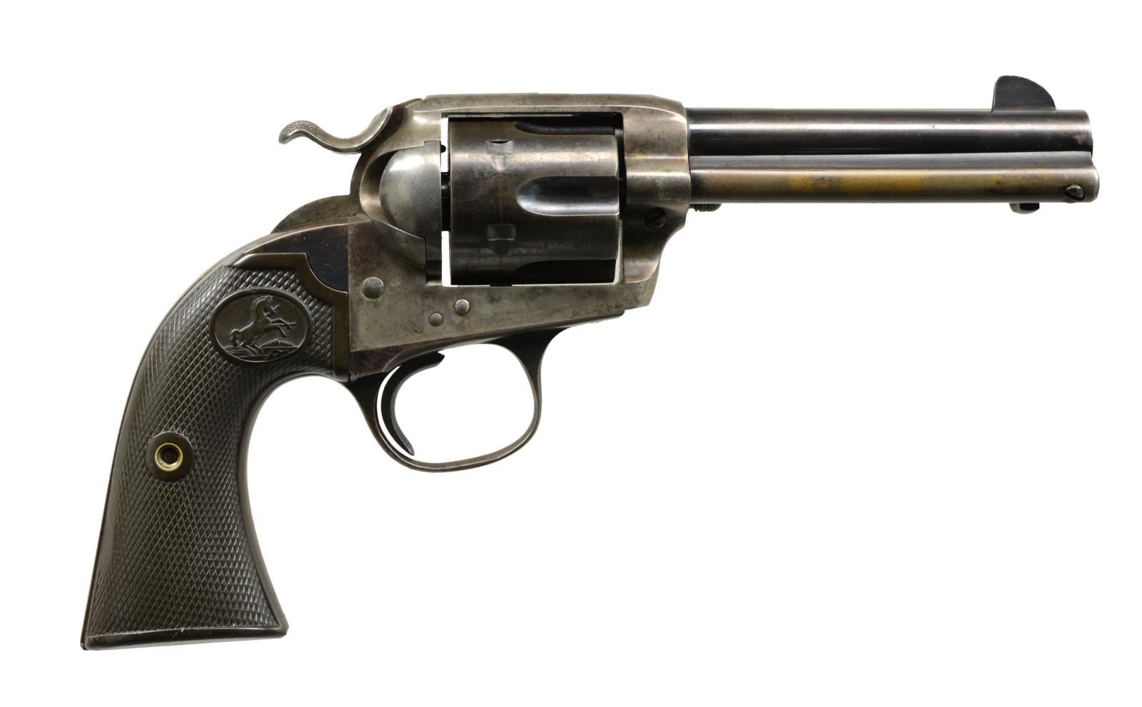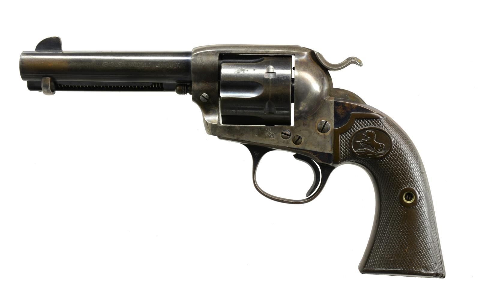 Cal. 41 Colt. 1 of only 3159 produced in this cal. S# 326365. Bbl. 4 3/4" w/ blade front sight. Left side marked "(BISLEY MODEL)". 6 Shot fluted cyl. Blue finish w/ case colored frame & hammer. 2 Piece checkered hard rubber Rampant Colt grips. 1913 Mfg. UNATTACHED ACCESSORIES: Colt Factory Letter. CONDITION: 40% dull blue fading to brown showing spots of corrosion. Frame & hammer are fading to a mottled gray w/ 25% lightly fading case colors. Grips have worn checkering w/ handling marks & sm. chips at butt. Bore retains sound rifling showing scattered pitting. (20-1756). CURIO. $2,250-3,000.