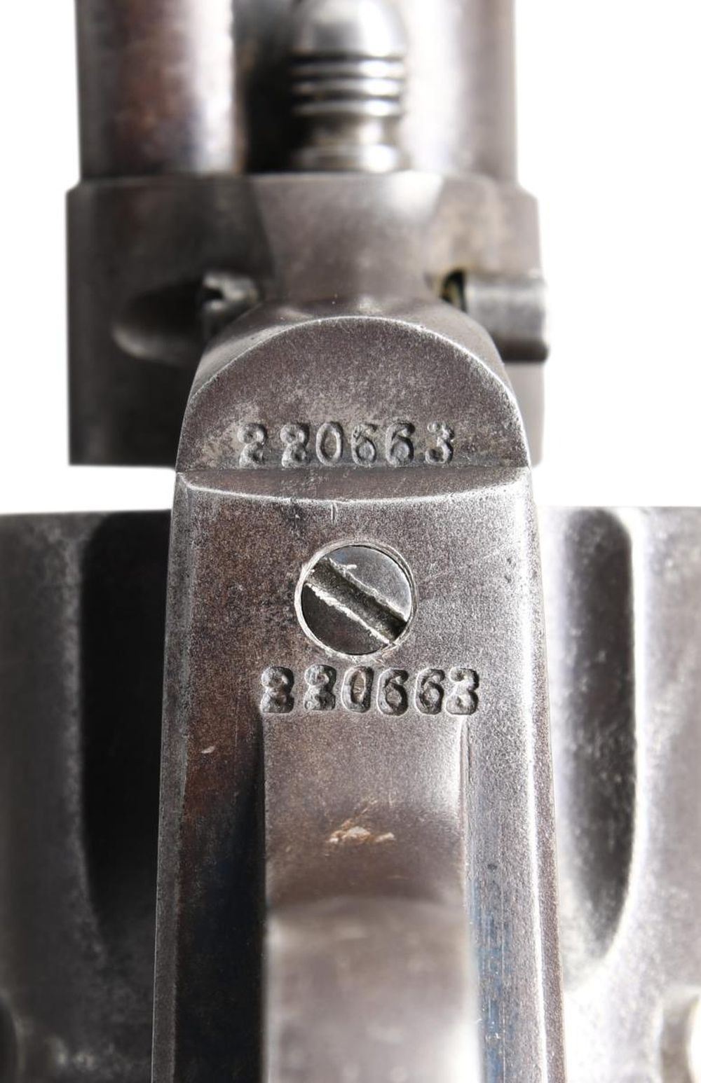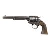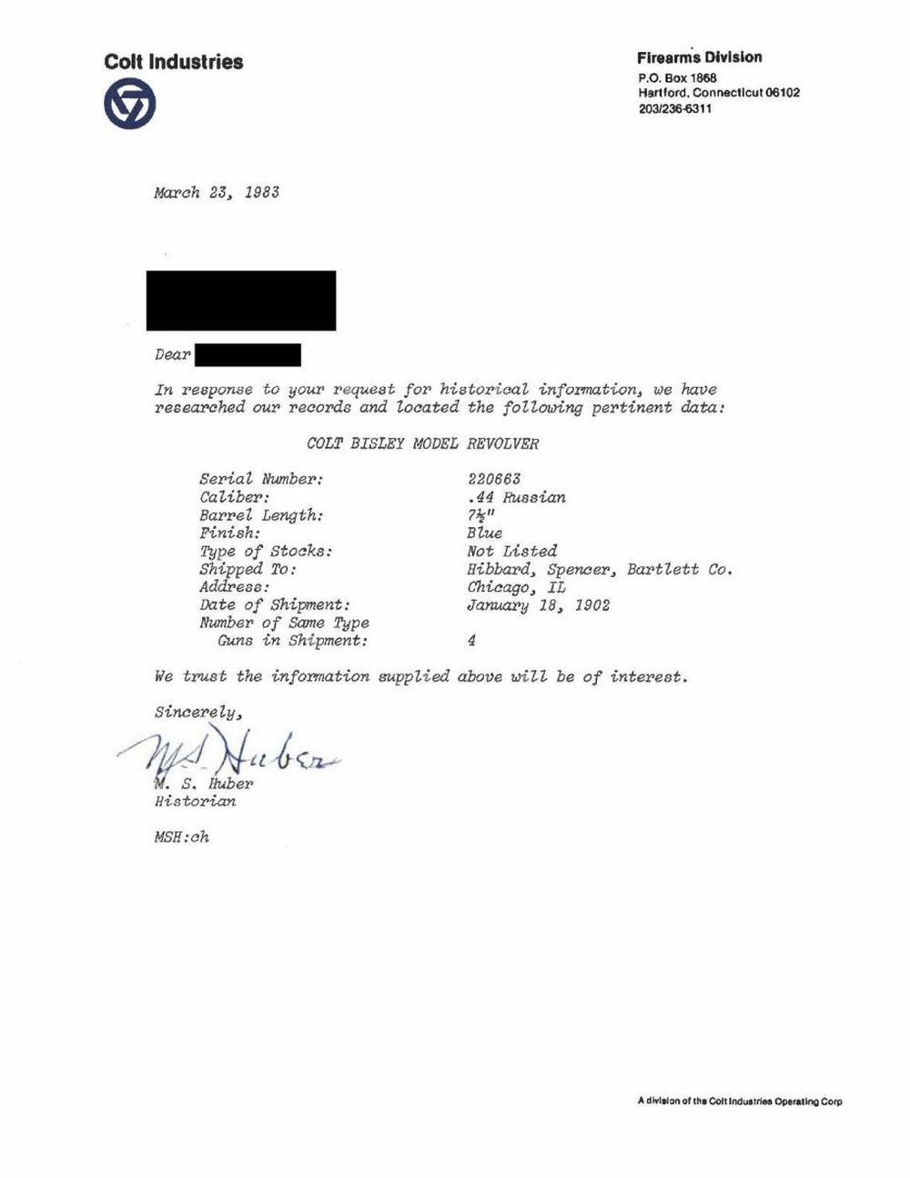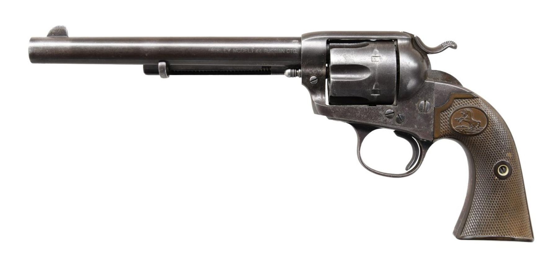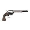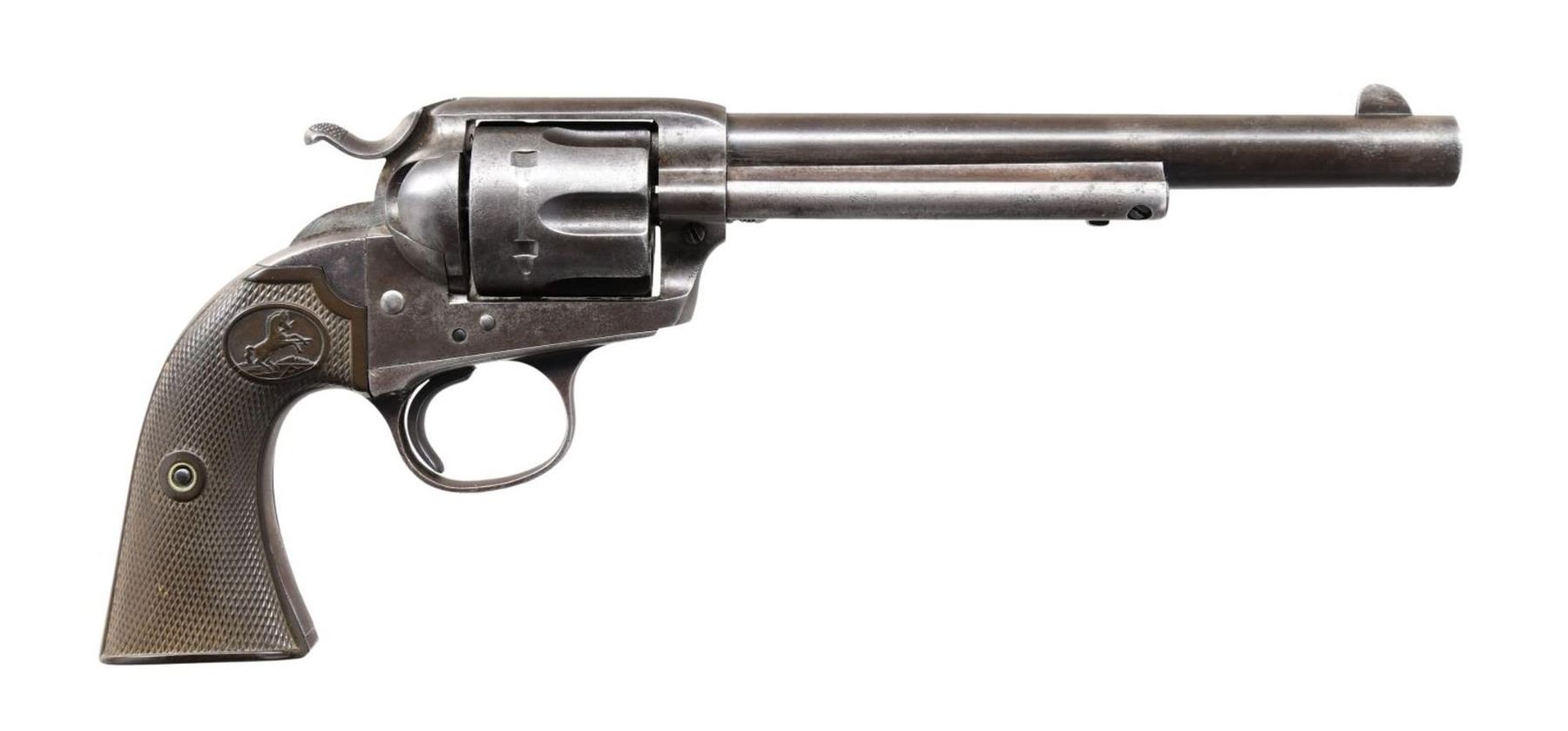 Cal. 44 Russian. S# 220663. Bbl. 7 1/2". Six shot fluted cyl. 2 piece checkered hard rubber grips. UNATTACHED ACCESSORIES: letter from Colt Industries dated March 23, 1983 detailing the following information, "Serial Number: 220663 / Caliber: .44 Russian / Barrel Length: 7 1/2" / Finish: Blue / Type of Stocks: Not Listed / Shipped To: Hibbard, Spencer, Bartlett Co. / Address: Chicago, Illinois / Date of Shipment: January 18, 1902 / Number of Same Type Guns in Shipment: 4". CONDITION: metal finish has faded to gray showing scattered light pitting. Grips show light wear w/ small chip at butt of left panel. Tight action. Hammer retains 4 notches. Bore has lightly frosted appearance w/ worn rifling. (24-781/DS). CURIO. $2,750-3,750.