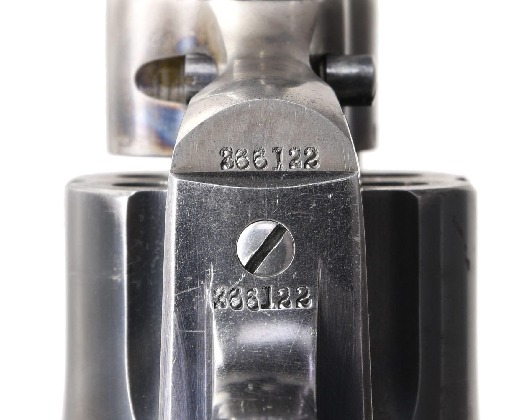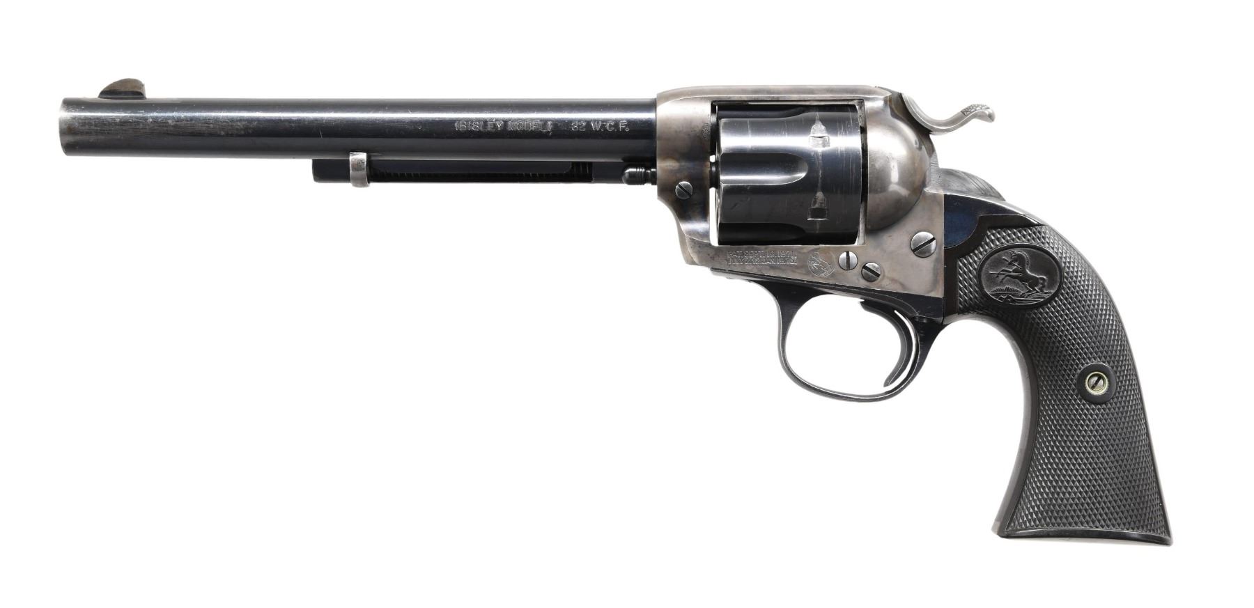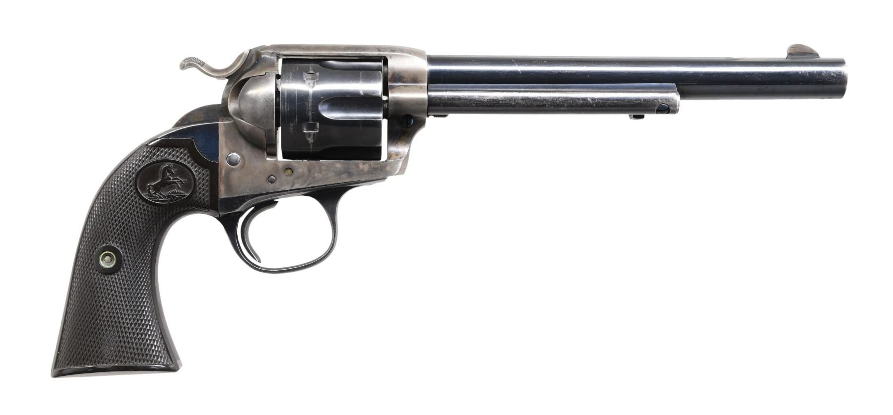 Cal. 32 WCF. S#. 266122. Bbl. 7 1/2". Six-shot fluted cyl. Blue and case-colored finish. Two-piece checkered hard rubber rampant colt grips. Mfg. 1905. CONDITION: bbl., cyl., and grip straps retain over 70% blue, showing carry wear and a cyl. drag line. Frame shows 20% lightly visible case colors. Grips show light wear. Action is tight and sound. Bore is generally bright with strong rifling. (24-5676/DS). CURIO. $1,750-2,500.