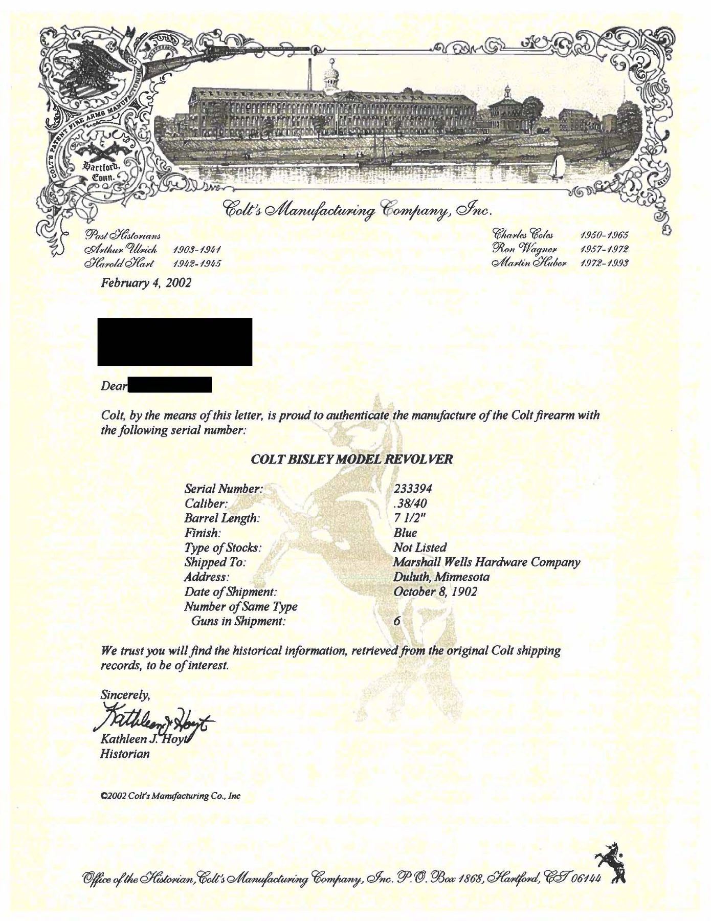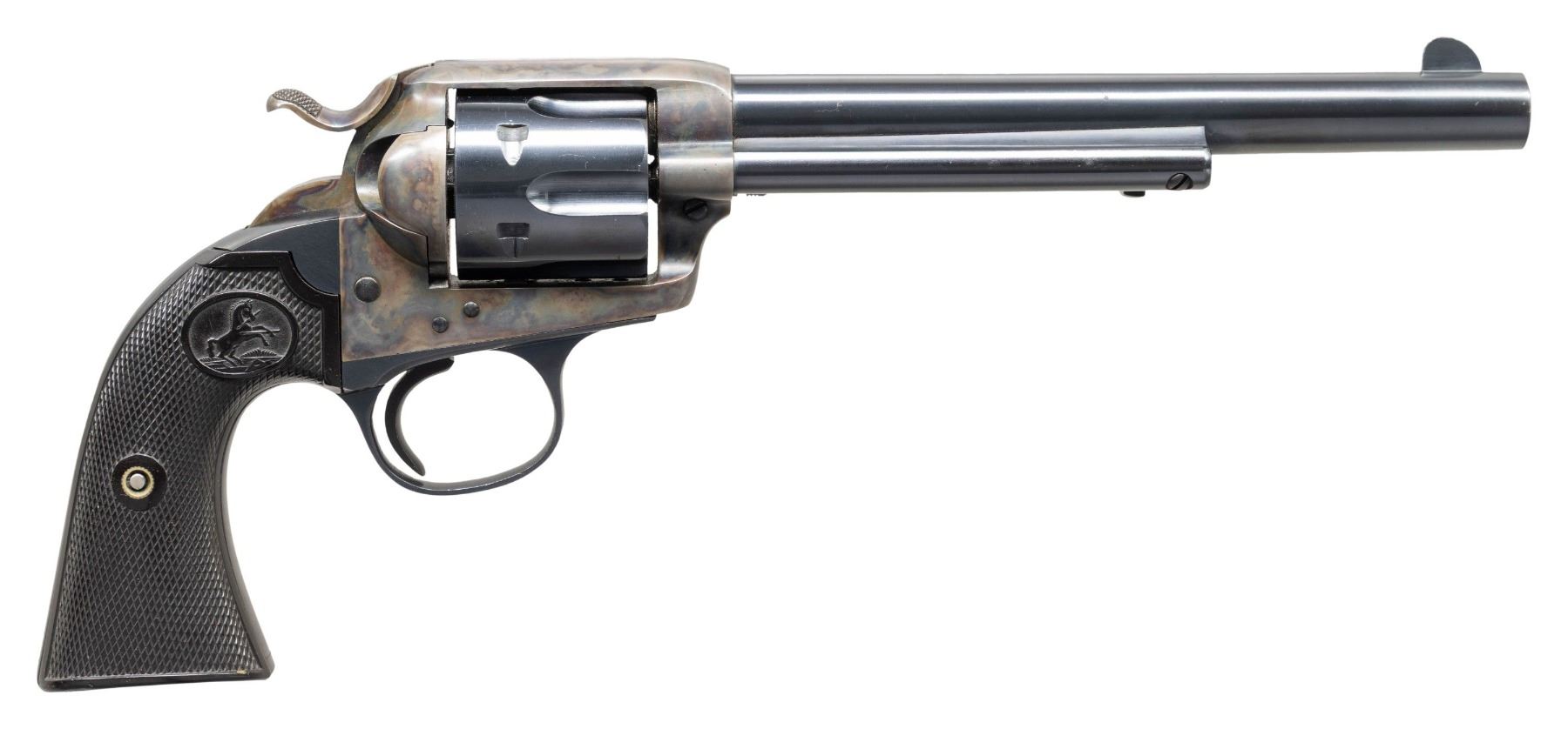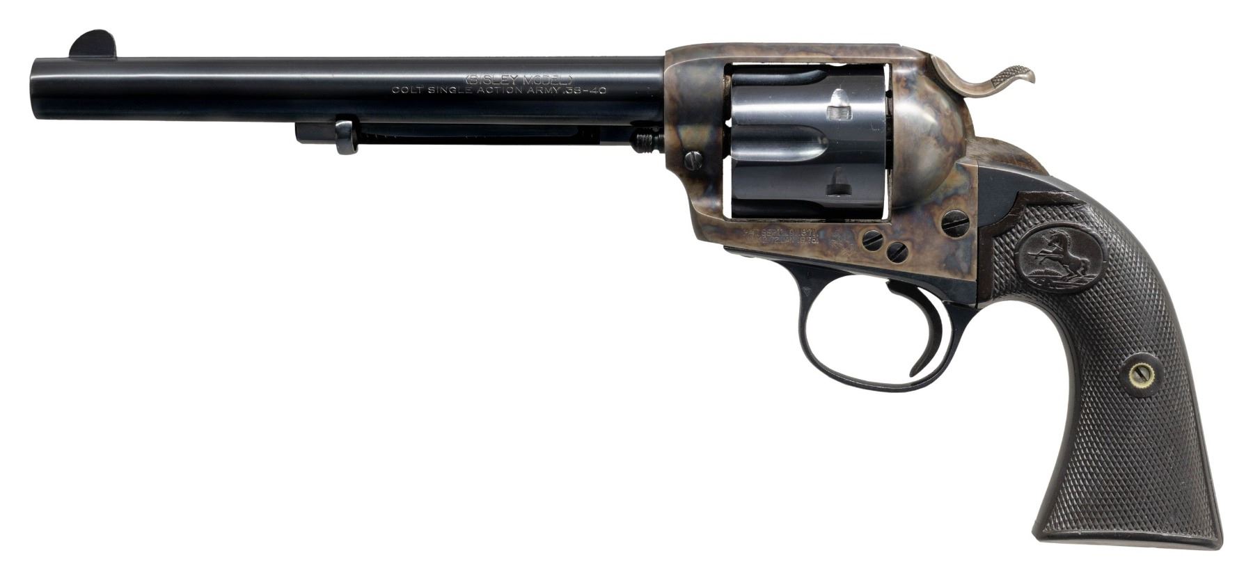 Cal.38-40. S#. 233394. Bbl. 7 1/2" with Hartford address. Six shot fluted cyl. Blue & case colored finish. Two piece checkered hard rubber rampant colt grips. UNATTACHED ACCESSORIES: Colt factory letter stating: "Serial Number: 233394/ Caliber: .38/40/ Barrel Length: 7 1/2"/ Finish: Blue/ Type of Stocks: Not Listed/ Shipped To: Marshall Wells Hardware Company/ Address: Duluth, Minnesota/ Date of Shipment: October 8, 1902/ Number of Same Type Guns in Shipment: 6". CONDITION: over 90% restored blue and case colored finish. Grips show light wear and a few small handling marks. Sound action. Lightly pitted bore retains strong rifling. PROVENANCE: The Esteemed Norm Greenberg Collection. (25-4174/DS). CURIO. $2,250-3,500.