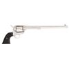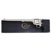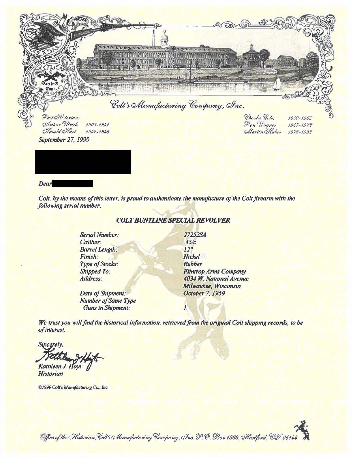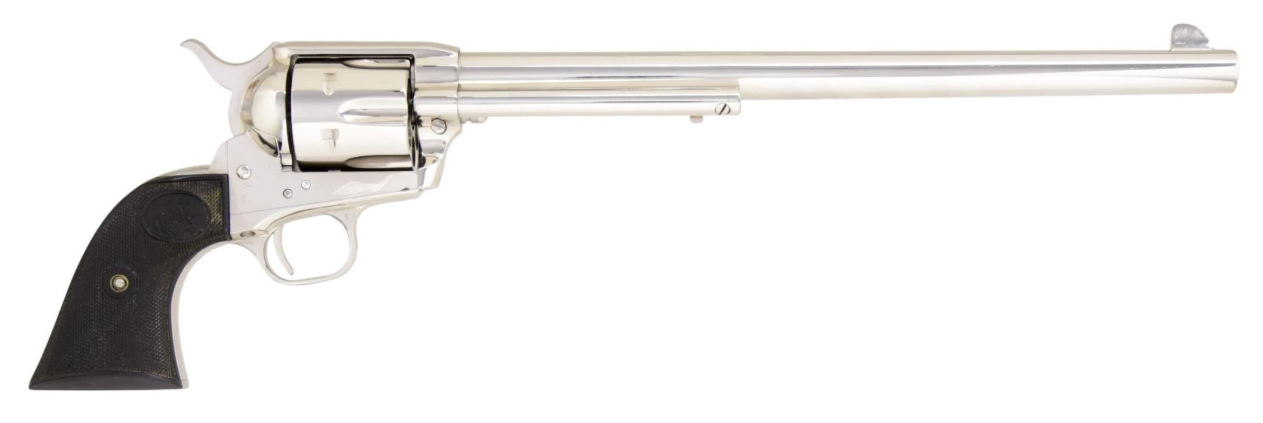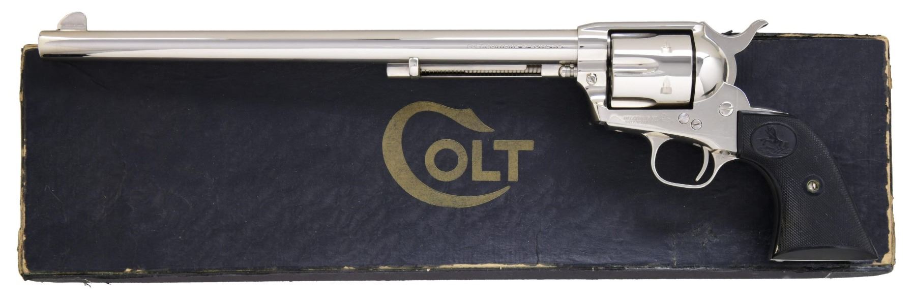 Cal. 45 Colt. S# 27252SA. Bbl. 12". Six shot fluted cyl. Full nickel finish. 2 piece checkered hard rubber rampant colt grips. "The Post-War Colt Single Action Revolver" by Don Wilkerson states that of 3,995 buntlines, only 65 were nickel finished. UNATTACHED ACCESSORIES: 1 piece black box w/ matching serial number & label. Box contains instruction manual, warranty card, handling the handgun brochure & cleaning brush. Box shows tattering w/ 2 taped corners. Also includes a letter from Colt Manufacturing Company, Inc detailing the following information, "Serial Number: 27252SA / Caliber: .45/c / Barrel Length: 12" / Finish: Nickel / Type of Stocks: Rubber / Shipped To: Flintrop Arms Company / Address: 4034 W. National Avenue Milwaukee, Wisconsin / Date of Shipment: October 7, 1959 / Number of Same Type Guns in Shipment: 1". CONDITION: over 98% nickel finish. Very good grips. Hammer will not hold in full cock position. Bright near excellent bore. PROVENANCE: From the lifelong Collection of Jim Williams. (24-2646/DS). CURIO. $5,000-8,000.