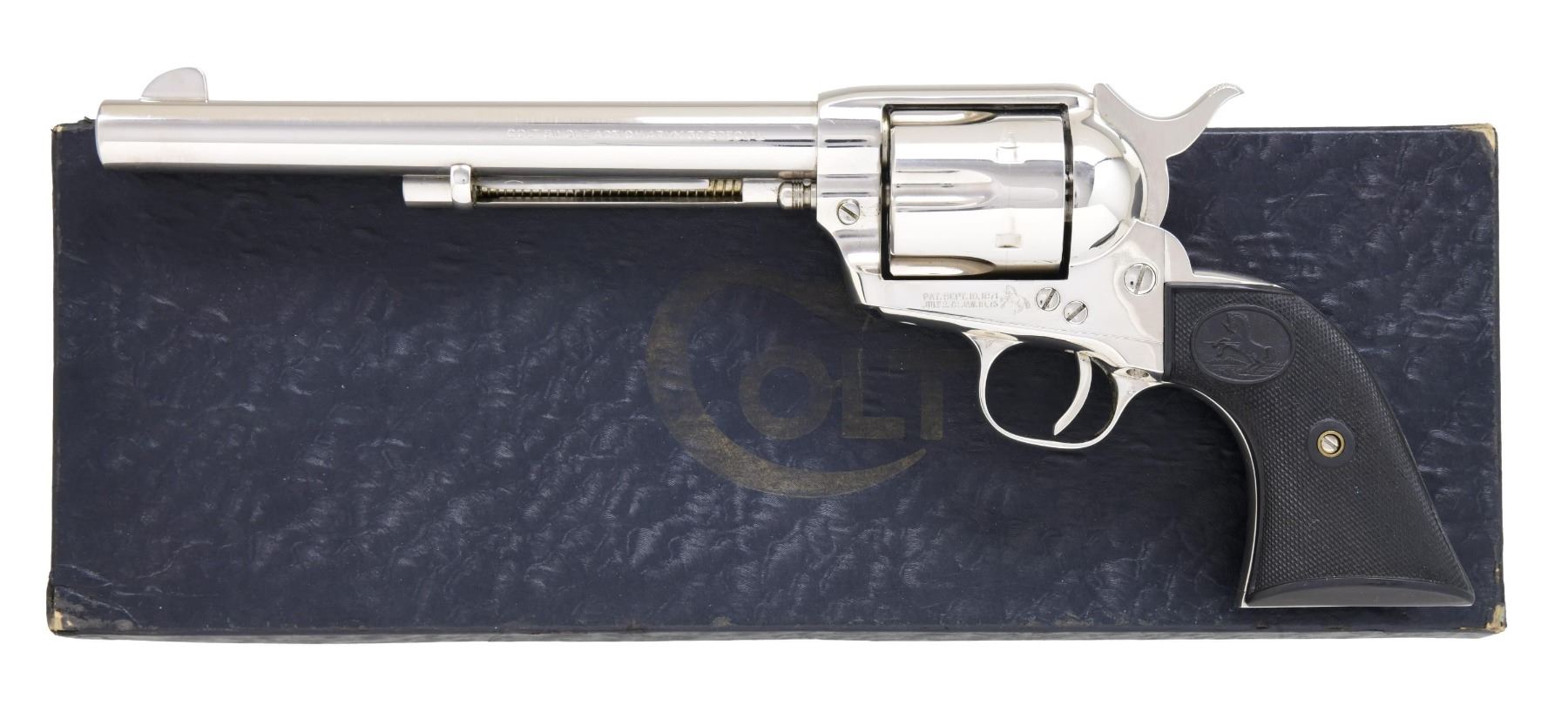 Cal. 38 Spl. S# 17669SA. Bbl. 7 1/2". Six shot fluted cyl. Nickel finish. 2 piece checkered hard rubber grips. "The Post-War Colt Single Action Revolver" by Don Wilkerson estimated that 108 revolvers were produced in this caliber, barrel length & finish. UNATTACHED ACCESSORIES: letter from the Colt Manufacturing Company, Inc. detailing the following information, "Serial Number: 17669-SA / Caliber: .38 Special / Barrel Length: 7 1/2" / Finish: Nickel / Type of Stocks: Not Listed / Shipped To: The Jay / Address: 222 - 16th Street Ashland, Kentucky / Date of Shipment: April 8, 1959 / Number of Same Type Guns in Shipment: 1". Also includes 1 piece black box w/ matching label. Box contains owner's manual, warrantee card, handling the handgun brochure & brush. CONDITION: over 98% original finish showing a cyl. drag line, scattered small scratches w/ a spot of finish loss at muzzle. Bright near excellent bore. PROVENANCE: From the lifelong Collection of Jim Williams. (24-2656/DS). CURIO. $2,500-4,000.