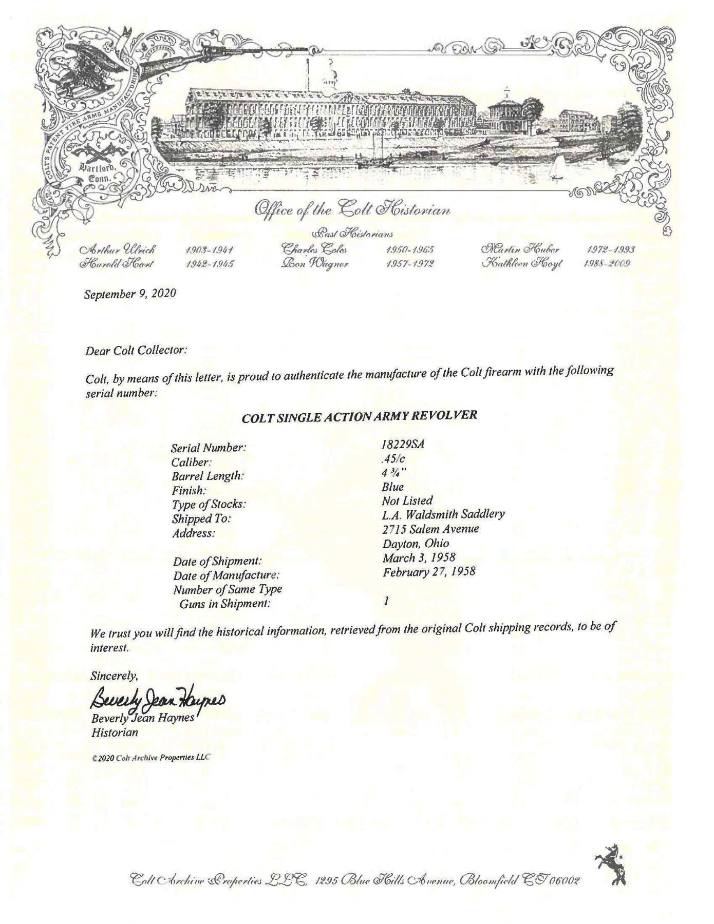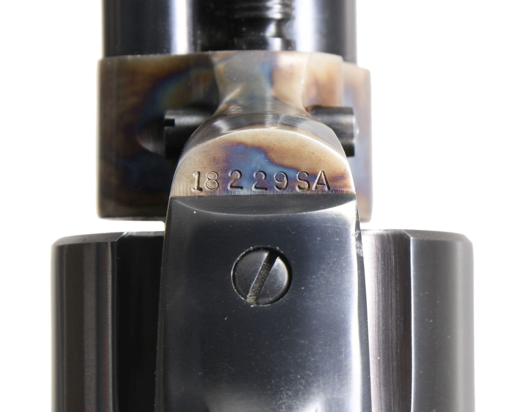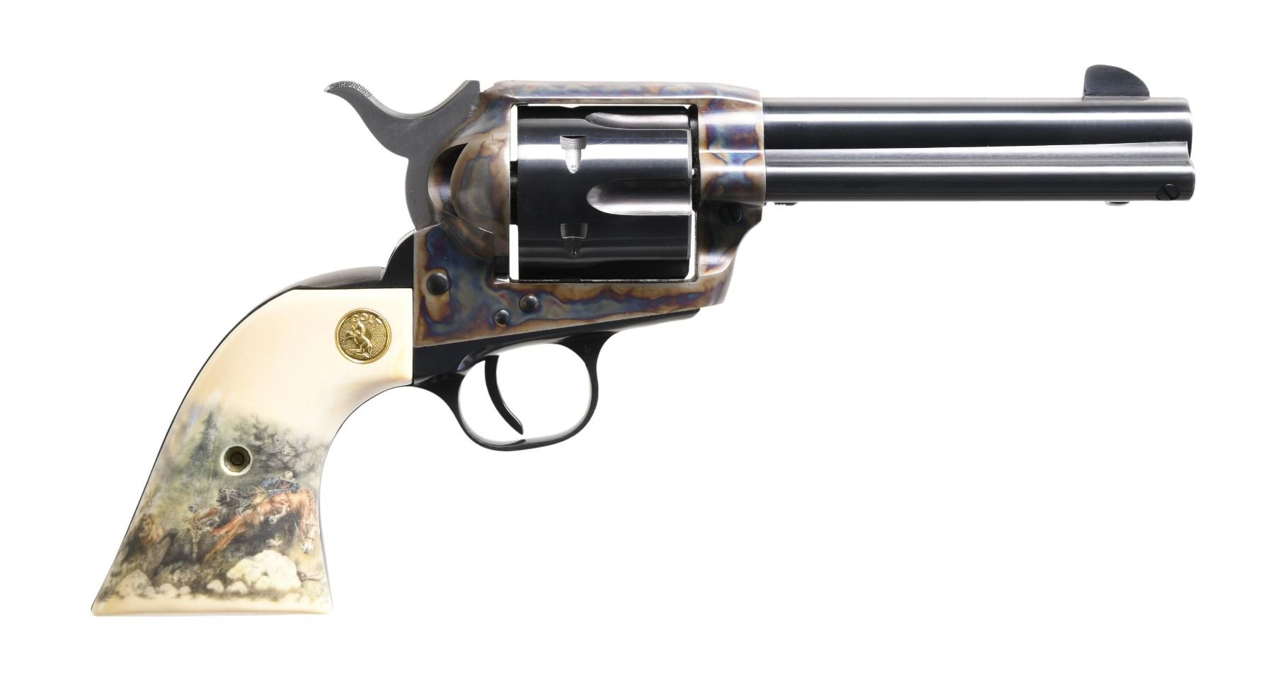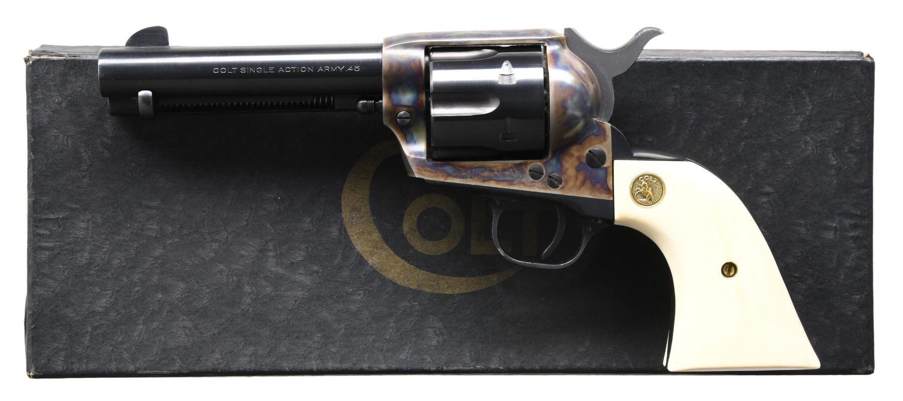 Cal. 45 Colt. S# 18229SA. Bbl. 4 3/4". Six shot fluted cyl. Blue & case colored finish. Custom 2 piece ivory grips w/ gold rampant colt medallions. Right panel has colored scrimshaw scene of grizzly charging a cowboy. UNATTACHED ACCESSORIES: letter from Colt Archive Properties LLC detailing the following information, "Serial Number: 18229SA / Caliber: .45/c / Barrel Length: 4 3/4" / Finish: Blue / Type of Stocks: Not Listed / Shipped To: L. A. Waldsmith Saddlery / Address: 2715 Salem Avenue Dayton, Ohio / Date of Shipment: March 3, 1958 / Date of Manufacture: February 27, 1958 / Number of Same Type Guns in Shipment: 1". 1 piece black box w/ matching serial number & label. Box contains original 2 piece checkered hard rubber rampant colt grips, owner's manual, warranty card, photo-copied picture of the artwork on the ivory grips & cleaning brush. CONDITION: appears unfired retaining virtually all metal finish. Bright near excellent bore. PROVENANCE: From the lifelong Collection of Jim Williams. (24-2648/DS). CURIO. $2,750-4,000.