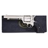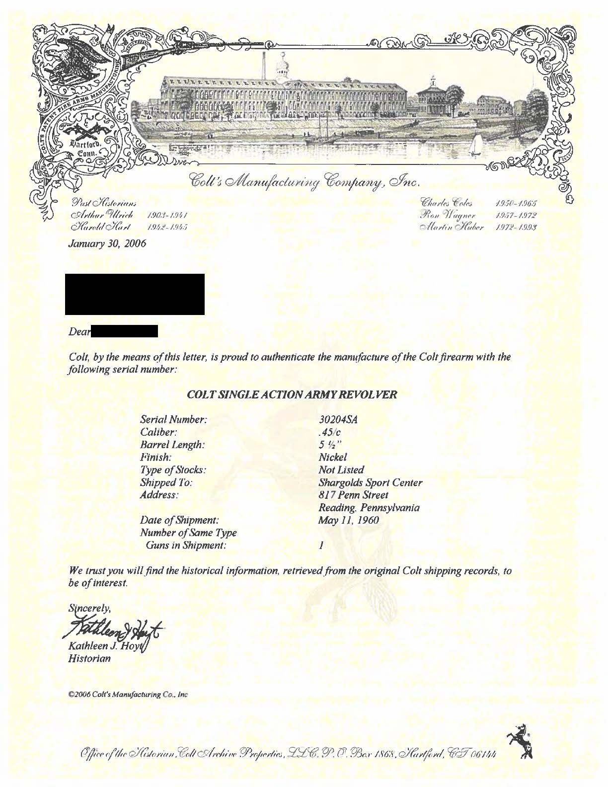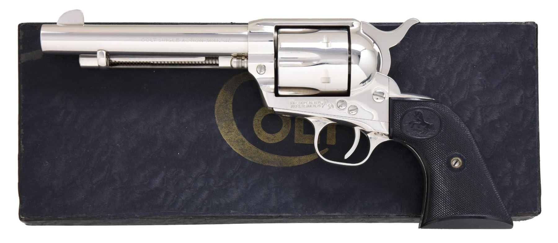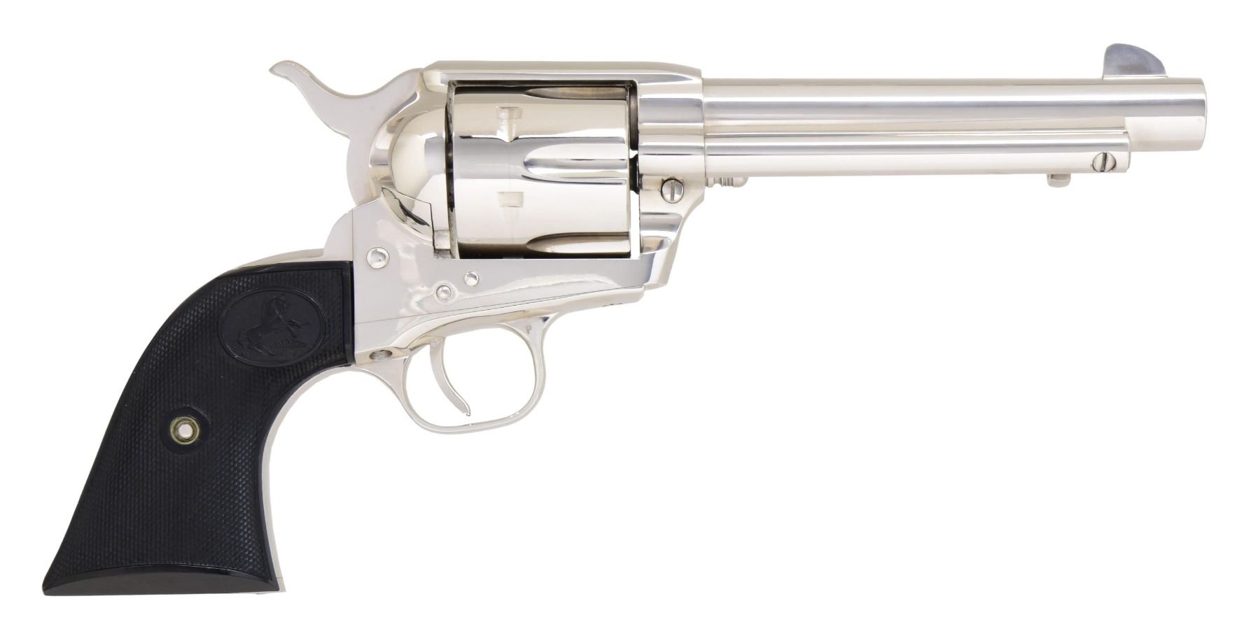 Cal. 45 Colt. S# 30204SA. Bbl. 5 1/2". Six shot fluted cyl. Full nickel finish. 2 piece checkered rampant colt grips. "The Post-War Single Action Revolver" by Don Wilkerson states that only 1,396 revolvers of this caliber, barrel length & finish were produced. UNATTACHED ACCESSORIES: 1 piece black box w/ matching serial number & label. Box contains instructions, warranty card, handling the handgun brochure & cleaning brush. Includes a letter from Colt Archive Properties detailing the following information, "Serial Number: 30204SA / Caliber: .45/c / Barrel Length: 5 1/2" / Finish: Nickel / Type of Stocks: Not Listed / Shipped To: Shargolds Sport Center / Address: 817 Penn Street Reading, Pennsylvania / Date of Shipment: May 11, 1960 / Number of Same Type Guns in Shipment: 1". CONDITION: near excellent, original finish showing a slight cyl. drag line. Bright near excellent bore. PROVENANCE: From the lifelong Collection of Jim Williams. (24-2651/DS). CURIO. $3,000-4,000.