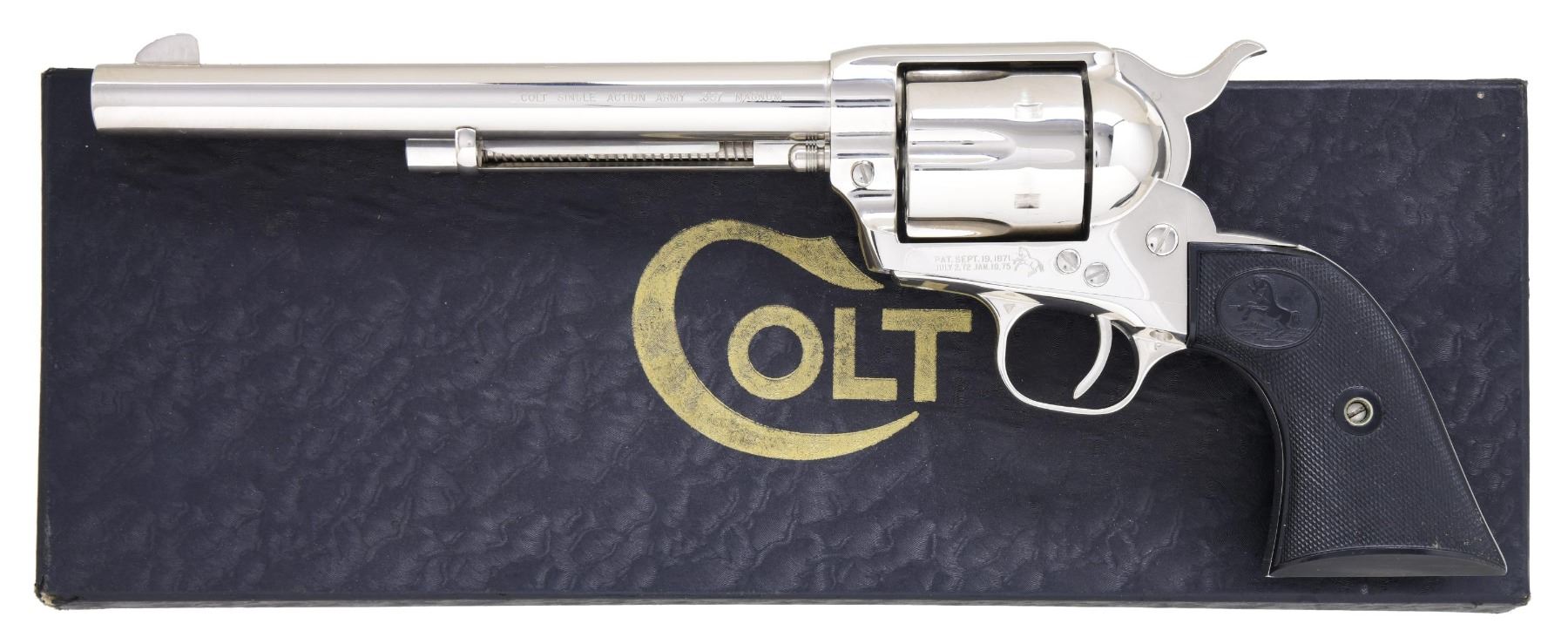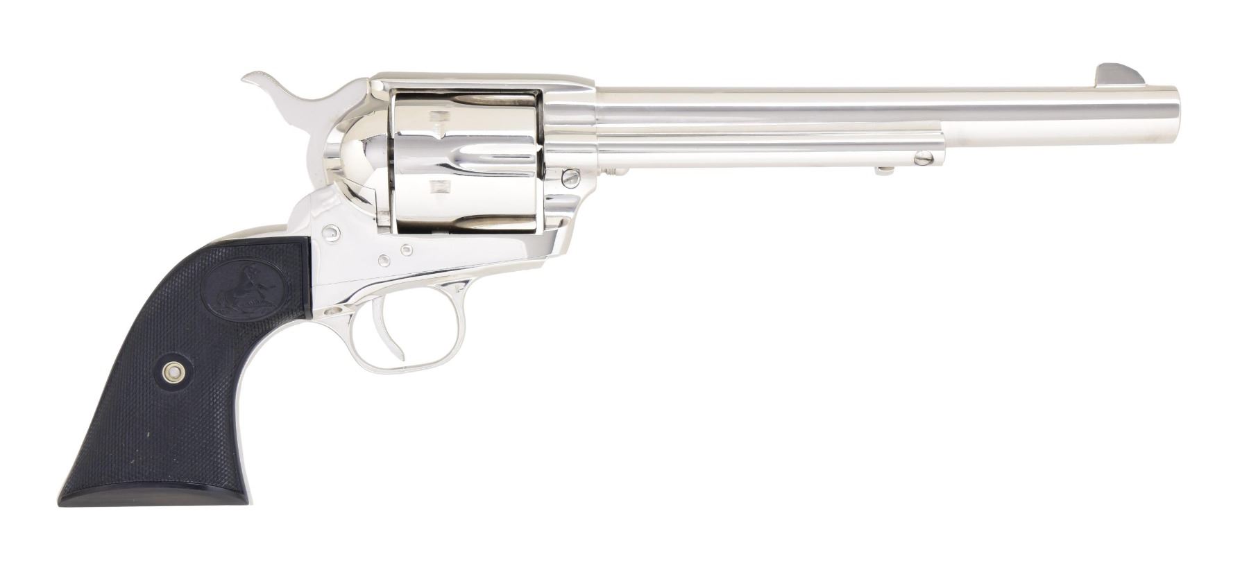 Cal. 357 Mag. S# 32275SA. Bbl. 7 1/2". Six shot fluted cyl. Nickel finish. 2 piece checkered hard rubber rampant colt grips. "The Post-War Colt Single Action Revolver" by Don Wilkerson estimates that 367 revolvers of this cal., barrel length & finish were produced. UNATTACHED ACCESSORIES: letter from Colt Archive Properties, LLC detailing the following information, "Serial Number: 32275SA / Caliber: .357 Magnum / Barrel Length: 7 1/2" / Finish: Nickel / Type of Stocks: Not Listed / Shipped To: James A. Colosimo / Address: 933 Spring Garden Street Philadelphia, Pennsylvania / Date of Shipment: June 30, 1960 / Number of Same Type Guns in Shipment: 1". 1 piece black box w/ matching serial number & label. White “NICKEL” sticker appears to be a replacement. S# on bottom of box may or may not be original; pictures will be posted on our website for all to view for themselves. Box contains instruction manual, warranty card & brush. CONDITION: near excellent. Nearly all original nickel finish showing a faint cyl. drag line. Bright near excellent bore. PROVENANCE: From the lifelong Collection of Jim Williams. (24-2655/DS). CURIO. $2,500-3,750.