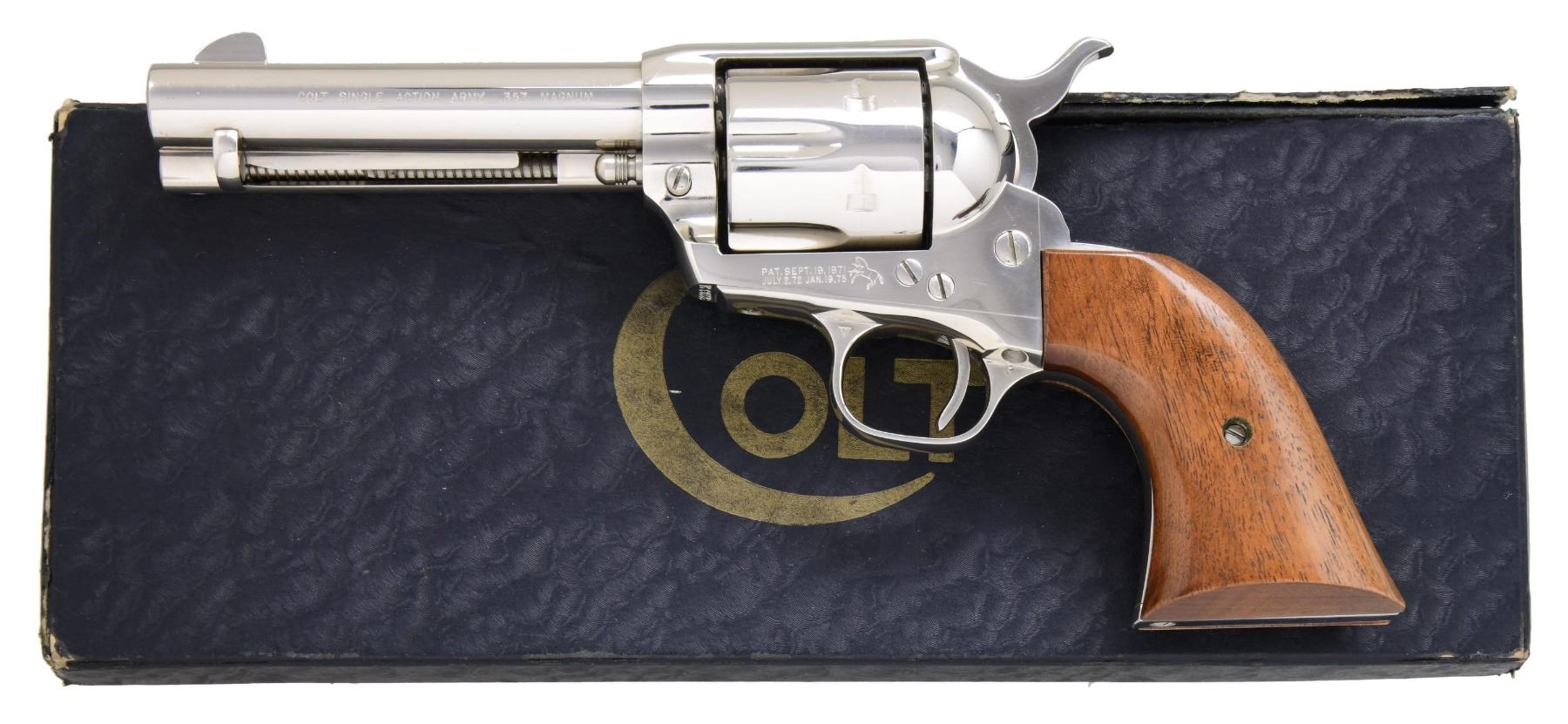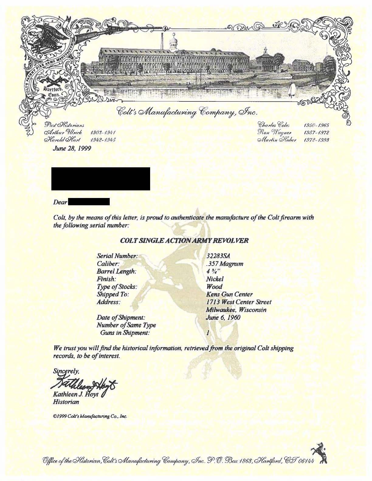 Cal. 357 Mag. S# 32283SA. Bbl. 4 3/4". Six shot fluted cyl. Full nickel finish. 2 piece wooden grips. Mfg. 1960. UNATTACHED ACCESSORIES: letter from Colt Manufacturing Company, Inc detailing the following information, "Serial Number: 32283SA / Caliber: .357 Magnum / Barrel Length: 4 3/4" / Finish: Nickel / Type of Stocks: Wood / Shipped To: Kens Gun Center / Address: 1713 West Center Street Milwaukee, Wisconsin / Date of Shipment: June 6, 1960 / Number of Same Type Guns in Shipment: 1". Includes 1 piece black box w/ matching red label having serial number in red pencil on box bottom. Box contains instructions, handling the handgun brochure & warranty card. Box lid has torn corners & tattered edges. CONDITION: near new showing a faint cyl. drag line & small scratches. Bright new excellent bore. PROVENANCE: From the lifelong Collection of Jim Williams. (24-2652/DS). CURIO. $2,500-3,750.