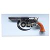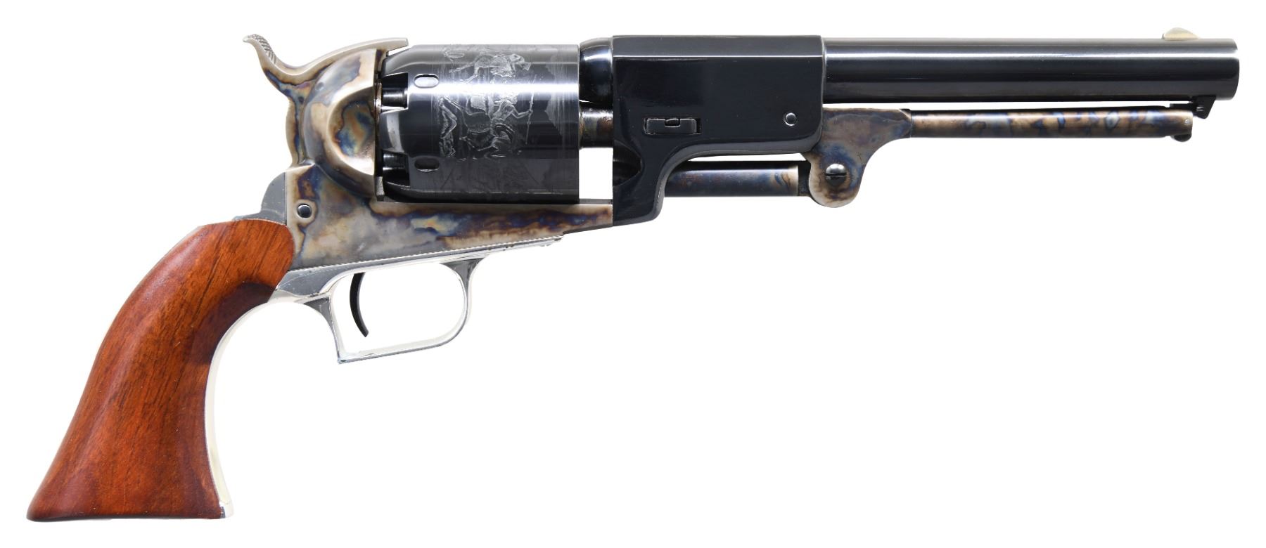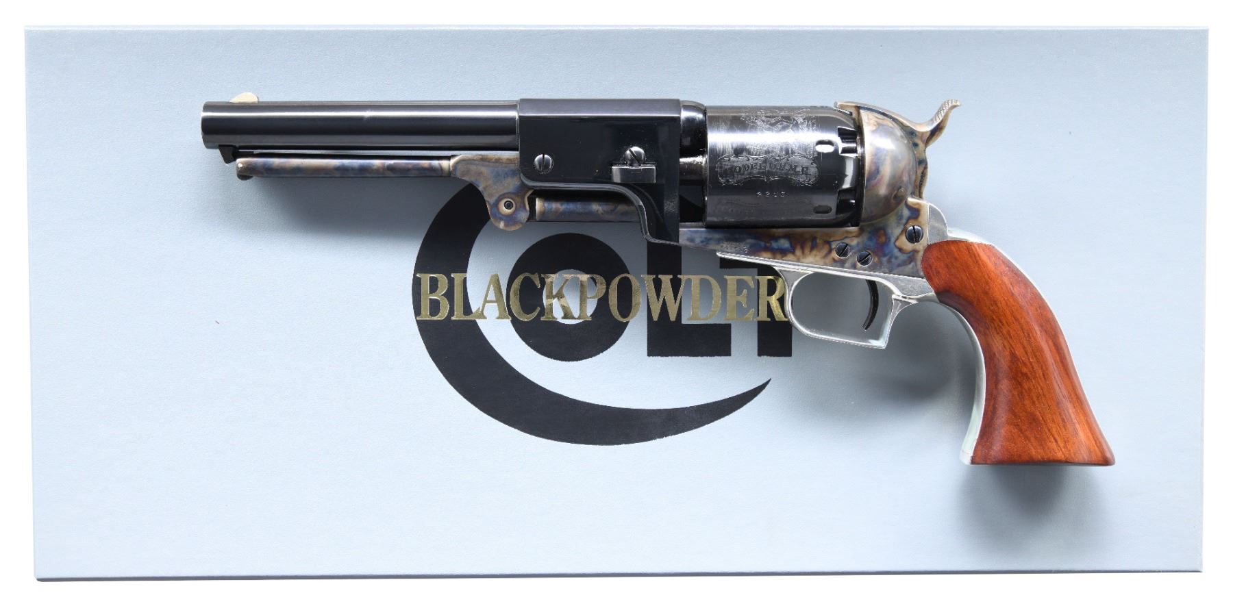 REVOLVER. Cal. 44. S#. 1221C. bbl. 7-1/2". 6 shot round cyl. w/ Texas Ranger scene roll engraving. Case colored frame, loading lever & hammer. Silver finished backstrap & square back trigger guard. 1 piece walnut grip. UNATTACHED ACCESSORIES: 1 piece gray box w/ over box. CONDITION: as new in box. (01-25869/DS). ANTIQUE. $600-900.