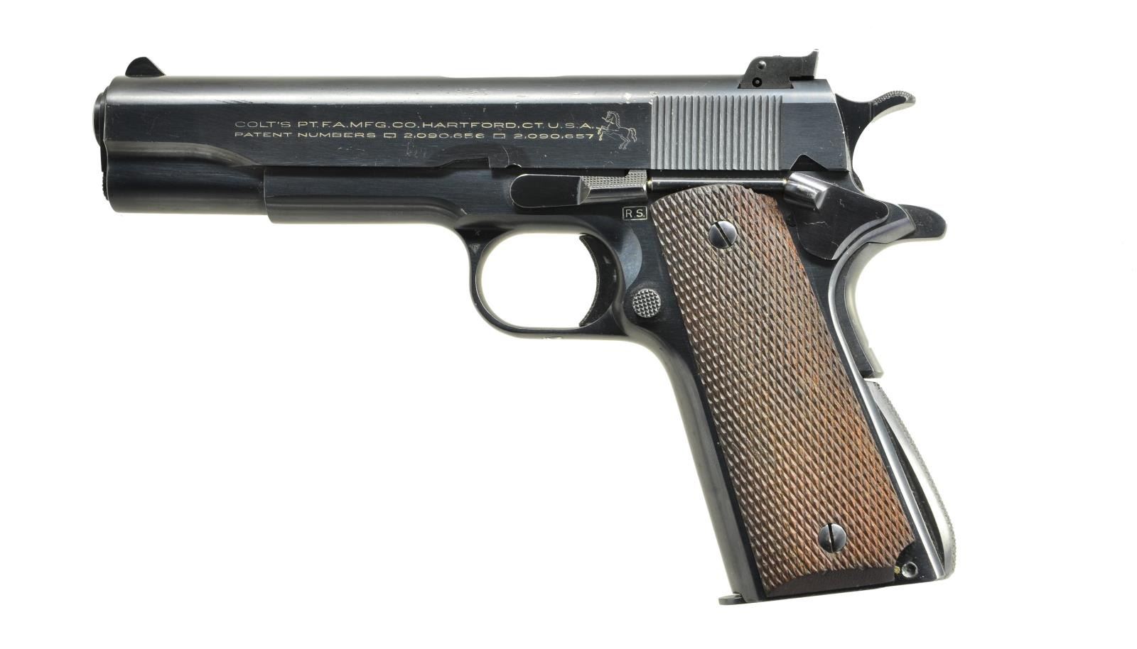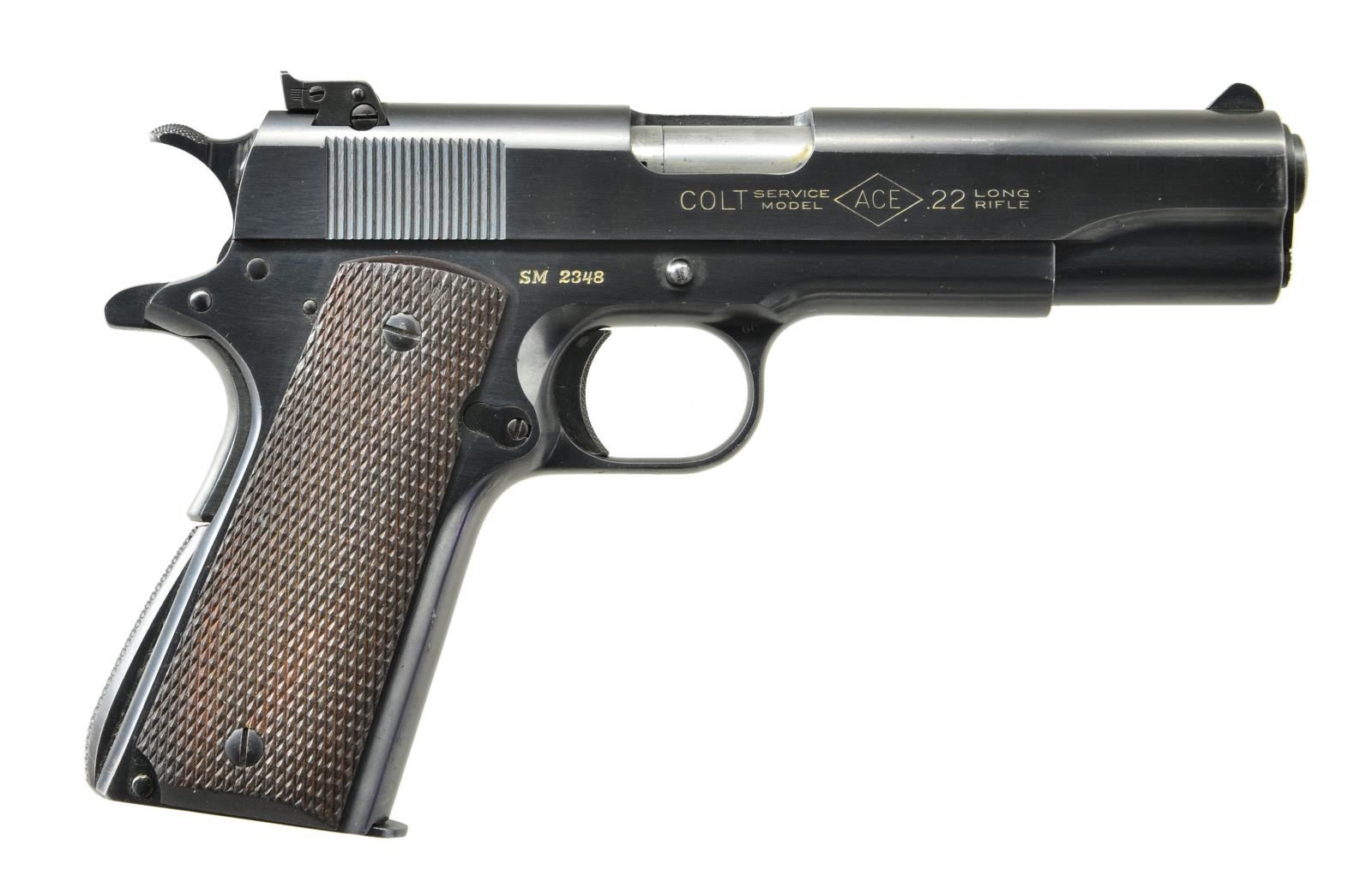Cal. 22 LR. S# SM 2348. Bbl. 5". Mfg. 1941 w/ boxed RS inspector mark. Per Harrison's reference book on "U.S. Pistols and Revolvers", all aspects are correct for model. Fully checkered walnut grips. Checkered Type 3 arched mainspring housing properly w/out lanyard loop. Used as military training aid having floating chamber bbl. to increase recoil approximating that of main 45 ACP cal. Proper commercial blued finish. Micrometer Stevens rear sight & proper taller than normal serrated blade front. Wide spur Type D hammer & short milled trigger having checkered face. Left trigger guard bow w/ VP proof & X; right side numbered 60 matching numbered slide. 11,961 Aces mfg. between 1935 & September 1945. MAGS: 1 two toned 10 rd. "SERVICE MODEL" marked "ACE" mag. w/ pinned base & early steel follower. Near excellent appearance in all respects. CONDITION: occasional sm. mark due to handling or functioning appearing mainly on curved portion of slide between cocking grooves & front of ejection port plus frontstrap; overall close to near excellent collector quality. Near excellent bore & very good to excellent grips w/ faint rub mark at top of right. (22-1109/NW). CURIO. $4,000-6,000.