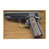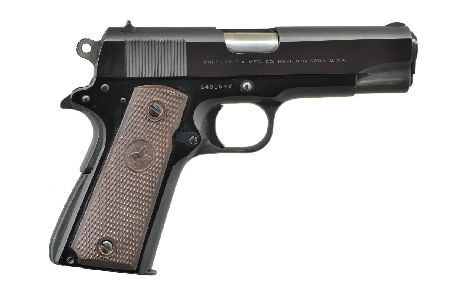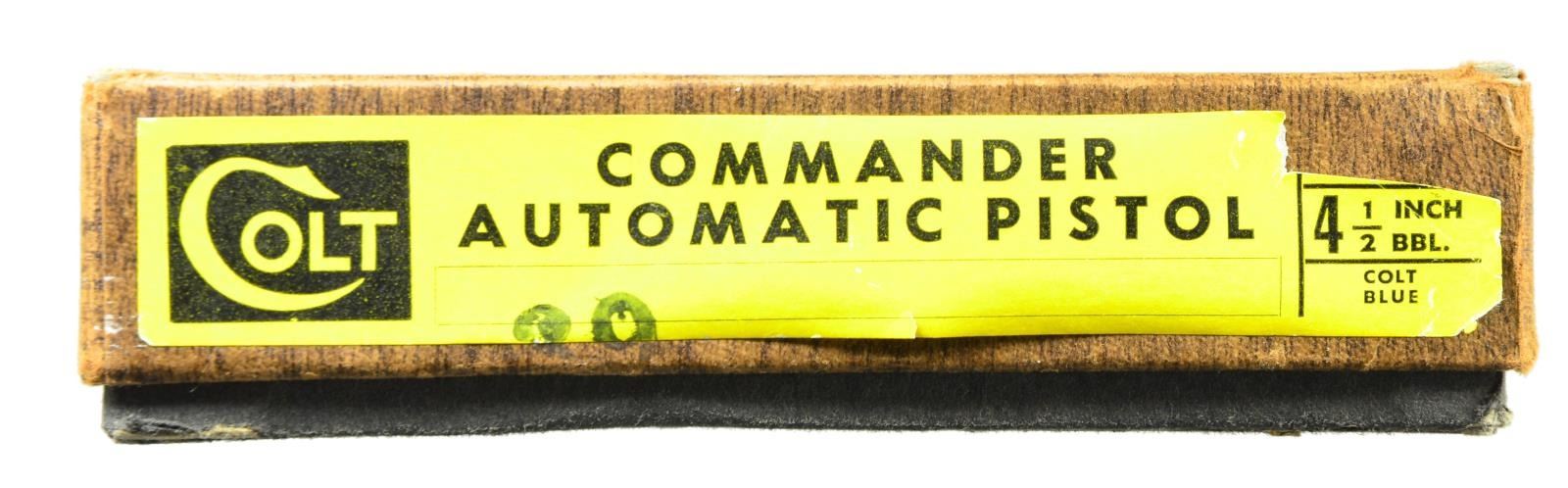Cal. 45 ACP. S# 54916-LW. Bbl. 4 1/4" marked "COLT 45 AUTO". Mfg. 1968 (1950-1969) w/ alloy frame & alloy grooved arched mainspring housing plus characteristic Commander ring hammer. Short grooved steel trigger & short grip safety. Brown border checkered lg. ring rampant Colt logo hollow backed grips. Serrated faced front sight & windage adj. dovetailed rear. "0" assembly mark on right front trigger guard bow. MAGS: very good all blued 7 rd. w/ light insertion wear. Matte Colt marked base w/ rampant Colt image. UNATTACHED ACCESSORIES: good 2 piece wood grained box numbered "CLW004033" plus label indicating 4 1/2" bbl. CONDITION: very slight function wear on lower front matte finished portion of slide plus very faint spots of staining on sides of hammer. Slight space above each lower grip screw & below each upper screw resulting in oval appearance to screw openings. All other aspects near excellent in appearance including bore. (22-1200/NW). CURIO. $2,250-3,250.