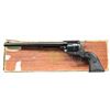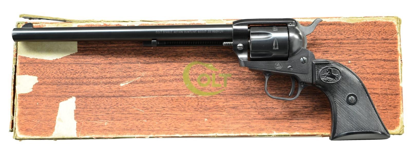 Cal. 22 Mag. S# 89261F. Bbl. 9 1/2" w/ blade sight. Six shot fluted cyl. Alloy frame & grip straps. Two piece checkered plastic rampant colt grips. Mfg. 1959. UNATTACHED ACCESSORIES: two piece wood grain box w/ proper label & S# on bottom. Box is tattered w/ torn edges & tape damage. CONDITION: very fine, retaining over 98% original finish. Bright near excellent bore. (22-1095/DS). CURIO. $800-1,200.