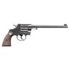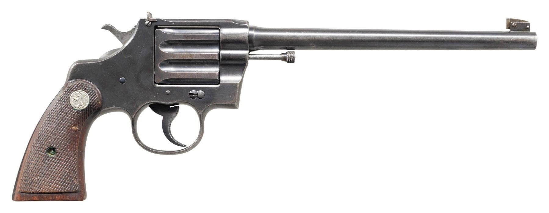 TARGET PISTOL. Cal. 22 LR. S# 1247. Bbl. 8 1/4". Camp Perry single action only single shot target pistol mfg. by Colt in 1929. Left side of the bbl. is marked "CAL.22 LONG RIFLE", with Colt's 2-line mfg. and patent information marked across the top. Left side of the frame is marked with the Rampant Colt logo, with "CAMP PERRY MODEL" marked on the left side of the breechblock. Metal components exhibit a blue finish overall, save for on the sides of the hammer, which are polished in-the-white. Frame is mounted with 2-piece Colt silver medallion checkered wood grips. Pinned blade front sight with adj. square notch rear sight. Knurled backstrap and trigger. Matching S# "1427" is present on the frame (left side, beneath grip panel) and on the cyl. crane. CONDITION: metal components retain large amounts of their original factory blue finish, exhibiting areas of wear and thinning that have faded to gray patina, scattered superficial handling marks, as well as scattered spots of light to mild surface oxidation overall. Sides of hammer exhibit light pitting and age related discoloration. Bright bore, exhibiting light pitting, while retaining well defined rifling throughout. Proper manual mechanics. Grips show mild to moderate smoothing and some scattered superficial marks and impressions, but otherwise remain sound. (25-5364/MLW). CURIO. $1,200-1,800.