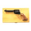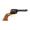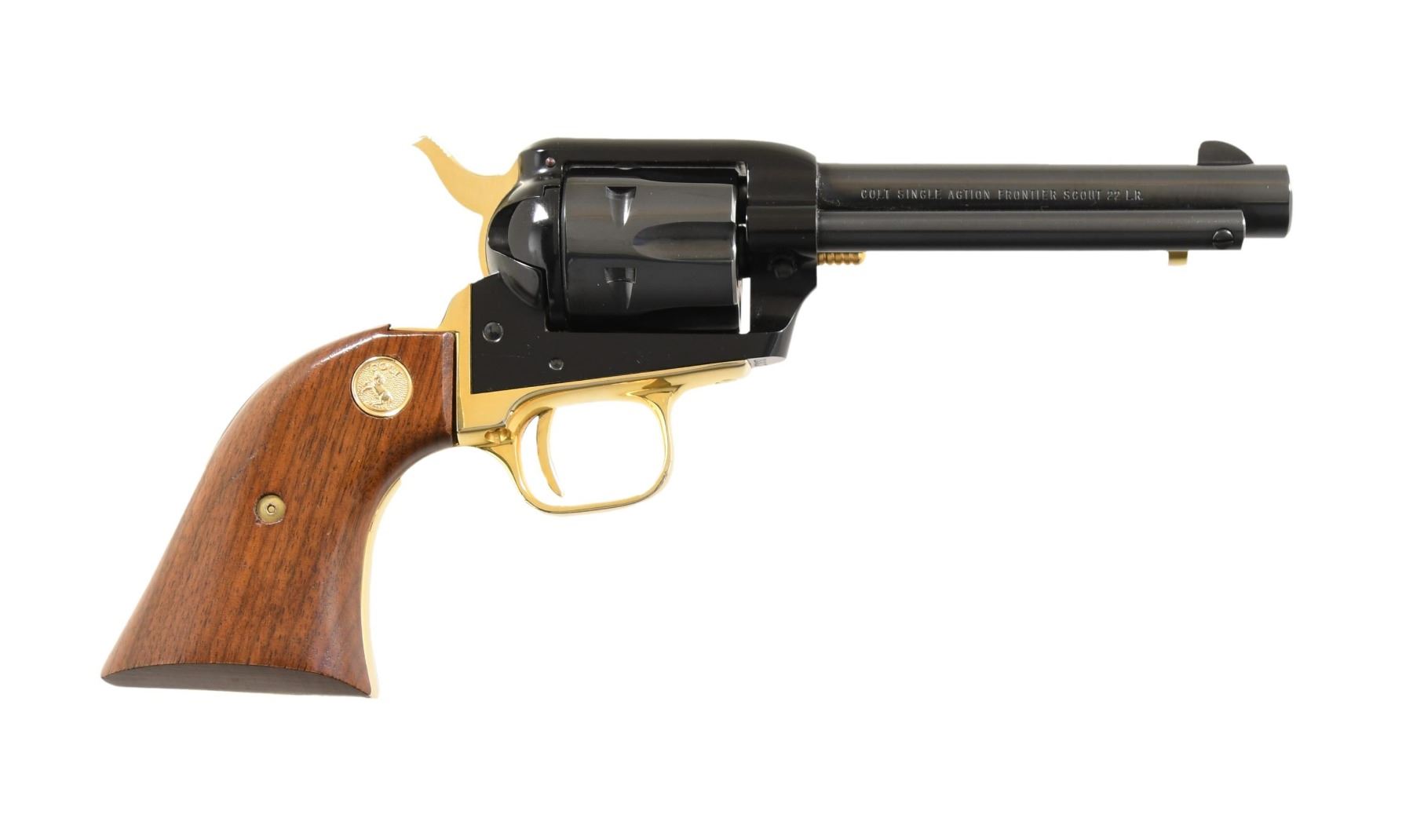 SCOUT REVOLVER. Cal. 22 LR. S# 263CT. Bbl. 4 3/4" with blade sight; frame notched rear sight. Mfg. 1963 to celebrate Carolina's Charter Tercentenary Centennial; only 300 units with serial numbers beginning with 001CT. All blued except for gold plated grip frame and its attachment screws, ejector rod head, trigger, hammer and base pin plus gold filled commemorative barrel markings. Fluted cylinder plus smooth varnished walnut grips with gold Colt medallions. Scroll engraving on butt. UNATTACHED ACCESSORIES: Colt branded light colored wooden presentation case with light blue outlined corduroy base and gold satin with dark blue rampant Colt symbol under lid. CONDITION: all aspects near excellent appearing new and unfired. (24-4773/NW). CURIO. $500-750.