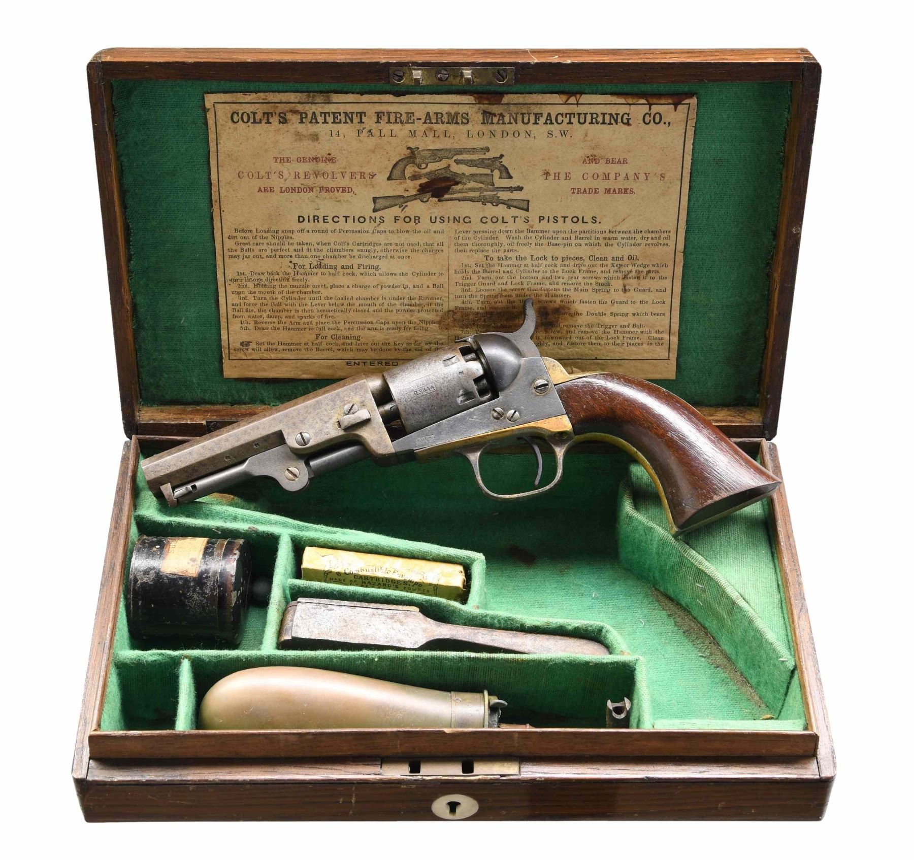 Cal. 31. S# 223444. Bbl. 4" octagon w/ New York address & bead sight. Six shot round cyl. w/ stagecoach scene roll engraving. Original finish was blue & case colored w/ silver finished brass backstrap & large style brass trigger guard. 1 piece walnut grips. Bbl. & cyl. have Birmingham proofs. Bbl., frame, cyl., grip straps & wedge have matching numbers. Mfg. 1863 during the American Civil War. UNATTACHED ACCESSORIES: period wooden casing w/ green cloth fitted interior. Case lid has an unmarked round brass medallion. Lid interior has a Colt label w/ directions for use of Colt pistols. Case contains powder flask, 2 cavity mold, partially full cap tin, nipple wrench, 1 package of Hazard's combustible envelope cartridges, case key & 3 round balls. CONDITION: metal finish has faded to a smooth mottled gray-brown showing spots of very light pitting. Trigger guard retains 20% silver finish. Grips have original finish showing wear spots & handling marks. Cyl. does not hold securely in full cock position. Bore retains good rifling showing scattered spots of light pitting. PROVENANCE: From the Collection of a Tennessee Gentleman. (01-25643/DS). ANTIQUE. $2,000-3,000.