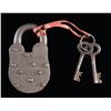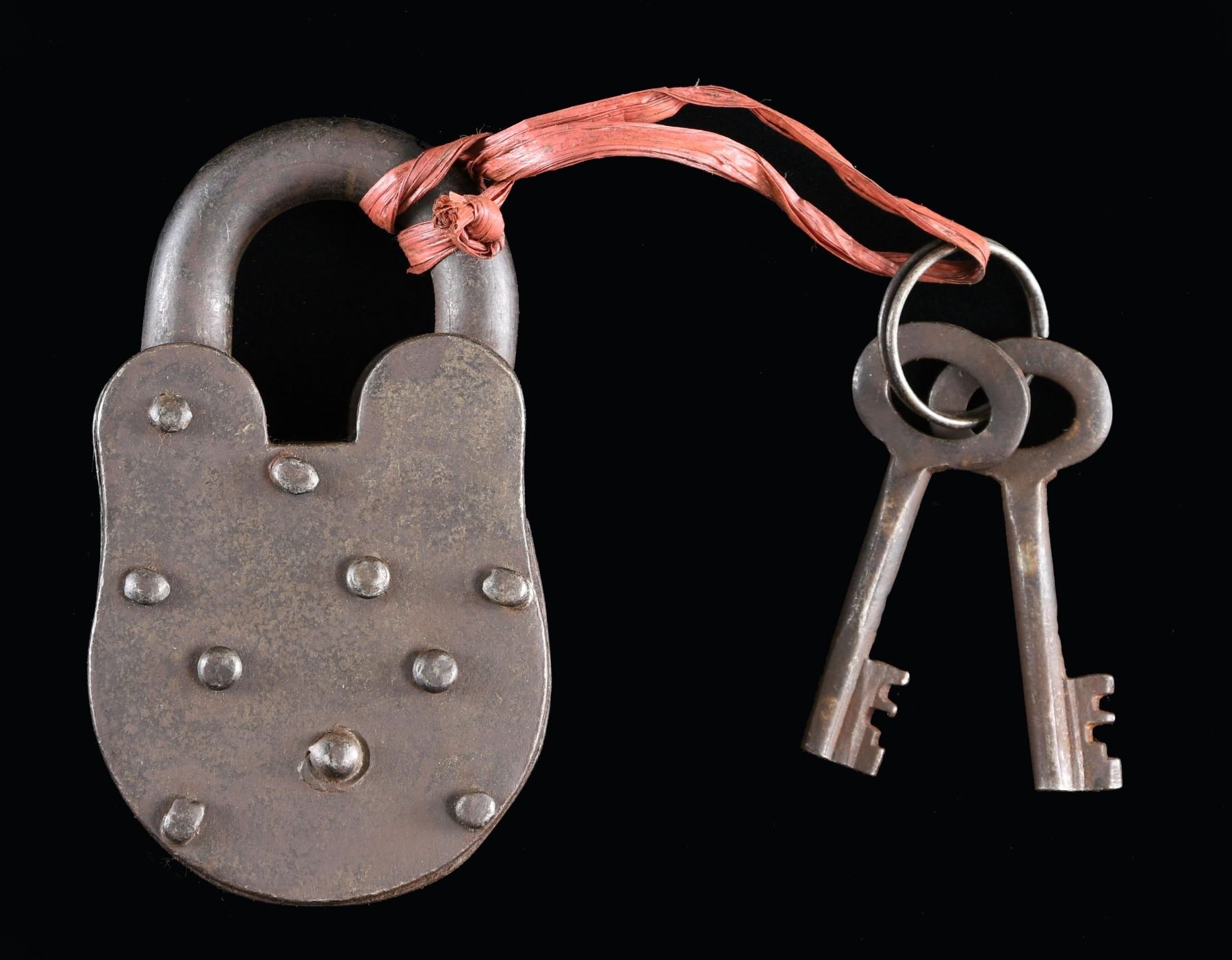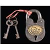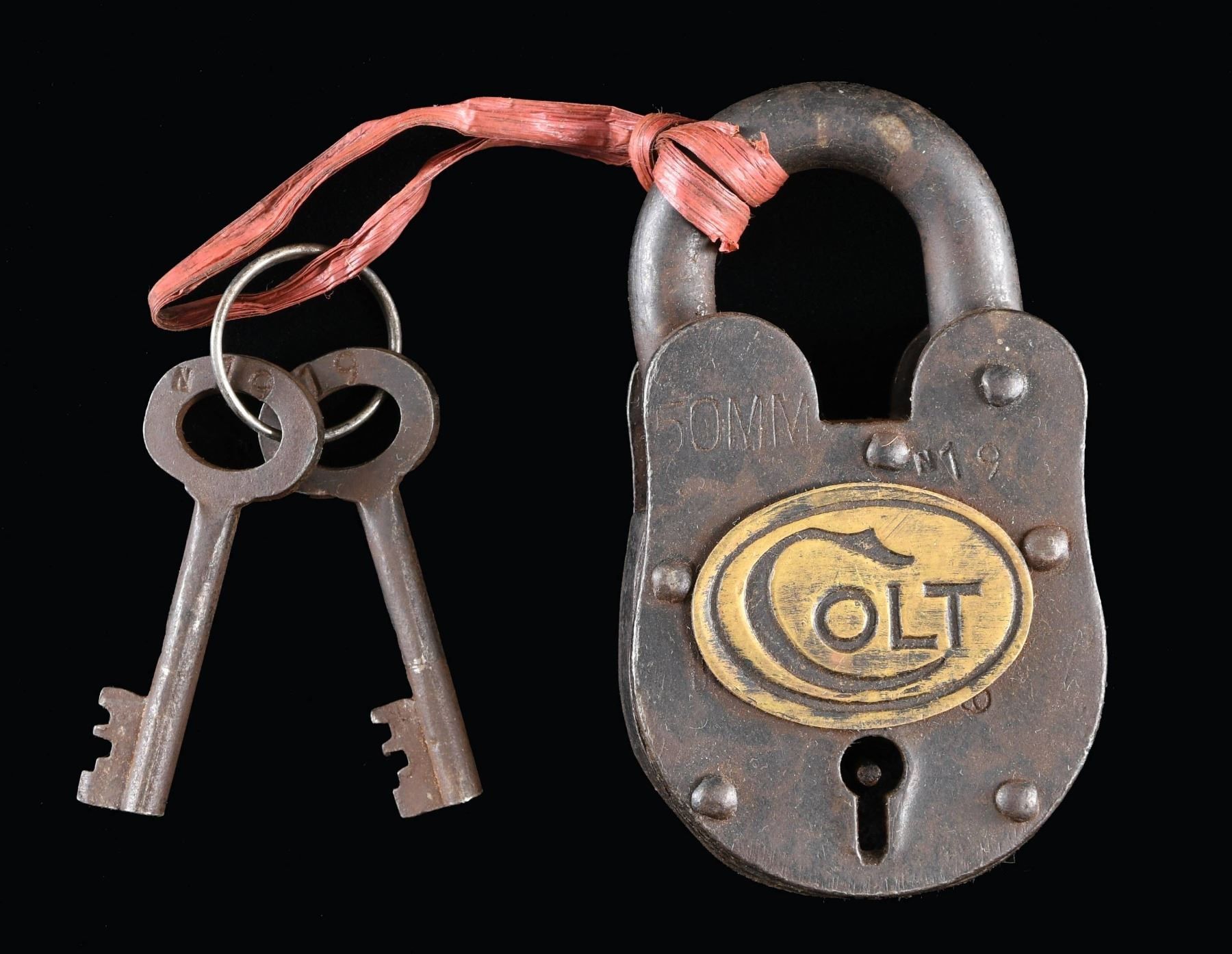 Overall: 3.75". Marked "50MM" & "N19". Front of lock has brass "COLT" plaque. Comes with 2 keys. CONDITION: lock in good intact condition with light oxidation. Lock appears functional. (02-24553/MD). $150-250.