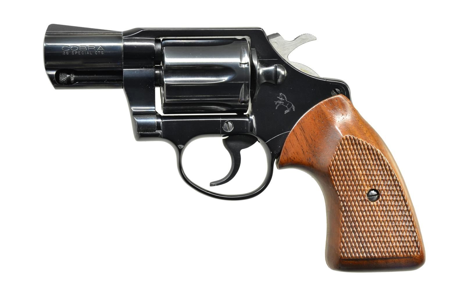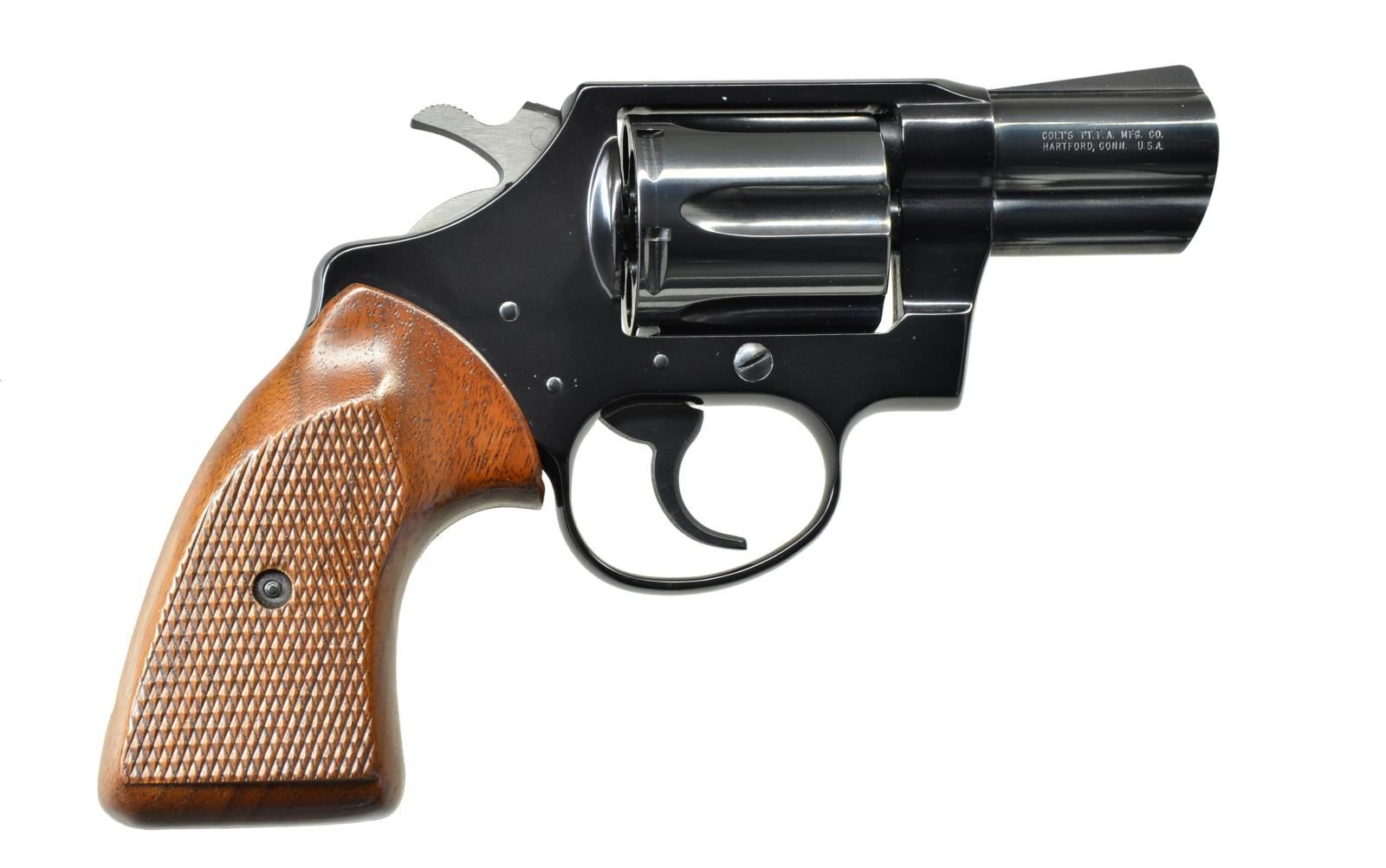 Cal. 38 Spl. S# C70912 . Bbl. 2" w/ shrouded ejector rod & serrated ramped blade sight; serrated notched top strap. Mfg. 1973 (1973-1981); blued w/ black alloy D frame having checkered walnut oversized grips extending below frame; no medallions. Smooth faced blued trigger & grooved hammer w/ polished sides. Basically, Detective Special w/ alloy frame. CONDITION: all aspects near excellent; appears new & unfired. (22-39/NW). MODERN. $800-1,200.