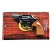 Cal. 38 Spl. S# M61513 (1975). Bbl. 2 1/8" w/ open sights. 6 Shot fluted cyl. Blued finish; markings have added white highlight. 2 Piece checkered bordered walnut grips. UNATTACHED ACCESSORIES: Colt style wood grain box w/ missing end label. Box contains styrofoam inserts, paperwork & 2 piece laminated wood grips w/ gold Colt medallions. Box in fair condition showing wear, tears, tape repairs & detached side flap. CONDITION: Near excellent metal finish w/ light marks & cyl. turn line. Near excellent grips. Near excellent bore. (23-807/MD). MODERN. $700-1,000.
