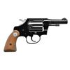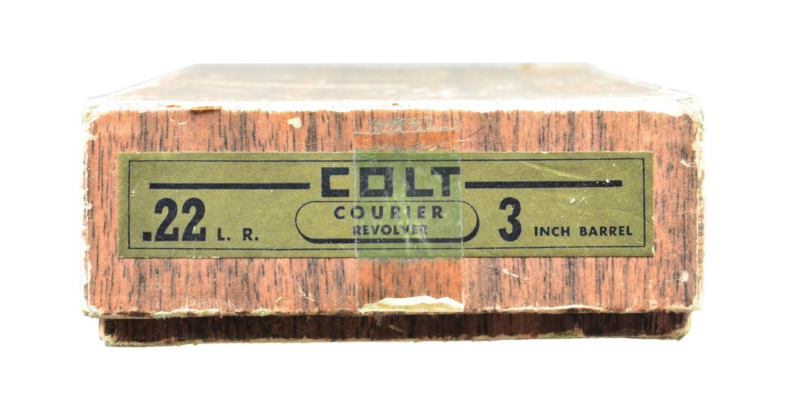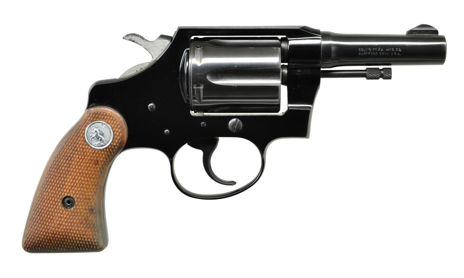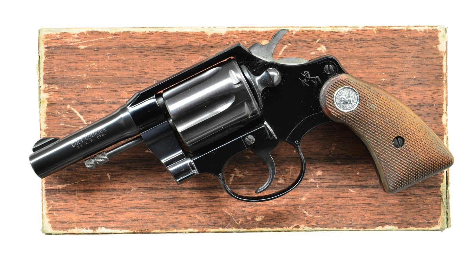 Cal. 22 LR. S# 55900. Bbl. 3" rnd. w/ serrated ramp front sight. Six shot fluted cyl. Alloy frame. Blue / black finish, hammer has polished sides. Two piece checkered walnut rnd. butt grips w/ silver rampant colt medallions. Approx. 3,053 mfg. 1953-1956. UNATTACHED ACCESSORIES: two piece wood grain box w/ proper label & S# on bottom. CONDITION: very fine w/ over 98% original finish showing slight muzzle wear, sm. scratch on sideplate & spots of tarnish on hammer sides. Bore is near excellent. (22-1104/DS). CURIO. $1,500-2,000.