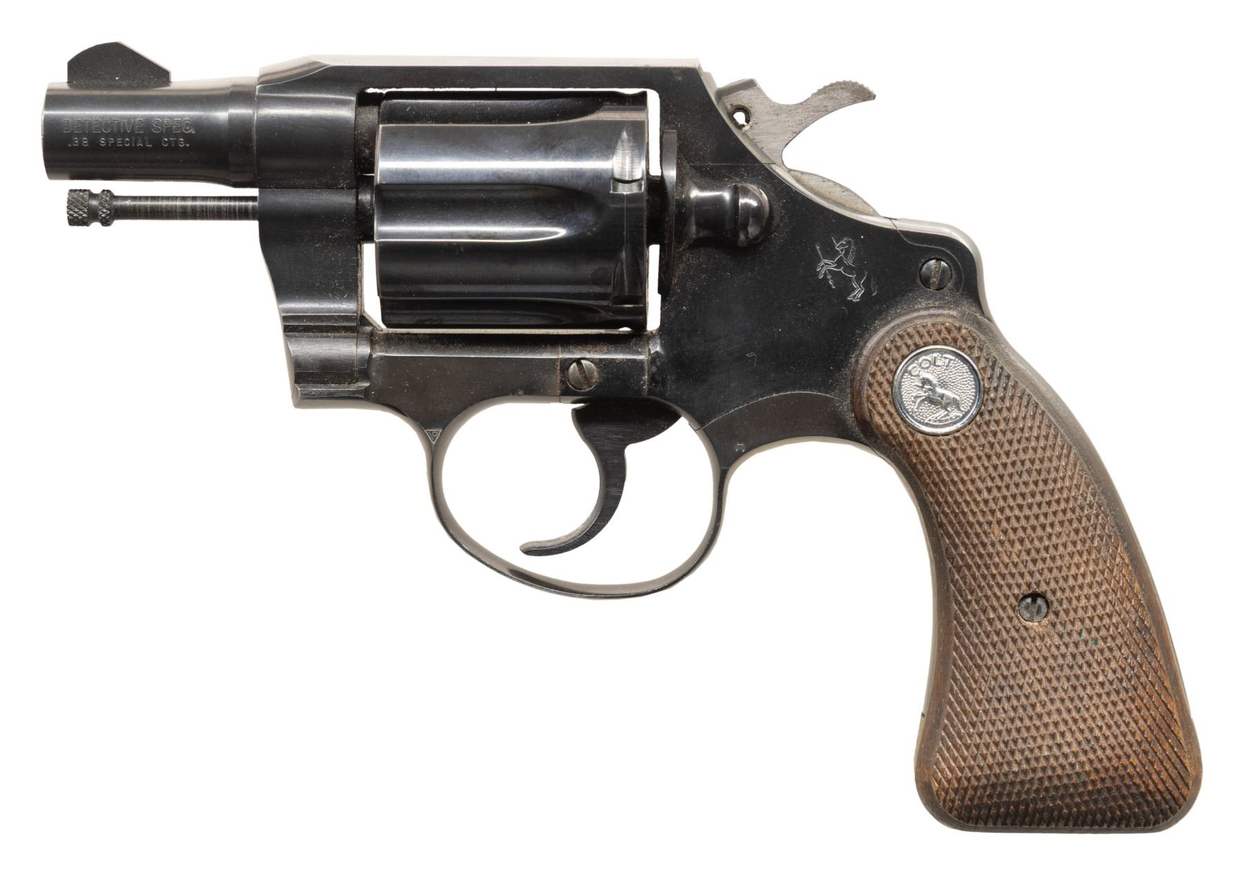 Cal. 38 Spl. S# 909980. Bbl. 2". Serrated blade front sight. Fixed rear sight. 6-shot cyl. 1966 made Detective Special. Blued finish. Checkered hardwood grips with silver Rampant Colt medallions. CONDITION: grips show scattered checkering wear, handling marks & some black staining. Metal retains 90% blue with a notable brown area on cyl, some handling marks & light oxidation. Action functions properly when hand cycled. Bright near excellent bore. (25-6539/MJC). CURIO. $350-550.
