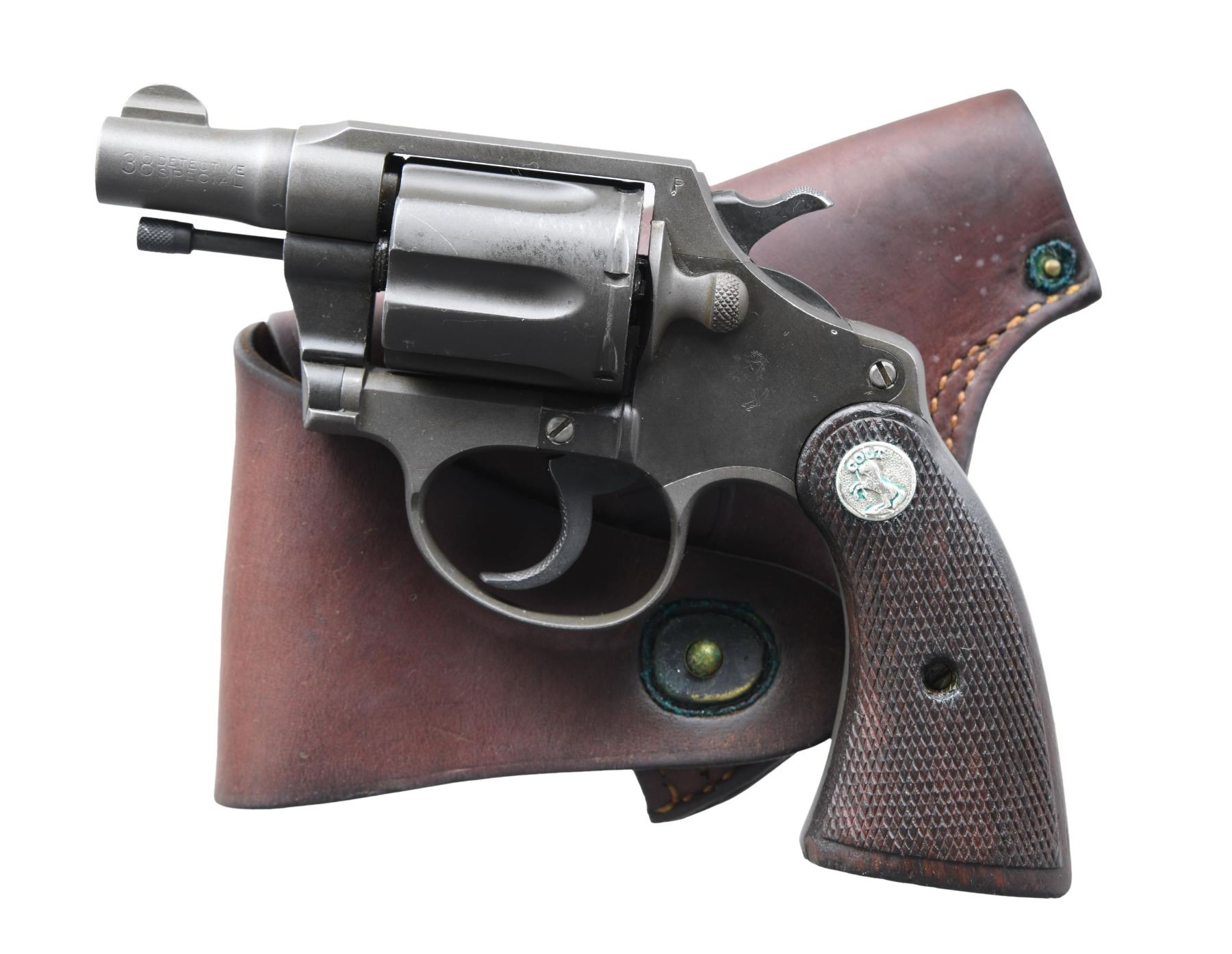 U.S. HOLSTER. Cal. 38 Spl. S# 480023. Bbl. 2". Detective Special double action revolver mfg. by Colt in 1945. The left side of the bbl. is marked "38", followed by "DETECTIVE/ SPECIAL", with Colt's mfg. and patent information marked on the right. Left side of the frame is marked with the Rampant Colt logo. Left side of frame is stamped with a "P" over the cyl., latch, with "US" crudely stamped on the rear grip strap. Both proofs appear spurious, as records indicate that the final shipments of Detective Special revolvers to the U.S. government and military were received in 1944. Metal components exhibit a reapplied parkerized finish overall. Frame is mounted with 2-piece Colt silver medallion checkered wood grips. Half-moon blade front sight, with frame notched rear sight. UNATTACHED ACCESSORIES: U.S. marked Boyt 1943 dated brown leather holster. CONDITION: very good, with metal components retaining bountiful amounts of their reapplied parkerized finish overall, exhibiting some areas of pitting beneath the finish. Bright bore, exhibiting scattered areas of dark pitting, while retaining strong rifling throughout. Grips are good, showing smoothing, with scattered marks and impressions from handling and storage. Holster remains malleable, exhibiting wear overall. (24-6867/MLW). CURIO. $400-600.