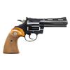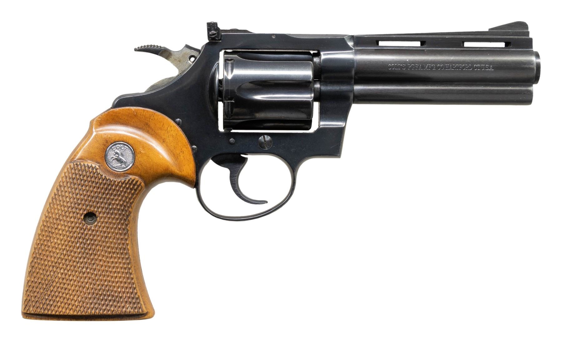 Cal. 38 Spl. S# D17598. Bbl. 4". Diamondback double action revolver mfg. by Colt circa. 1968. Left side of the bbl. is marked with the model and cal. designations, with Colt's single line address marked on the right. Left side of the frame is marked with the Rampant Colt logo. Metal components exhibit a blue finish overall, save for on the top strap of the bbl. and frame, which exhibit a matte blue finish. Sides of hammer are polished in-the-white. Frame is mounted with 2-piece Colt silver medallion checkered wood grips. Blade front sight with adj. square notch rear sight. CONDITION: metal components retain the majority of their original factory blue finish, showing some spots of wear and thinning that are fading to gray patina, with some scattered spots of light to mild pitting. Mirror bore, retaining well defined rifling throughout. Proper manual mechanics. Grips show light smoothing and some scattered nicks to the diamonds, but otherwise remain sound. (25-5365/MLW). CURIO. $800-1,200.