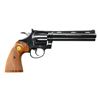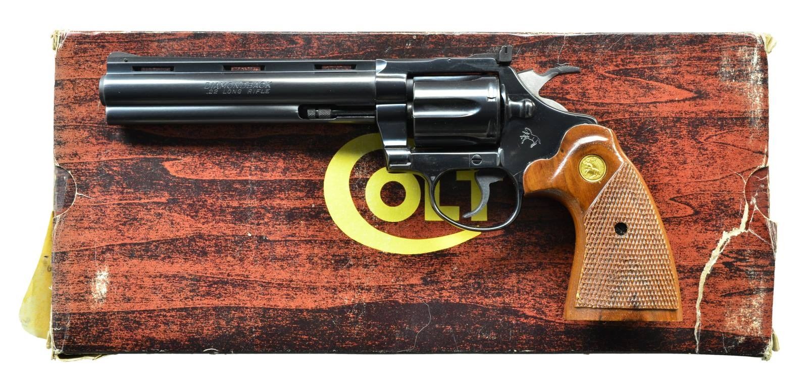 Cal. 22 LR. S# P79351. Bbl. 6" VR w/ serrated ramped blade plus Accro rear. Mfg. 1984 (1966-1991) w/ blued finish & raised panel checkered walnut target grips having gold Colt medallions. Quality revolver w/ appearance of reduced size Python. UNATTACHED ACCESSORIES: good matching labeled wood grained box w/ styrofoam inserts & packaging. Tear in top corner of box on end opposite label. CONDITION: very minimal traces of firing residue w/ all other aspects being near excellent including bore & grips. (22-155/NW). MODERN. $1,200-1,800.