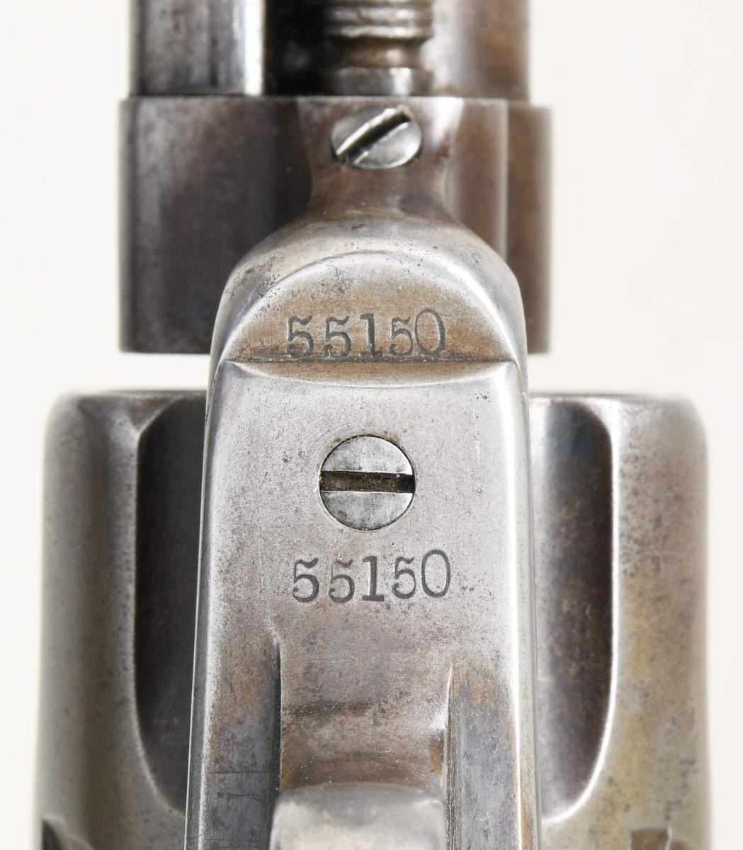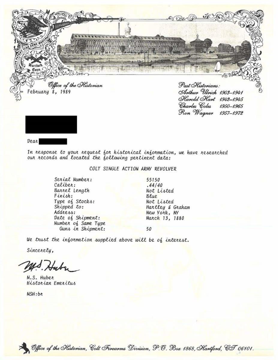 REVOLVER. Cal. 44-40. S# 55150. Bbl. 7 1/2" w/ blade sight. Six shot fluted cyl. Black powder frame. 1 Piece walnut grips. Bbl., frame, cyl. & grip straps have matching numbers. UNATTACHED ACCESSORIES: a Colt Firearms Division letter detailing the following information, "Serial Number: 55150 / Caliber: .44/40 / Barrel Length: Not Listed / Shipped To: Hartley & Graham / Address: New York, NY / Date of Shipment: March 13, 1880 / Number of Same Type Guns in Shipment: 50". CONDITION: metal has gray coloration from touch up finish. Etched panel marking is clearly visible. Grips show heavy wear w/ dents at butt. Action shows wear w/ 3 notches remaining. Lightly pitted bore has worn rifling. (01-24482/DS). ANTIQUE. $2,000-3,000.