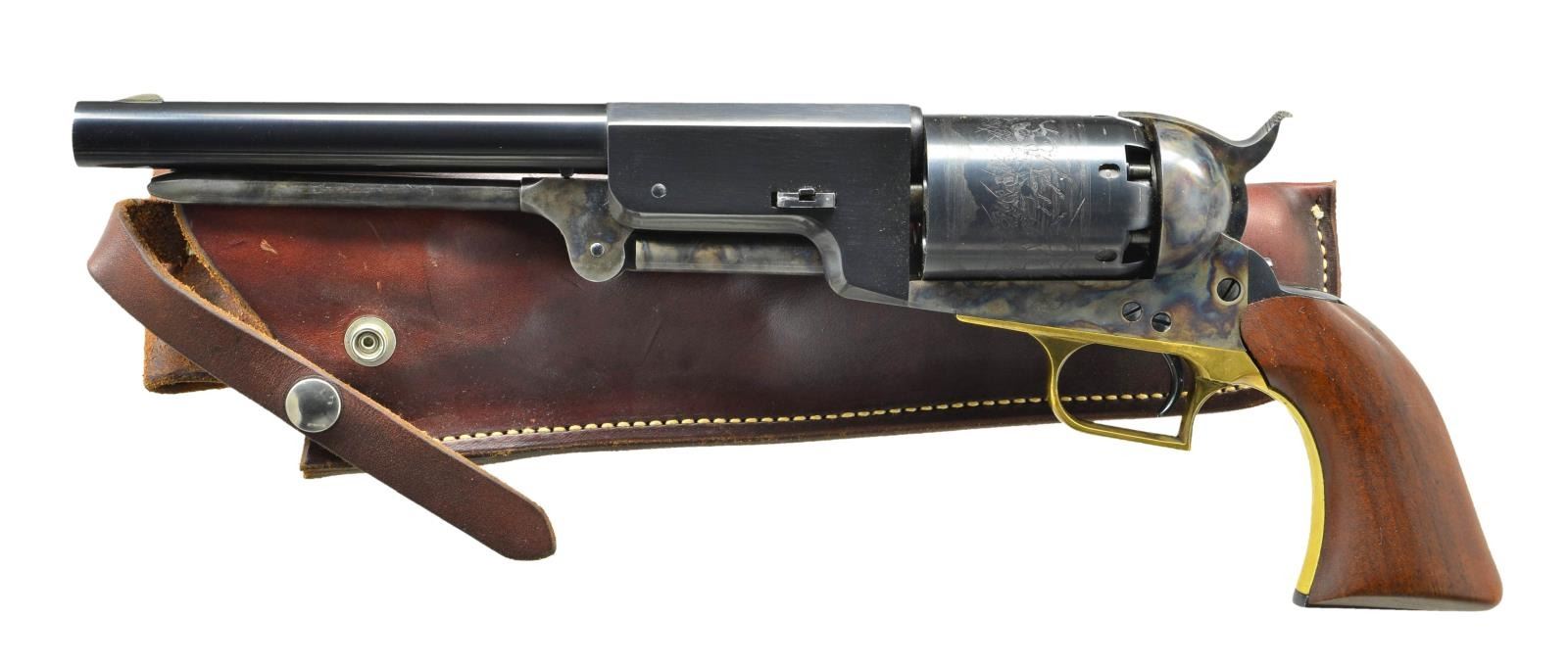 Cal. 44. S# 2338. Bbl. 9" rnd. w/ oct. shank. Top flat marked "ADDRESS. SAMl COLT NEW -YORK CITY". Right flat marked "US / 1847". Six shot rnd. cyl. w/ Texas Ranger scene in roll engraving. Blue finish w/ case colored frame, loading lever & hammer. Brass square backed trigger guard. One piece walnut grip. 2,920 Were mfg in 1980-1982. UNATTACHED ACCESSORIES: Lawrence leather belt holster. CONDITION: near excellent, appears unused, retaining over 98% wood & metal finish. Bright, near excellent bore. (01-20676/DS). ANTIQUE. $500-700.