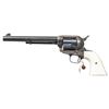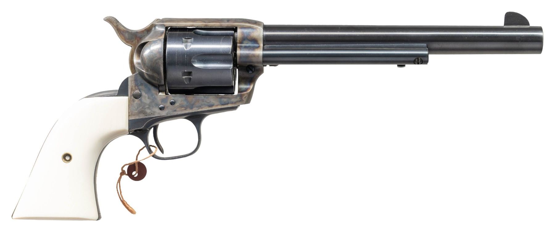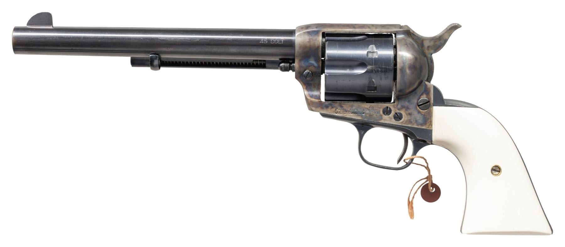 Cal.45 Colt. S#. 348863. Bbl. 7 1/2" with Hartford address. Six shot fluted cyl. Blue & case colored finish. Added two piece ivory grips. Mfg. 1927. CONDITION: over 85% original blue showing light carry & edge wear. Over 75% lightly faded case colors. Very good grips. Sound action. Bright near excellent bore. PROVENANCE: The Esteemed Norm Greenberg Collection. (25-4162/DS). CURIO. $3,000-5,000.