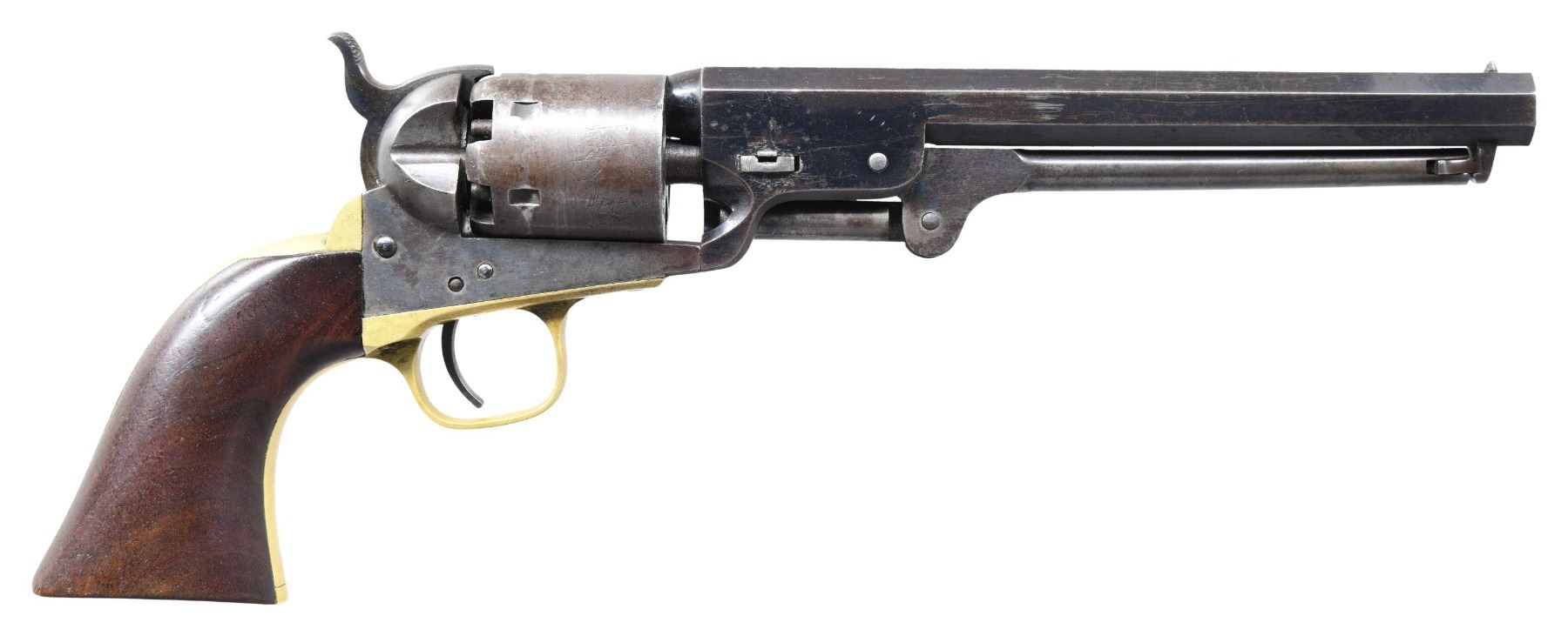 REVOLVER. Cal. 36. S# 140799. Bbl. 7 1/2" octagon with New York address and brass cone style front sight. 6-shot rnd. cyl. with naval engagement scene roll engraving. Blue finished bbl. and cyl. with case colored action, hammer, and loading lever. Silver finished brass grip straps. 1-piece walnut grip. Bbl., bbl. wedge, cyl., frame, grip straps, and loading lever have matching numbers. Mfg. in 1864. CONDITION: bbl. retains 70% dull lightly faded blue showing edge wear, scratches, and marks with small dents in wedge area. Cyl. has faded to gray retaining 70% visible scene. Frame and loading lever retain 20% lightly visible case colors. Sides of hammer have brightly visible case colors. Brass grip straps show a pleasing mild patina with faint traces of silver in protected areas only. Grips show light wear and handling marks. Sound mechanics. Bore is generally bright with strong rifling showing some very light pitting. PROVENANCE: Estate Collection of Nicholas Apergis. (01-27450/DS). ANTIQUE. $3,500-5,500.