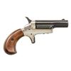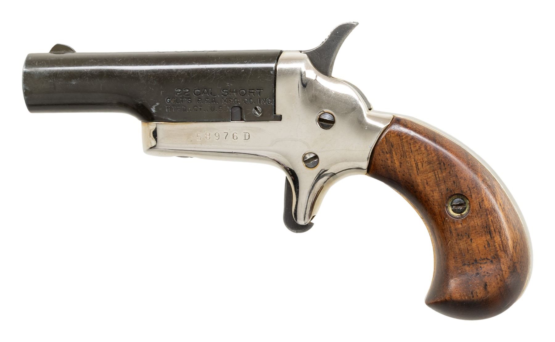 Cal. 22 S. S# 58976D. Bbl. 2 7/16". Fourth Model derringer pistol mfg. by Colt. Let side of the bbl. is marked with the cal. designation above Colt's mfg. information, with "-COLT-" marked across the top. Alloy frame exhibits a nickel plated finish, with the alloy bbl. exhibiting a browned appearance. Steel parts exhibit a blue finish. Frame is mounted with 2-piece plain wood bird's head grips. Blade front sight. CONDITION: frame is excellent, showing some superficial handling marks overall. Bbl. exhibits scattered spots of light to mild wear and thinning that are fading to a dull gray patina. Bright bore, exhibiting a small patch of mild pitting towards the muzzle, while retaining strong rifling throughout. Proper manual mechanics. Grips show a few superficial handling marks, but otherwise remain very good overall. (25-4290/MLW). CURIO. $200-300.