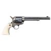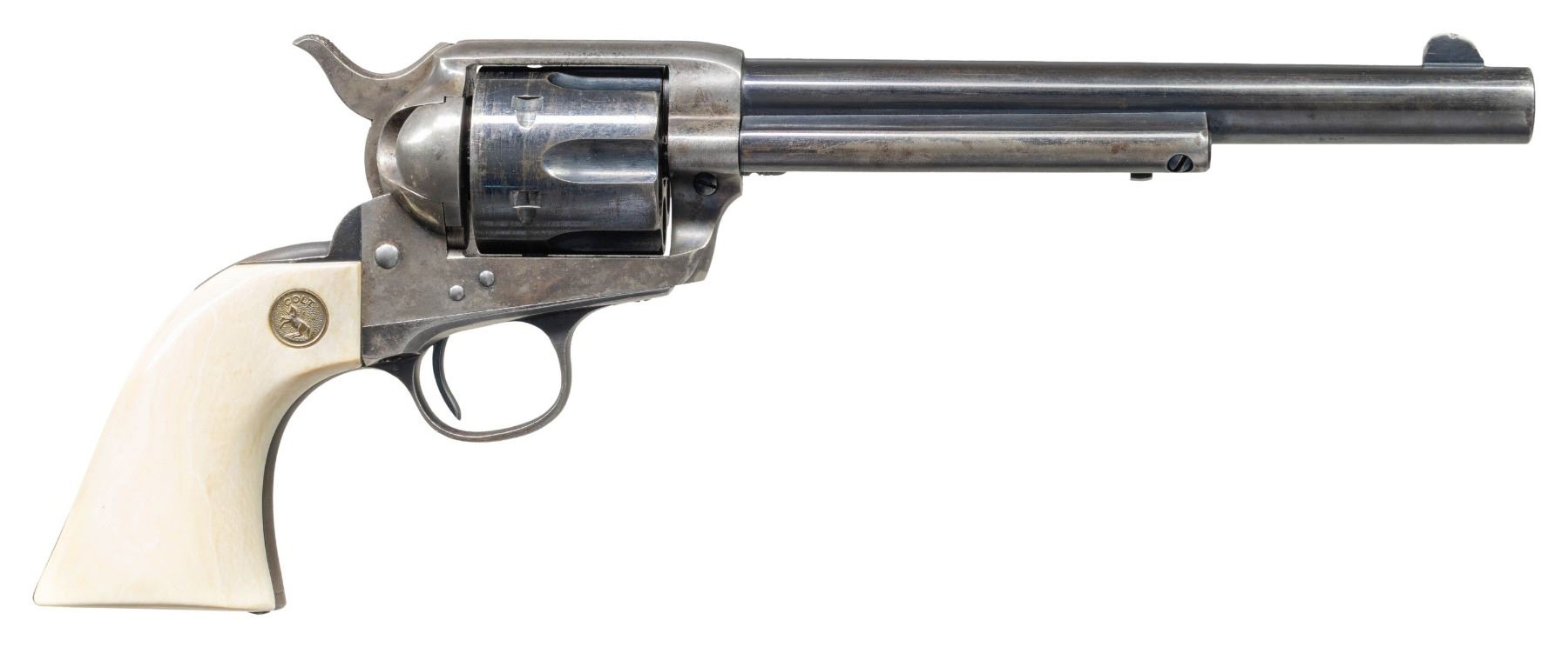 Cal. 44-40. S#. 297847. Bbl. 7 1/2" Six shot fluted cyl. Blue & case colored finish. 1 piece ivory grips with rampant colt medallion. mfg. 1909. CONDITION.: bbl., cyl., & grip straps have over 60% original blue. The frame shows some lightly visible case colors. The front sight has a small dent. Very good grips. The bore shows sound rifling with some very light pitting. PROVENANCE: The Esteemed Norm Greenberg Collection. (25-4122/DS). CURIO. $3,000-5,000.