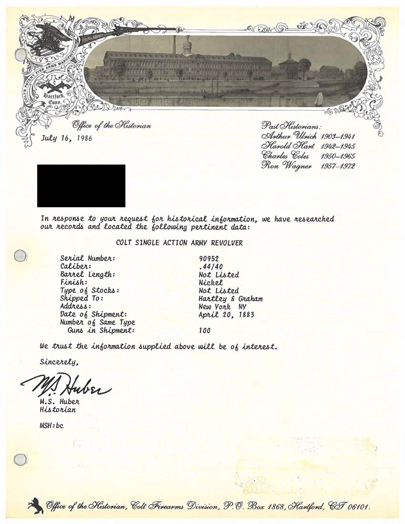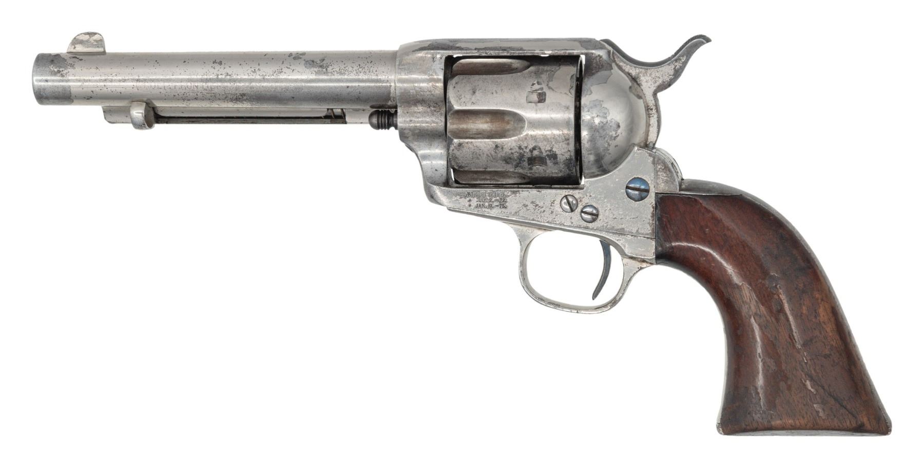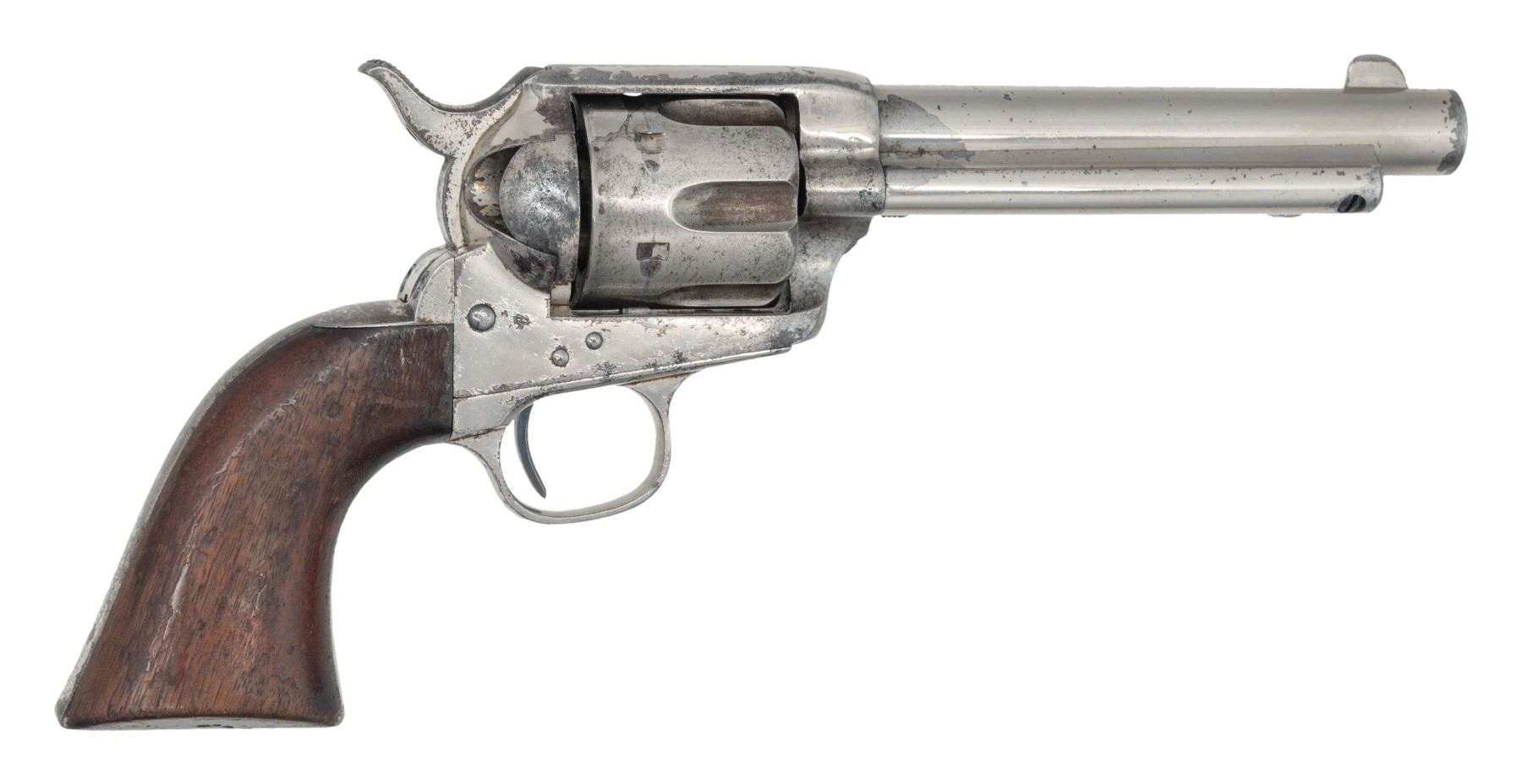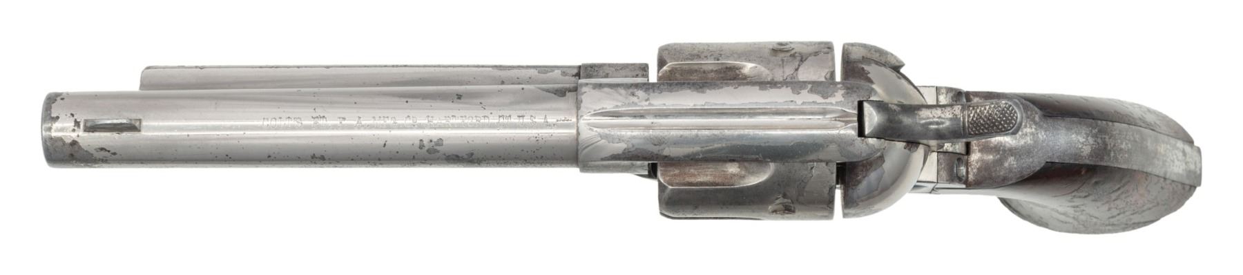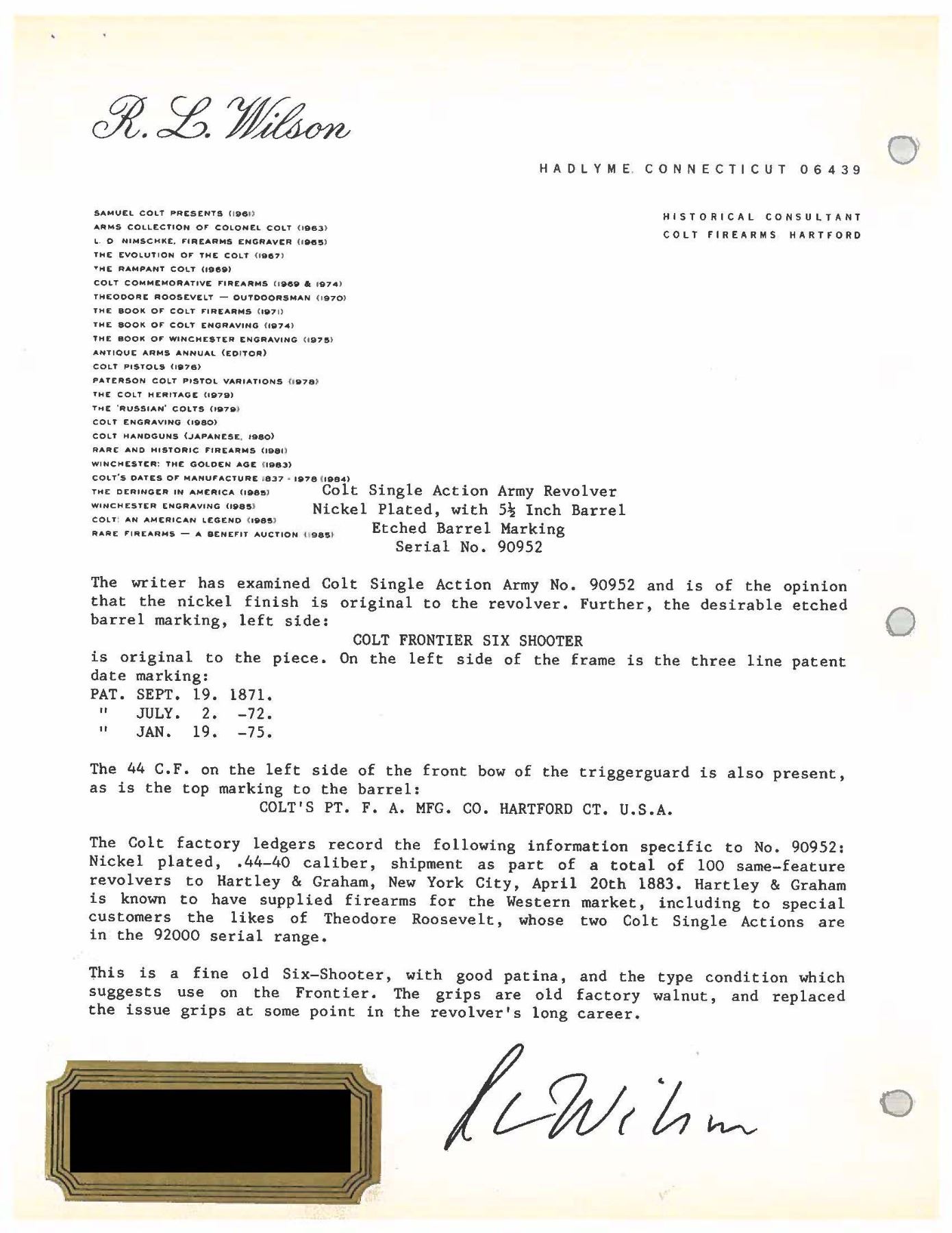 REVOLVER. Cal. 44-40. S# 90952. Bbl. 5 1/2" with etched panel cal. marking. 6-shot fluted cyl. Full nickel finish. 1-piece walnut grip. Black powder frame and grip straps have matching S#s. UNATTACHED ACCESSORIES: Colt factory letter stating: "Serial Number: 90952/ Caliber: .44/40/ Barrel Length: Not Listed/ Finish: Nickel/ Type of Stocks: Not Listed/ Shipped To: Hartley & Graham/ Address: New York NY/ Date of Shipment: April 20, 1883/ Number of Same Type Guns in Shipment: 100". This example is also accompanied by an R.L. Wilson letter detailing the information in the factory letter. CONDITION: 50% nickel finish showing spotted corrosion and very light pitting. Etched panel cal. marking is lightly visible. Grip shows dents and marks with heavy coat of added finish that is largely peeling off. Sound mechanics. Bore has darkened appearance with spots of pitting, retaining intact rifling. PROVENANCE: The Esteemed Norm Greenberg Collection. (01-27689/DS). ANTIQUE. $3,500-5,500.